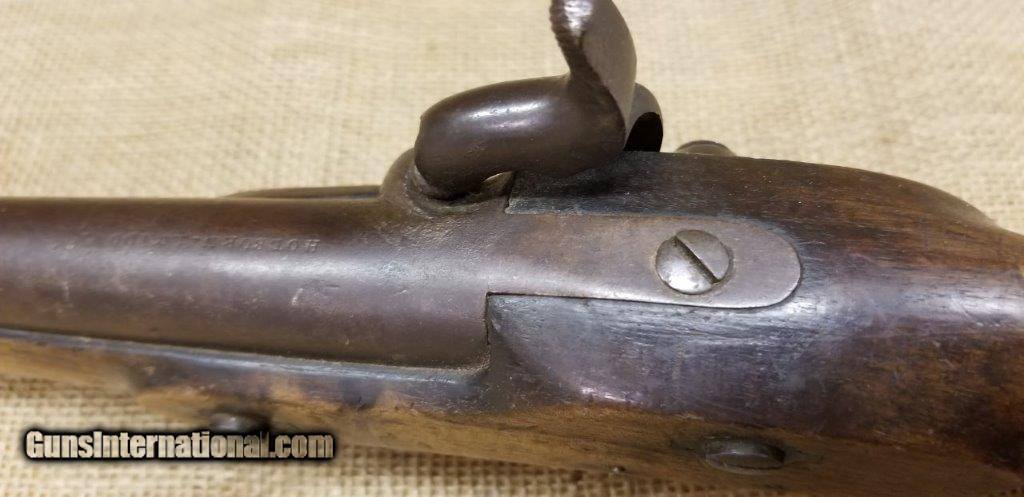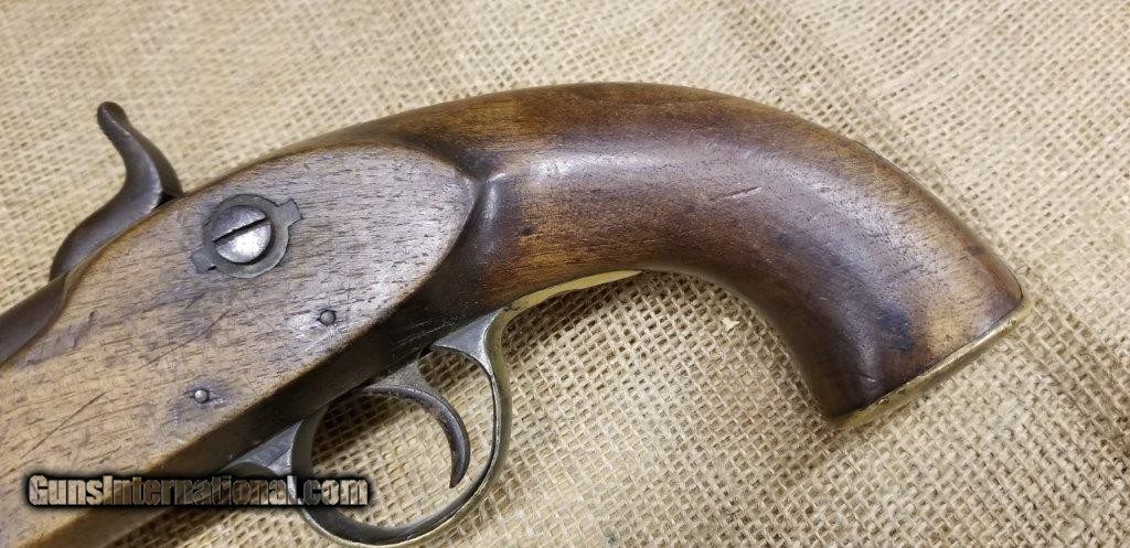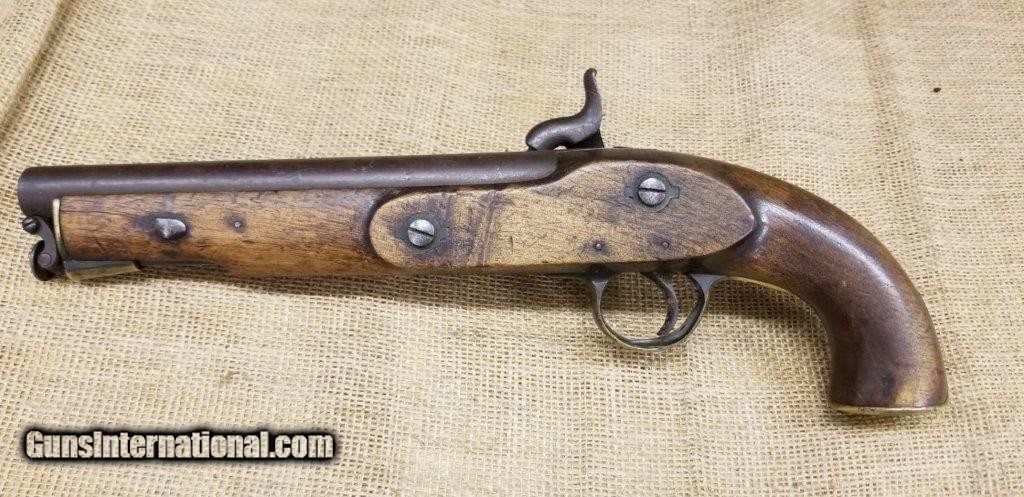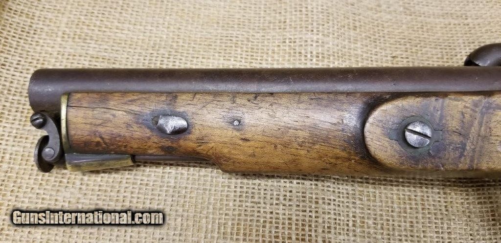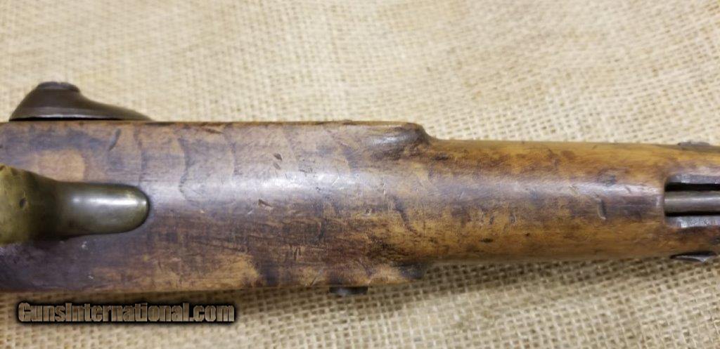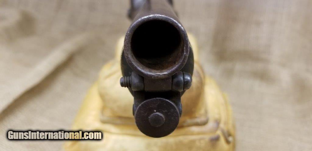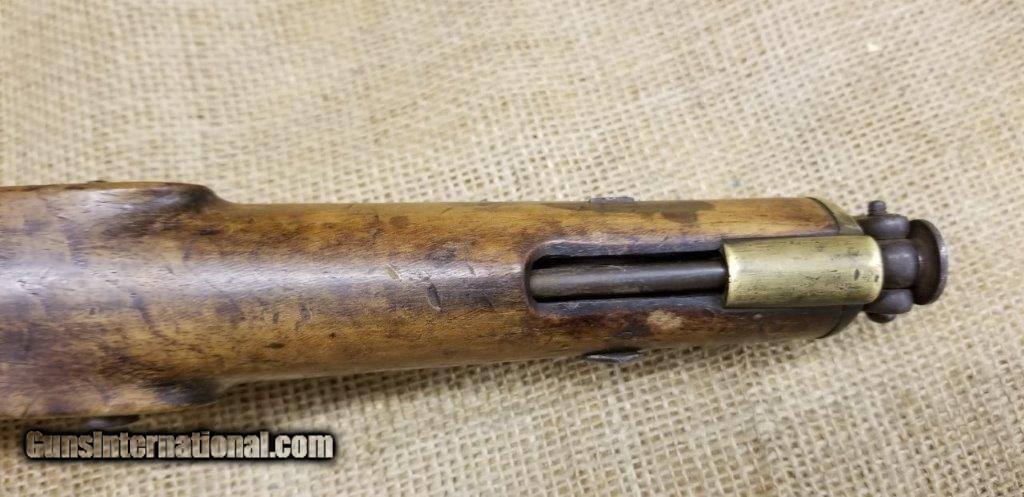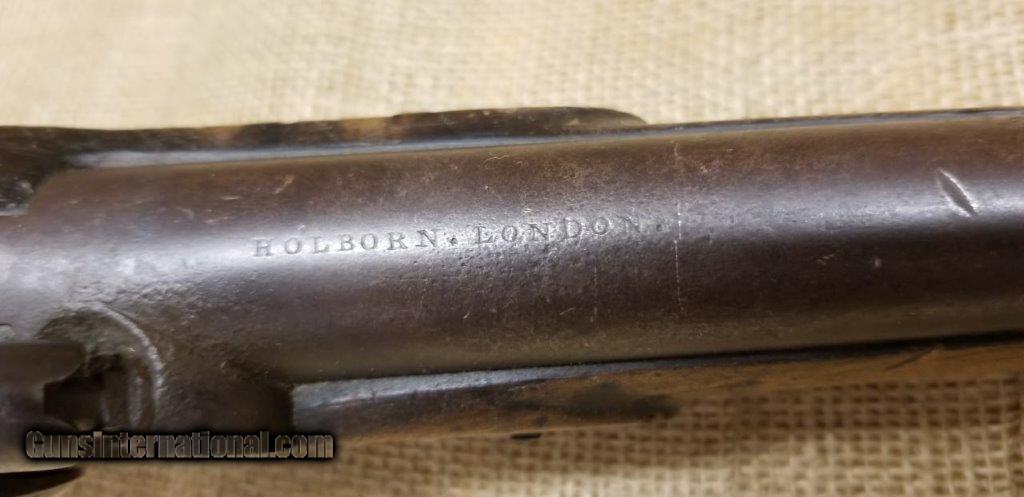 Description: Parker Field & Sons Percussion Pistol Holborn London .74 caliber? Flat outlined iron lockplate with maker's name present in front of the outlined hammer, Holborn London on top of round 9 inch barrel. Brass trigger guard, ramrod guide and butt cap. Swivel ramrod with button ends. Heavy walnut stock, crack at muzzle on left side stretching back to barrel pin. Barrel has London Proof House marking of crown over intertwined CP. Two stage action works nice and clean. Overall length is 15 1/2 inches weights 3 pounds 3 ounces Parker, Field & Sons operated from 1842 - 1877 at 233 High Holborn London SOLD Antique: Yes |