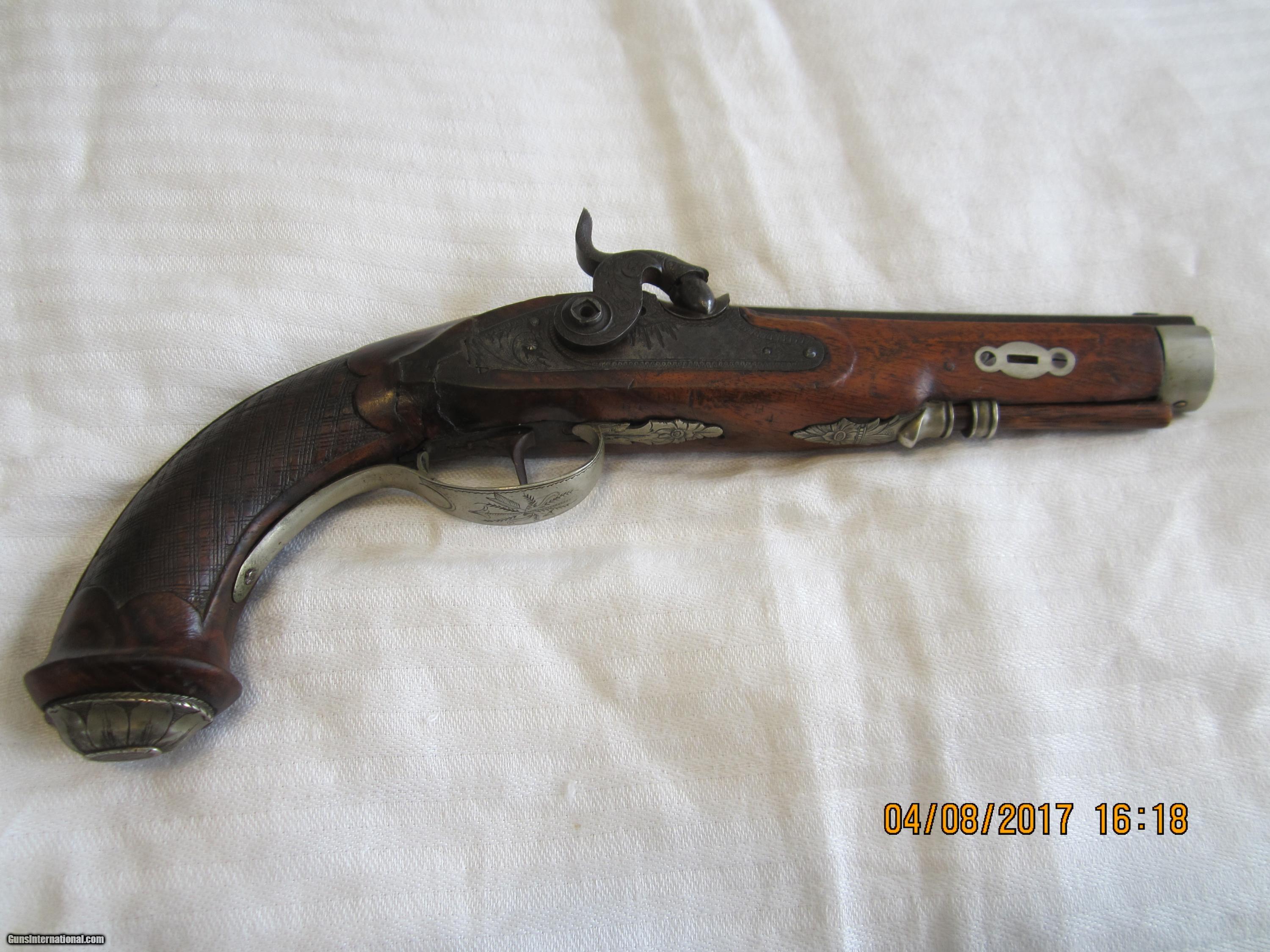Description: A well made fancy percussion gentleman's traveling pistol. The 5 & 1/2" octogon barrel is rifled and shows two engraved bands near the hammer which is typically an indication of high quality craftsmanship. The butt cap, trigger guard and other parts and decorations are made of silver. The grip is nicely both carved and checkered. There is a lot of engraving on lots of parts. A lot of finish remains on the hammer, lock and barrel. There is a full length walnut stock. The hammer only goes to what is normally the half cock position and fires from there when the trigger is pulled. It may well have been made that way. There is a sealed closed stable crack across the top part of the grip. ( see pictures) The price has been adjusted. It is a very handsome pistol. This is an antique so no FFL is required. NOTE; PRICE REDUCED SOLD Antique: Yes Manufacturer: unknown possibly made in Belgium ( but there is no typical "ELG" proof mark evident Model: Gentleman's Traveling Pistol Serial Number: none Caliber Info: .52 cal. Bore: Rifled Condition: Good Metal Condition: Good Wood Condition: Fair to good Bore Condition: very good Barrels: one Barrel Type: octogon-rifled Action: percussion Triggers: one Stock: Checkered Walnut Butt Pad: engraved silver Finish: blued Sights: front only Manufacture Date: ca. 1840 Engraving: yes lots Item Location: California |