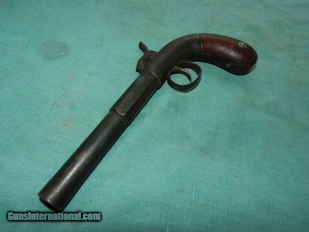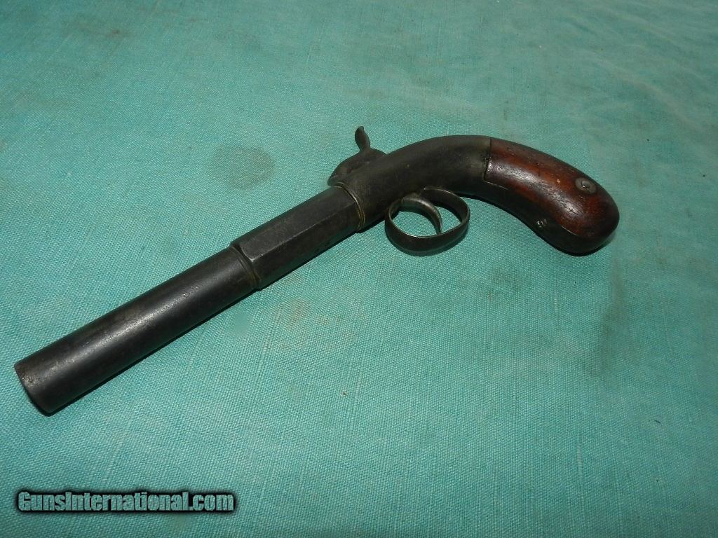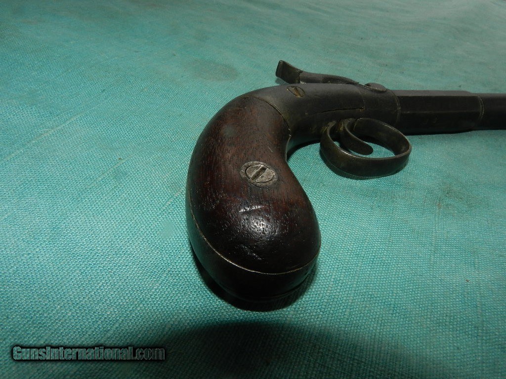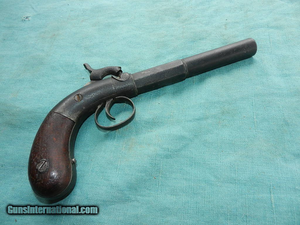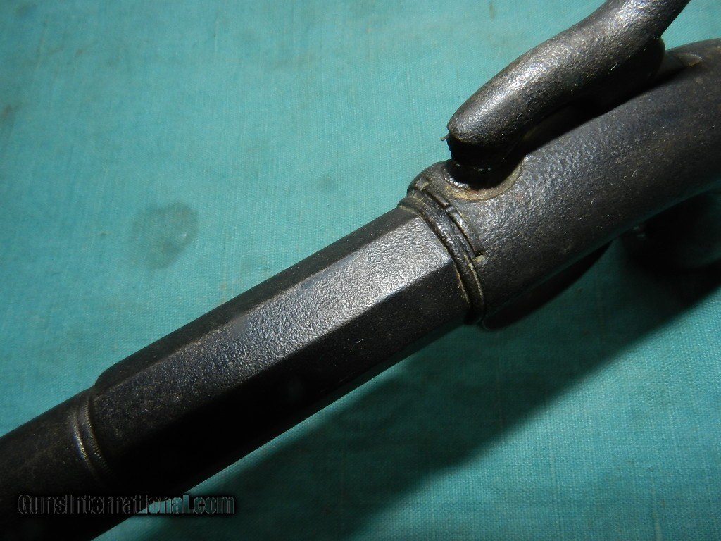 Description: SOLD A long barrel, center hammer .32 cal percussion pistol with a round/octagonal 5" barrel with a brass bead front sight worn down. Action works one cock don't see where it may hacve had a two cock action as this is an early gun maybe 1830's , has single cock. Top of the flat on the barrel has an address/maker but i can only read a couple letters.. The exterior metal through-out has very fine corrosion , or roughness but not deep pits and the coloring is very dark blue/black not like modern bluing.The Hardwood walnut bag grips are very clean with no issues. Possibly an Allen and Thurber, or a Bacon made boot pistol. When buying a gun always have it examined by a competent gunsmith before shooting. To buy a gun from me you must get a direct email for me, with details, and shipping cost. We don’t have a web site .I prefer money orders or a check. Item ships when funds come in. If you can only pay with a card let me know. I try to keep guns affordable, which means I make less money than most dealers. You won’t get altitude sickness, or nose bleed, with my prices! I consistently have the best selection of older guns If you attempt to buy, you must still contact us for details . Best to email to buy. Sometimes a local person can stop buy and purchase before the gun is removed. Sometimes not home to get calls. Some guns are required shipment to a gun dealer near you for a transfer to you when it arrives. Otherwise many older or black powder guns ship to your door. With the widest selection of older guns at great prices, We don’t have a store, and sell on the internet only. I’m easy to get along with. Thank You. SOLD Antique: Yes |