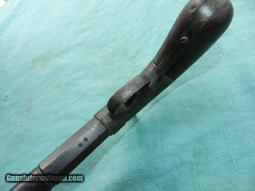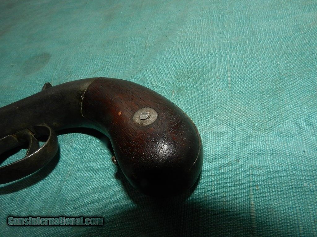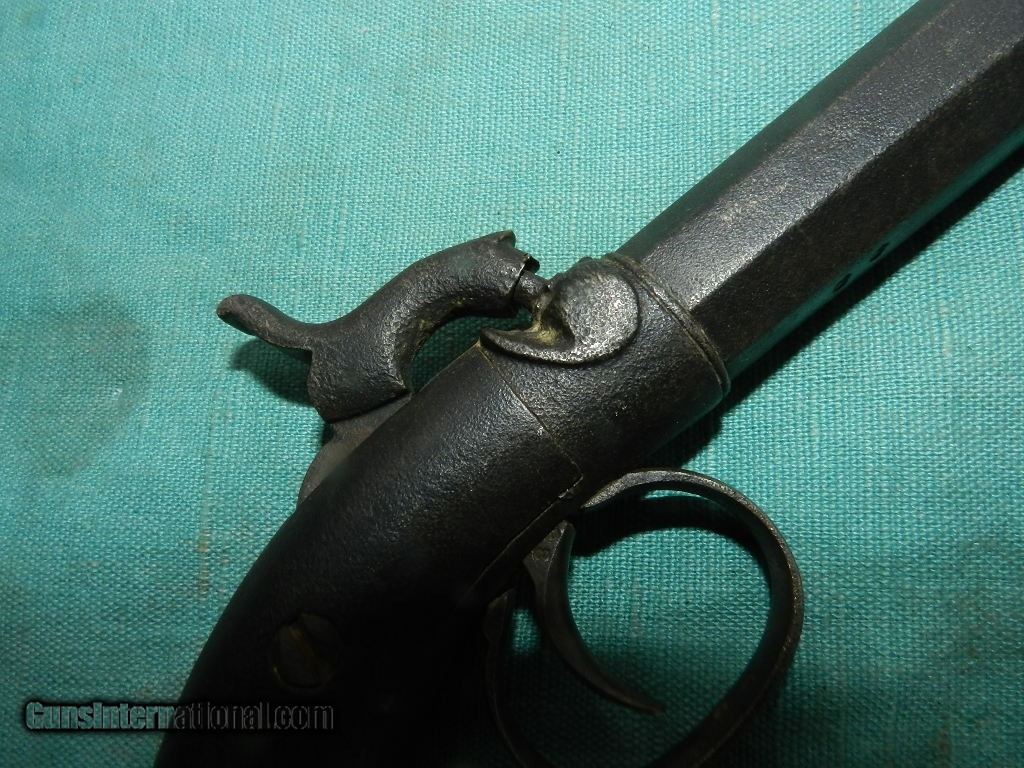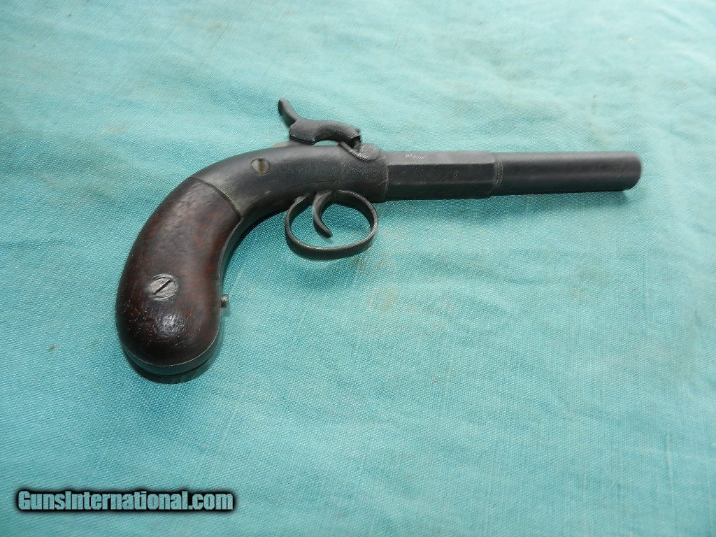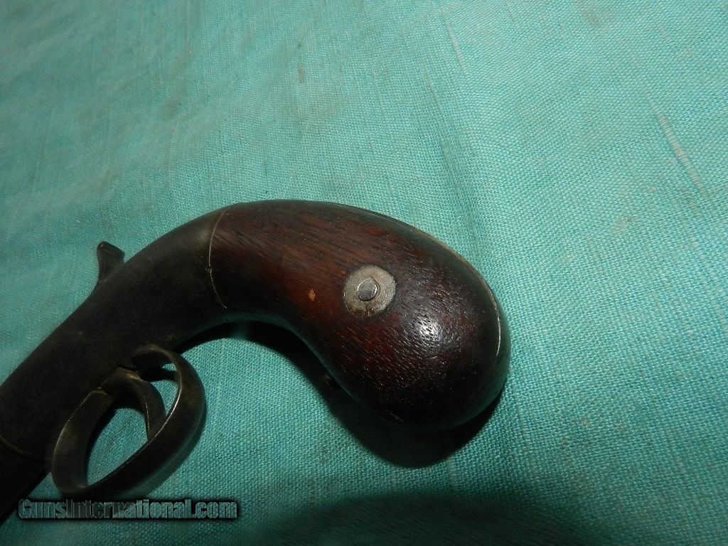 Description: SOLD A long barrel, center hammer .32 cal percussion pistol with a round/octagonal 5" barrel with a brass bead front sight worn down. Action works one cock don't see where it may hacve had a two cock action as this is an early gun maybe 1830's , has single cock. Top of the flat on the barrel has an address/maker but i can only read a couple letters.. The exterior metal through-out has very fine corrosion , or roughness but not deep pits and the coloring is very dark blue/black not like modern bluing.The Hardwood walnut bag grips are very clean with no issues. Possibly an Allen and Thurber, or a Bacon made boot pistol. When buying a gun always have it examined by a competent gunsmith before shooting. To buy a gun from me you must get a direct email for me, with details, and shipping cost. We don’t have a web site .I prefer money orders or a check. Item ships when funds come in. If you can only pay with a card let me know. I try to keep guns affordable, which means I make less money than most dealers. You won’t get altitude sickness, or nose bleed, with my prices! I consistently have the best selection of older guns If you attempt to buy, you must still contact us for details . Best to email to buy. Sometimes a local person can stop buy and purchase before the gun is removed. Sometimes not home to get calls. Some guns are required shipment to a gun dealer near you for a transfer to you when it arrives. Otherwise many older or black powder guns ship to your door. With the widest selection of older guns at great prices, We don’t have a store, and sell on the internet only. I’m easy to get along with. Thank You. SOLD Antique: Yes |