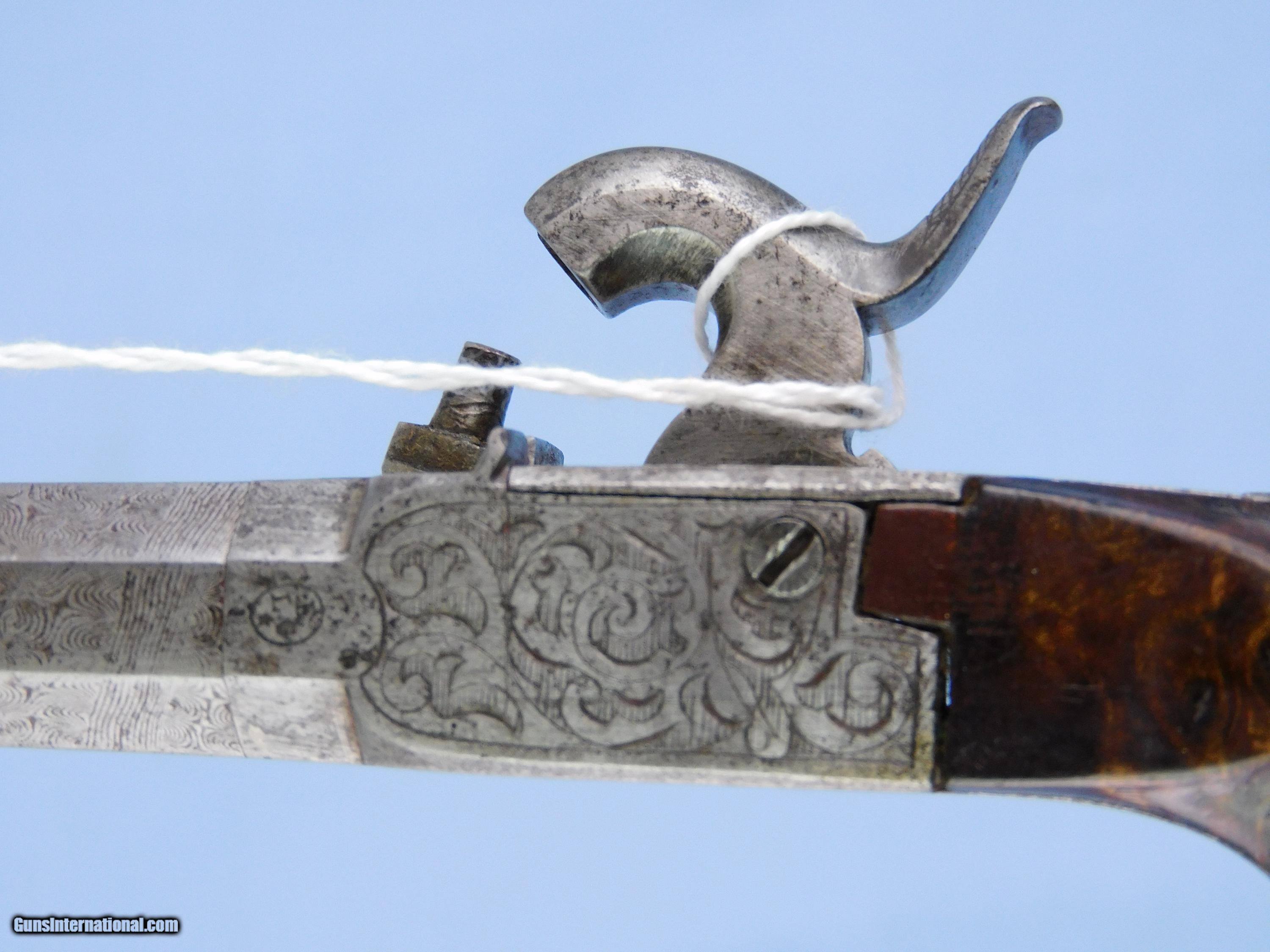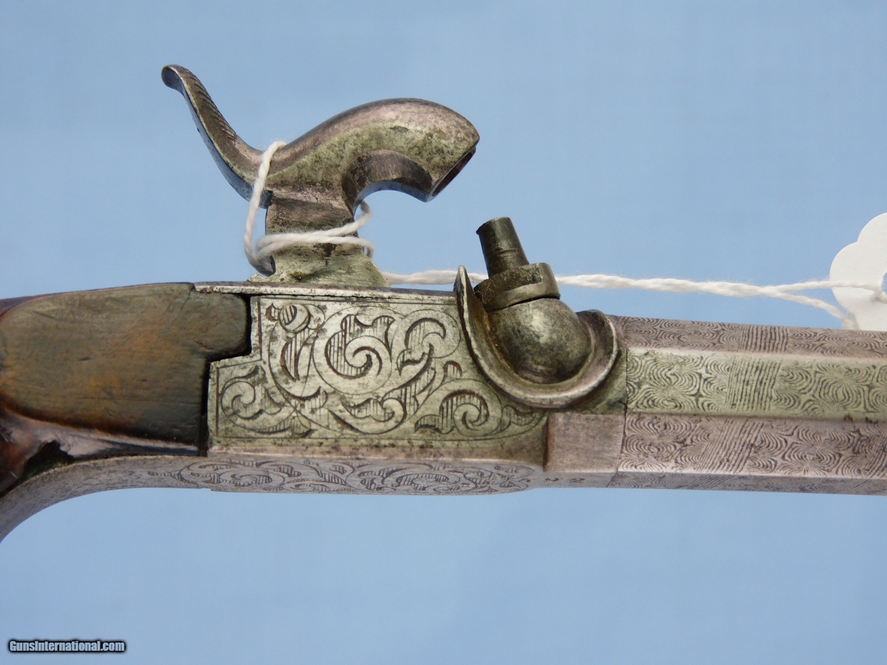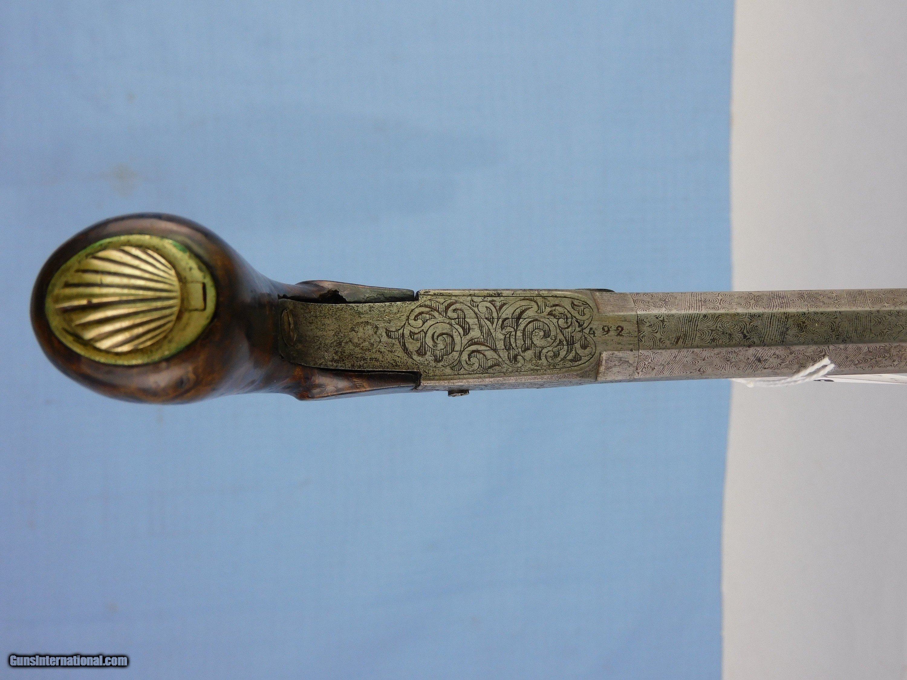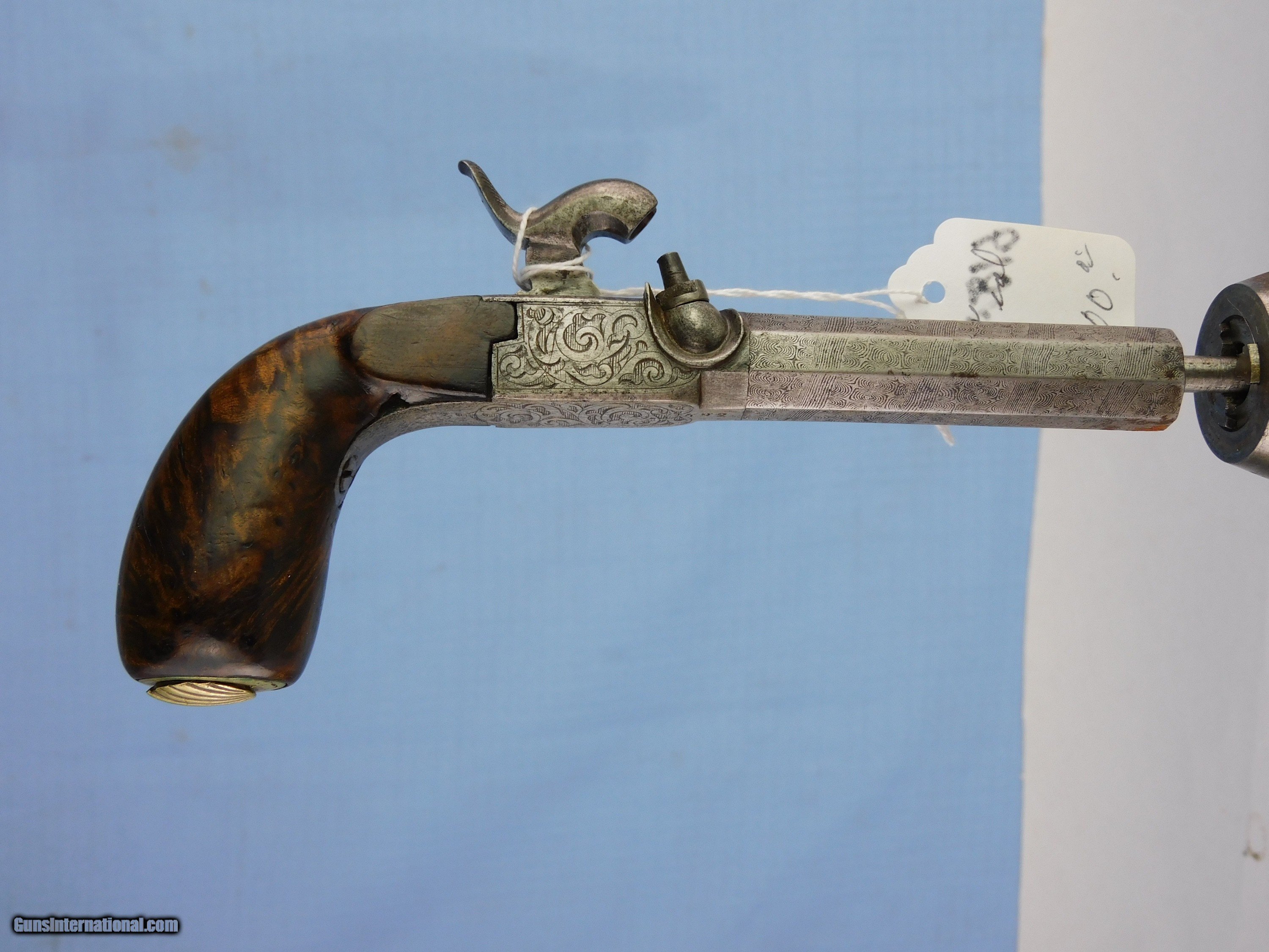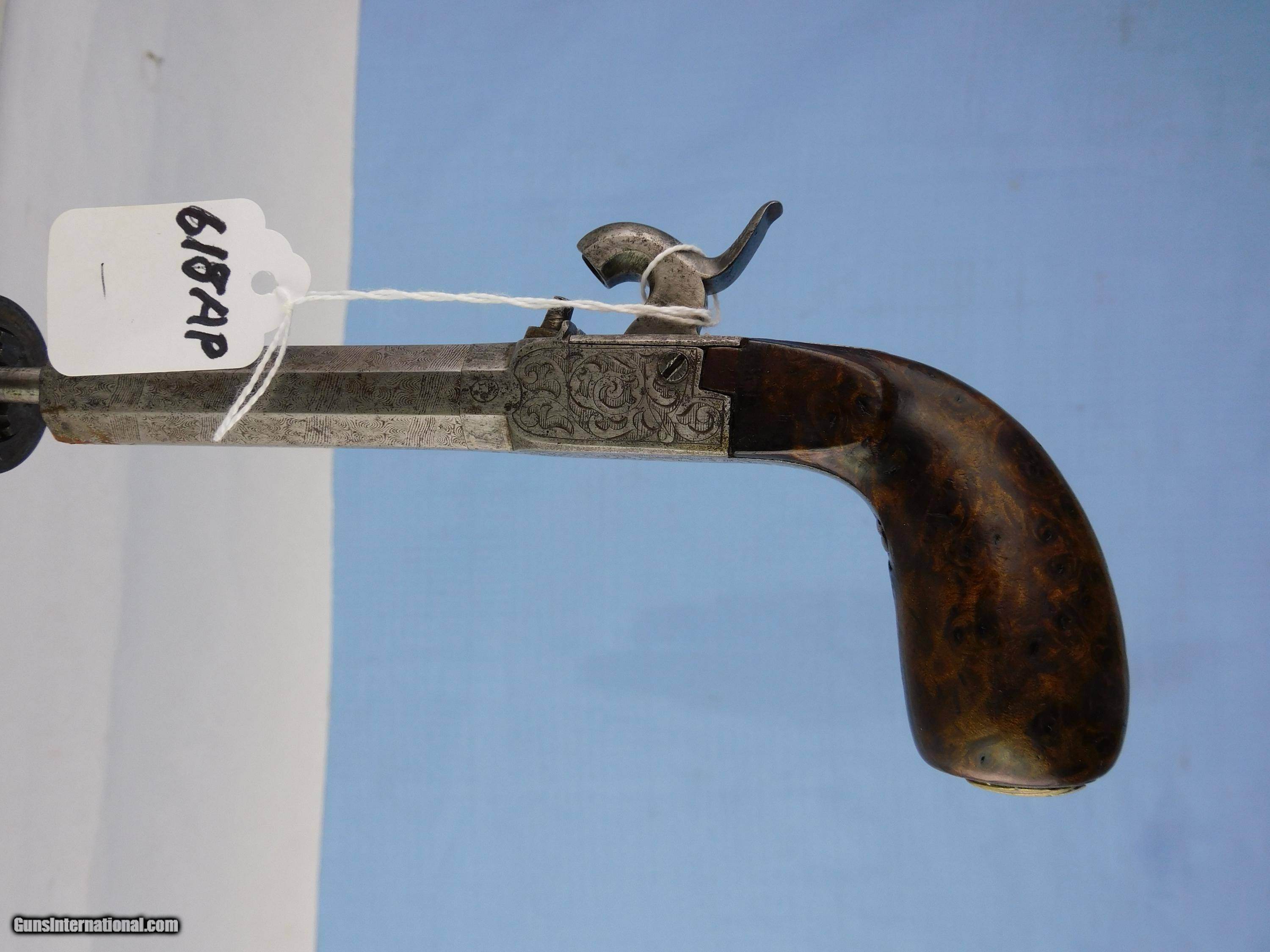 Description: #618AP PERCUSSION BOX LOCK MUFF PISTOL, 45 cal., 3 1/2” oct. bbl., engraved in floral design, damascus finish, trap in butt for caps, VG wood grips. $395 SOLD Antique: Yes |