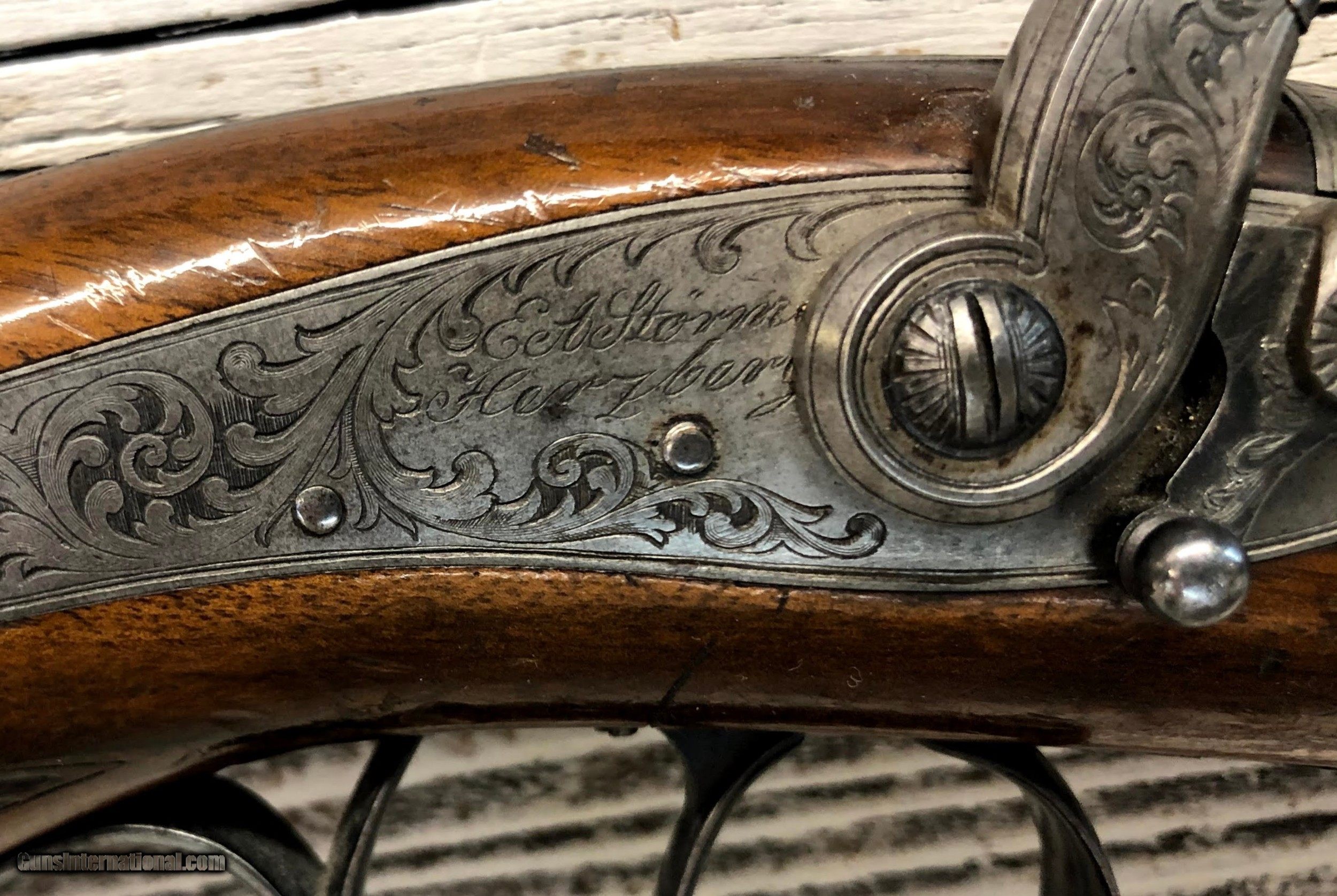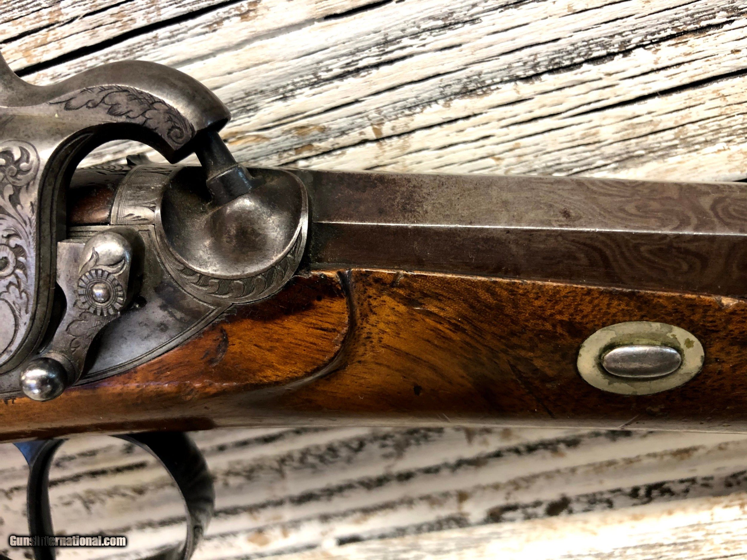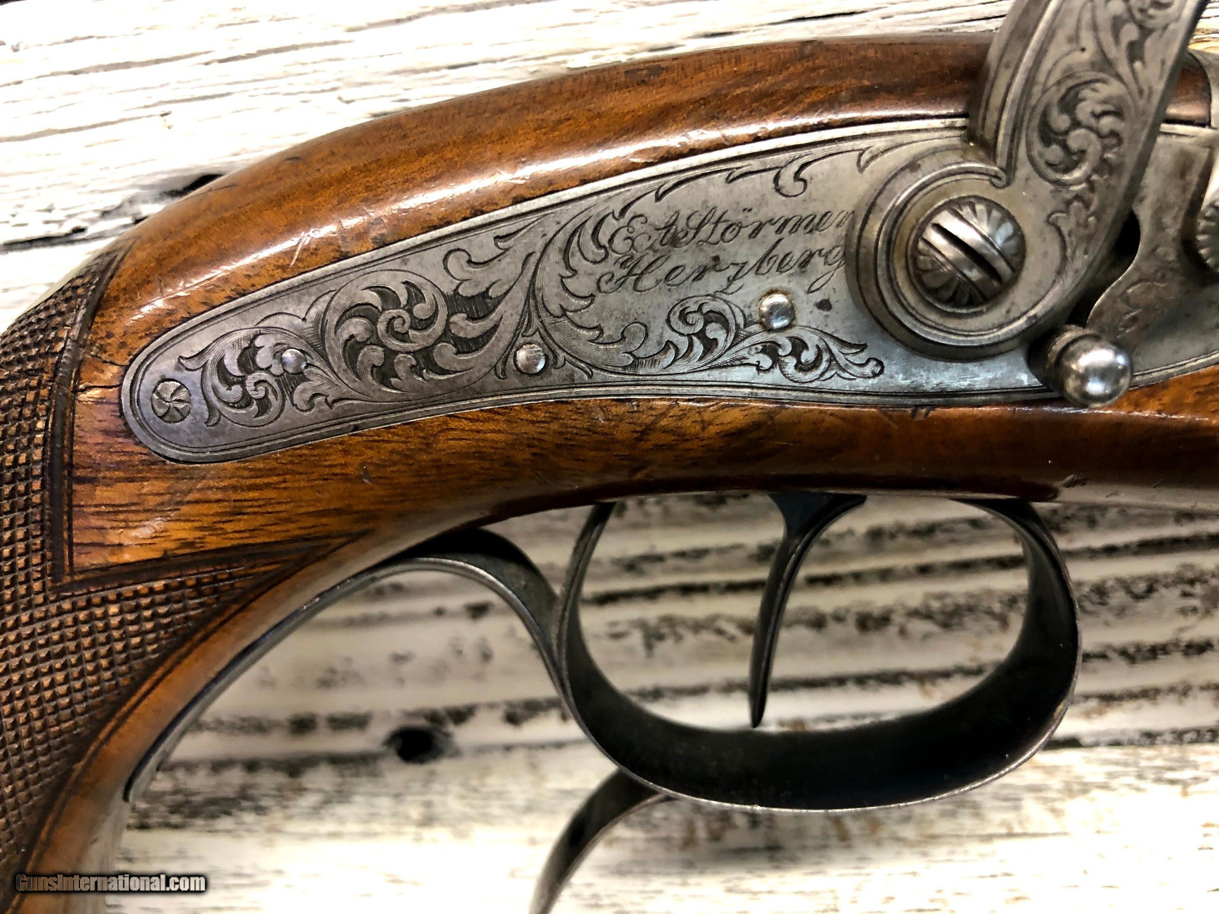 Description: Very nice set of Duelling / target percussion pistols by EA Stormer - out of Herzberg. Each pistol marked with No1 & No2 Ornate octagon damascus barrels in good condition with slight marking. Barels have rear and fore sights Wood is in decent condition with some wear and marks as can be seen in the photos Unusual safety catches with ornate engraving on sideplates, trigger guard and buttplates. These are all original with no refinish. No case, as is. ://photos.app.goo.gl/yhReKMK6RKMZcisg6 SOLD Antique: Yes Manufacturer: EA Stormer Condition: very good Metal Condition: very good Wood Condition: good Bore Condition: good Barrels: Damascus Action: percussion Triggers: single |