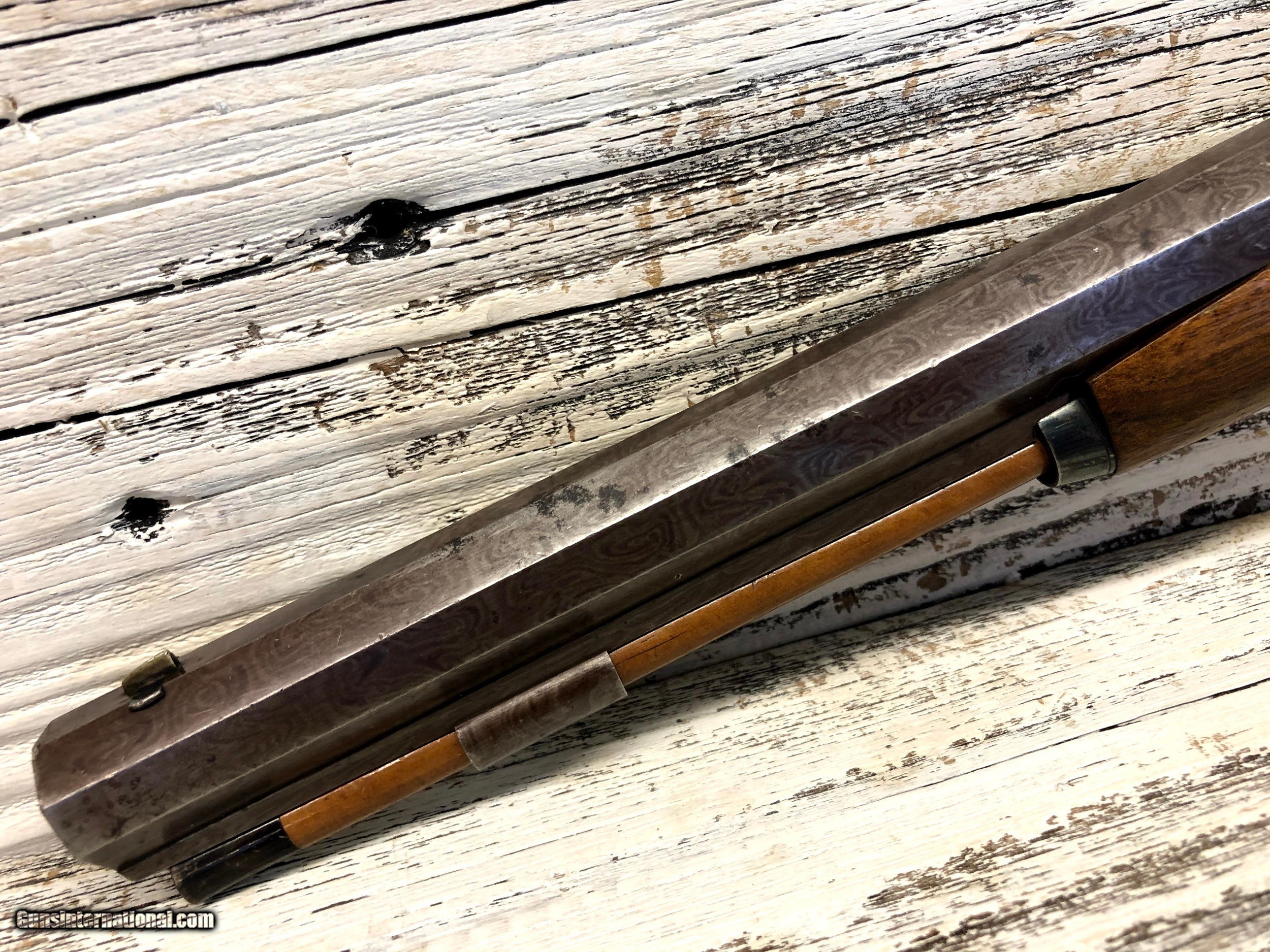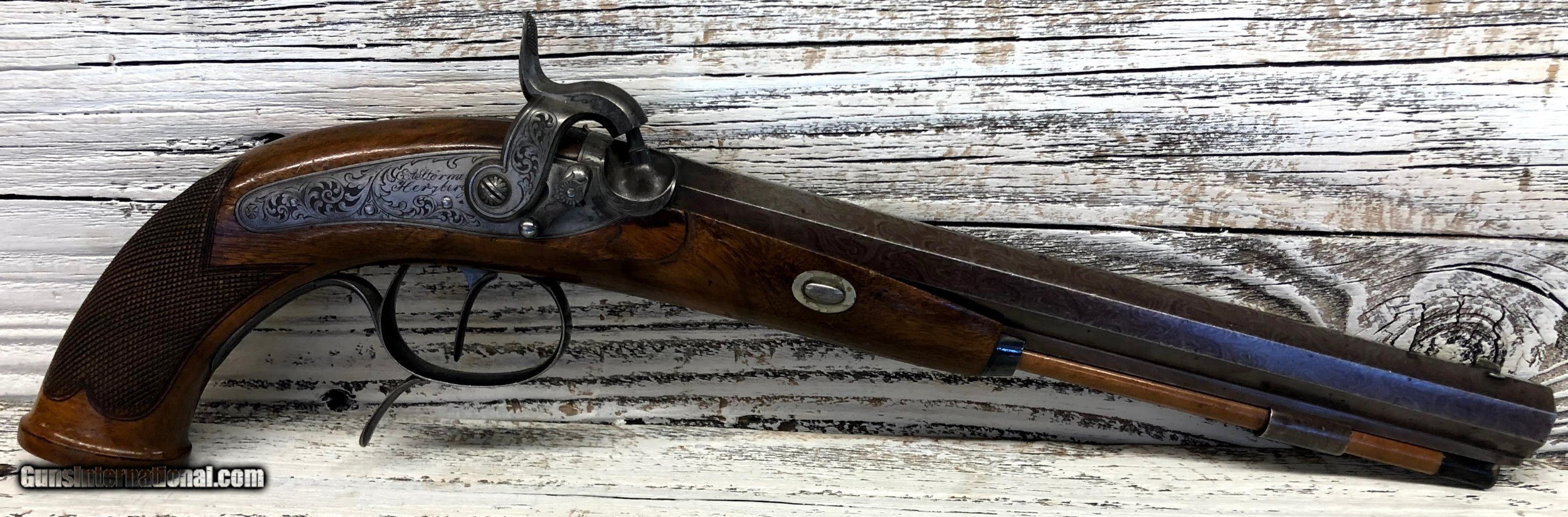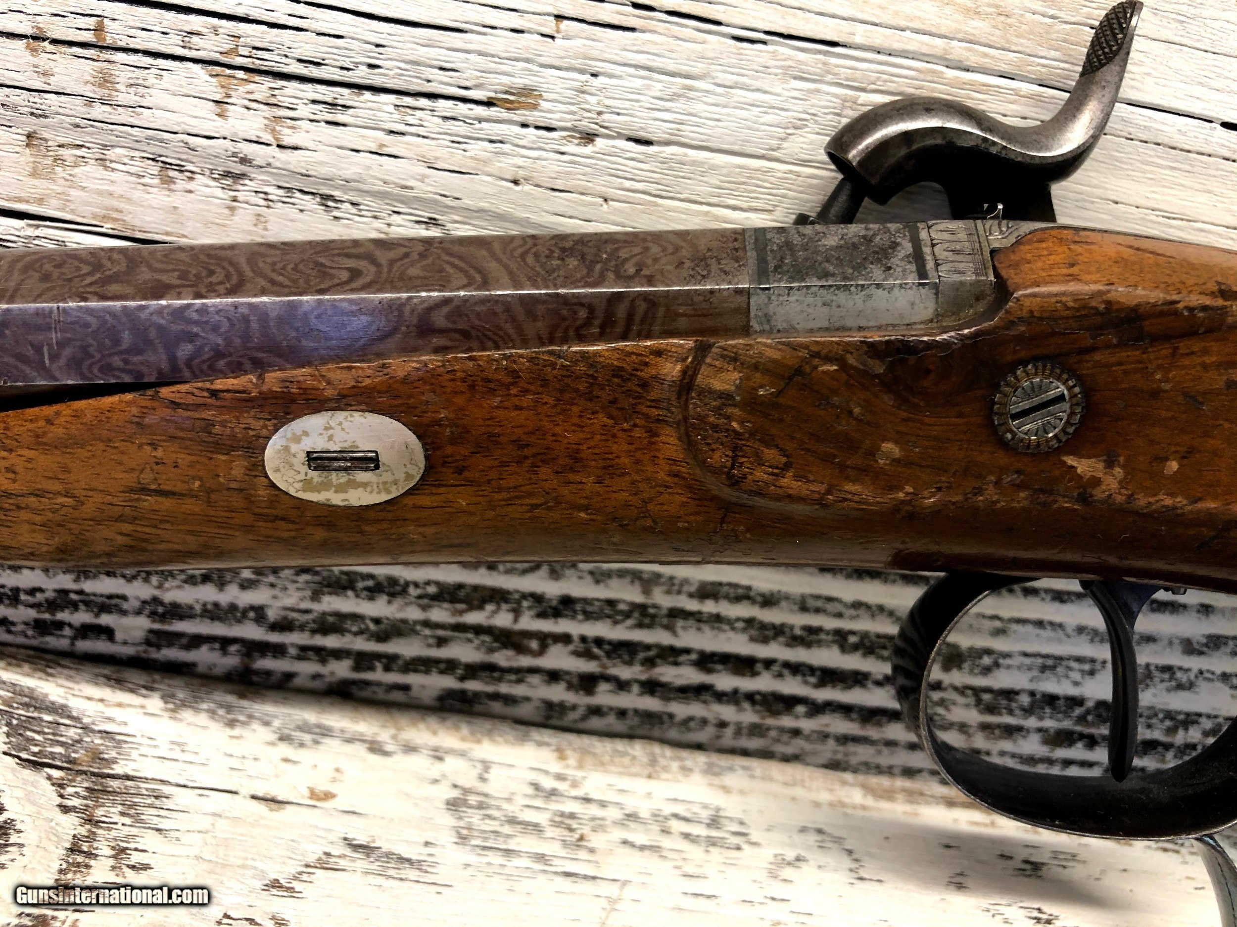 Description: Very nice set of Duelling / target percussion pistols by EA Stormer - out of Herzberg. Each pistol marked with No1 & No2 Ornate octagon damascus barrels in good condition with slight marking. Barels have rear and fore sights Wood is in decent condition with some wear and marks as can be seen in the photos Unusual safety catches with ornate engraving on sideplates, trigger guard and buttplates. These are all original with no refinish. No case, as is. ://photos.app.goo.gl/yhReKMK6RKMZcisg6 SOLD Antique: Yes Manufacturer: EA Stormer Condition: very good Metal Condition: very good Wood Condition: good Bore Condition: good Barrels: Damascus Action: percussion Triggers: single |