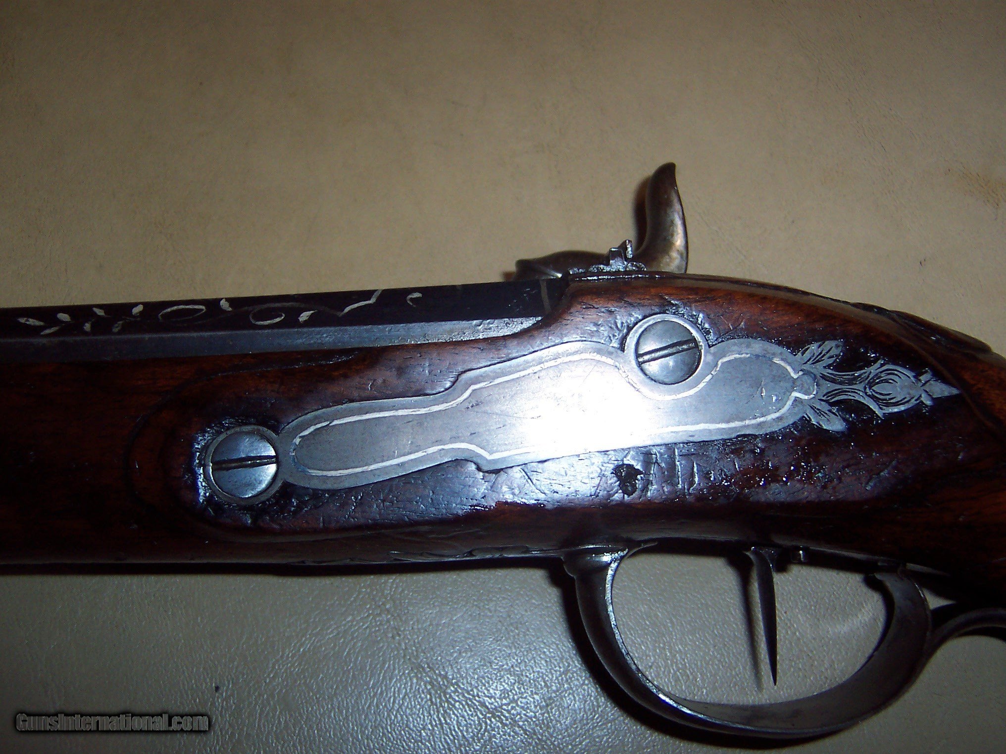 Description: 9 1/2 inch barrel// 15 inches oa // rifled bore / silver inlays on barrel ,lock , side plate and by front sight // lock marked in silver hildburgauhfen // barrel marked anton gmeimer// spelling is the best i can make out //action strong // bore in vg condiyion // adjustable trigger / all steel mounts // missing shoulder stock// chip in forend by left side of muzzle// solid stock // 3 leaf rear sight // nice nipple/ possible flintlock conversion $40 sh/? nicely preserved looks nice/ may be miltary caverly ???????????? SOLD Antique: Yes Manufacturer: european |