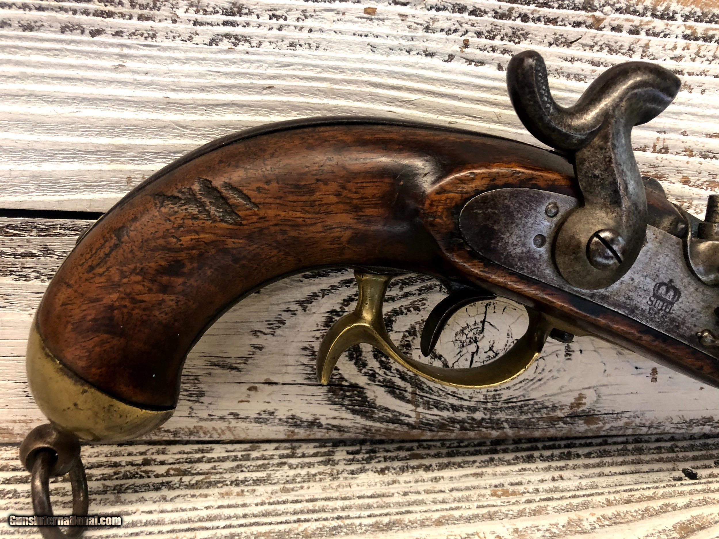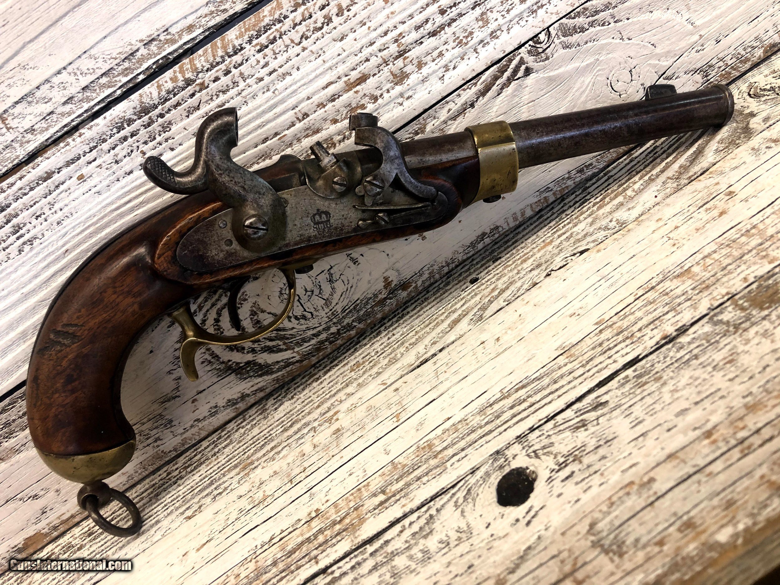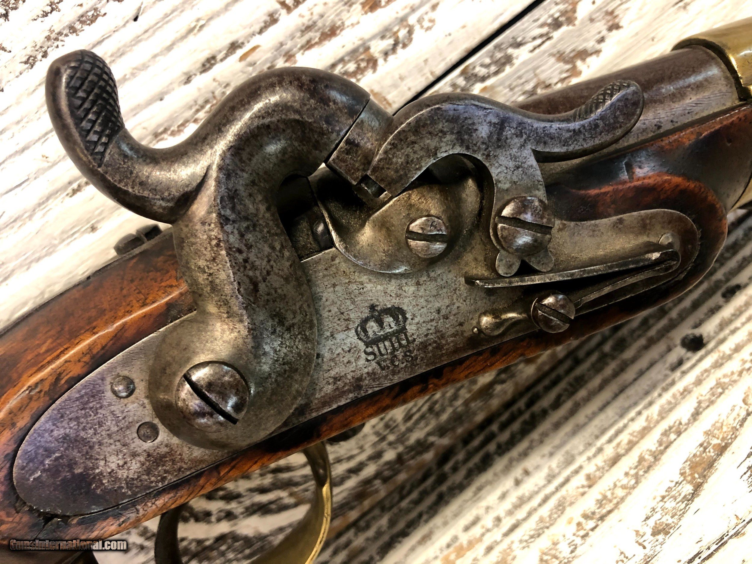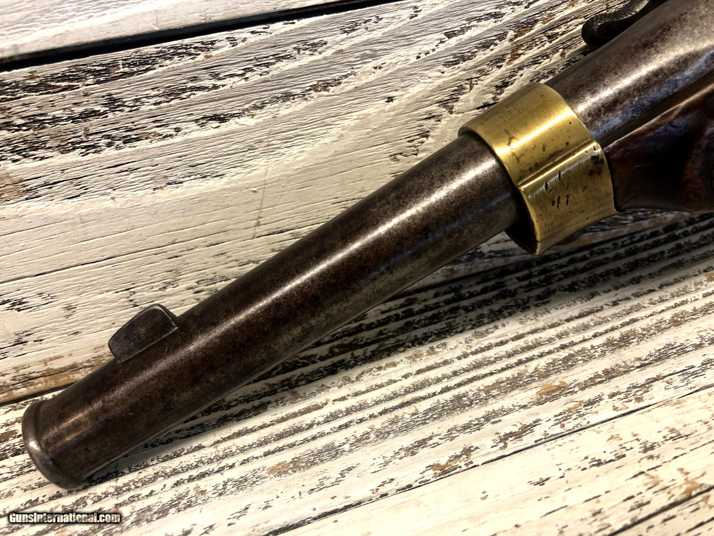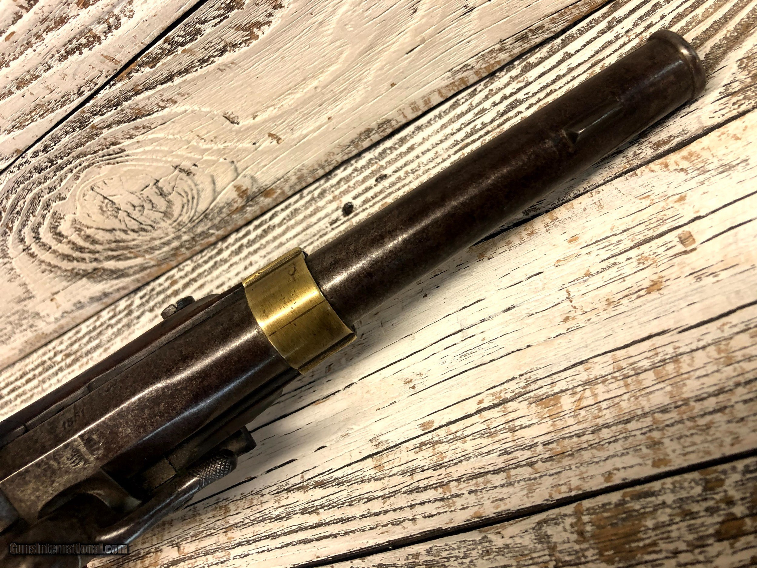 Description: Scarce Prussian 1851 Navy percussion pistol .58 Cal Hard to find model in very fine condition. Gun functions flawlessly SOLD Manufacturer: Suhl Model: 1851 Condition: good Metal Condition: fair Wood Condition: fair |