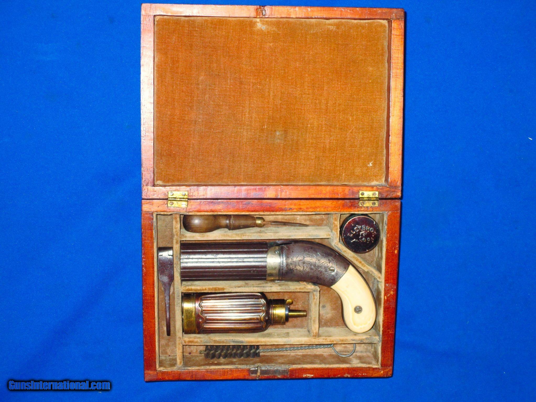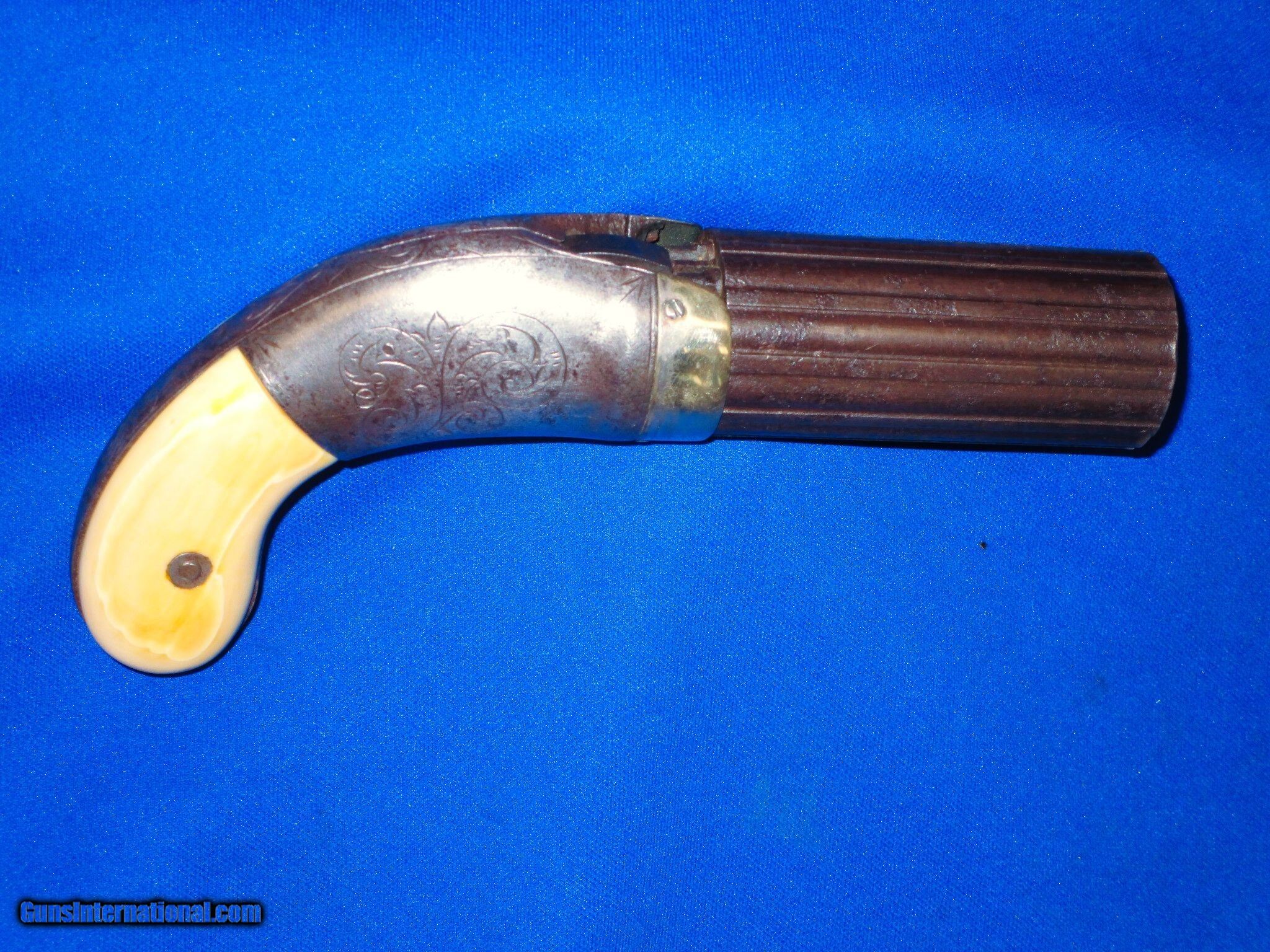 Rare 1840's To Early 1850's Pre Civil War Cased Percussion Engraved Pecare & Smith Ten Shot Pepperbox Pistol With Scarce Silver Nipple Shield