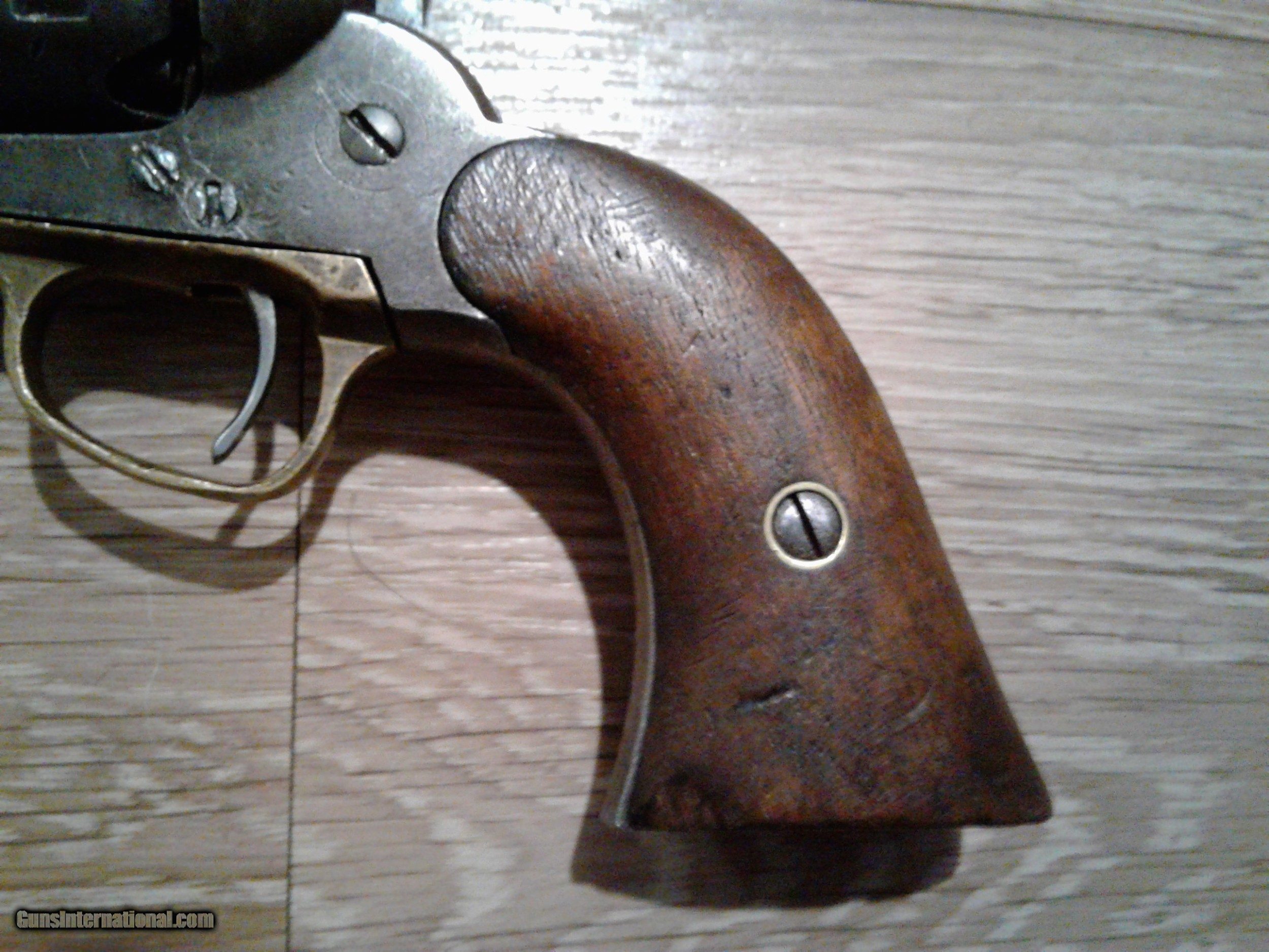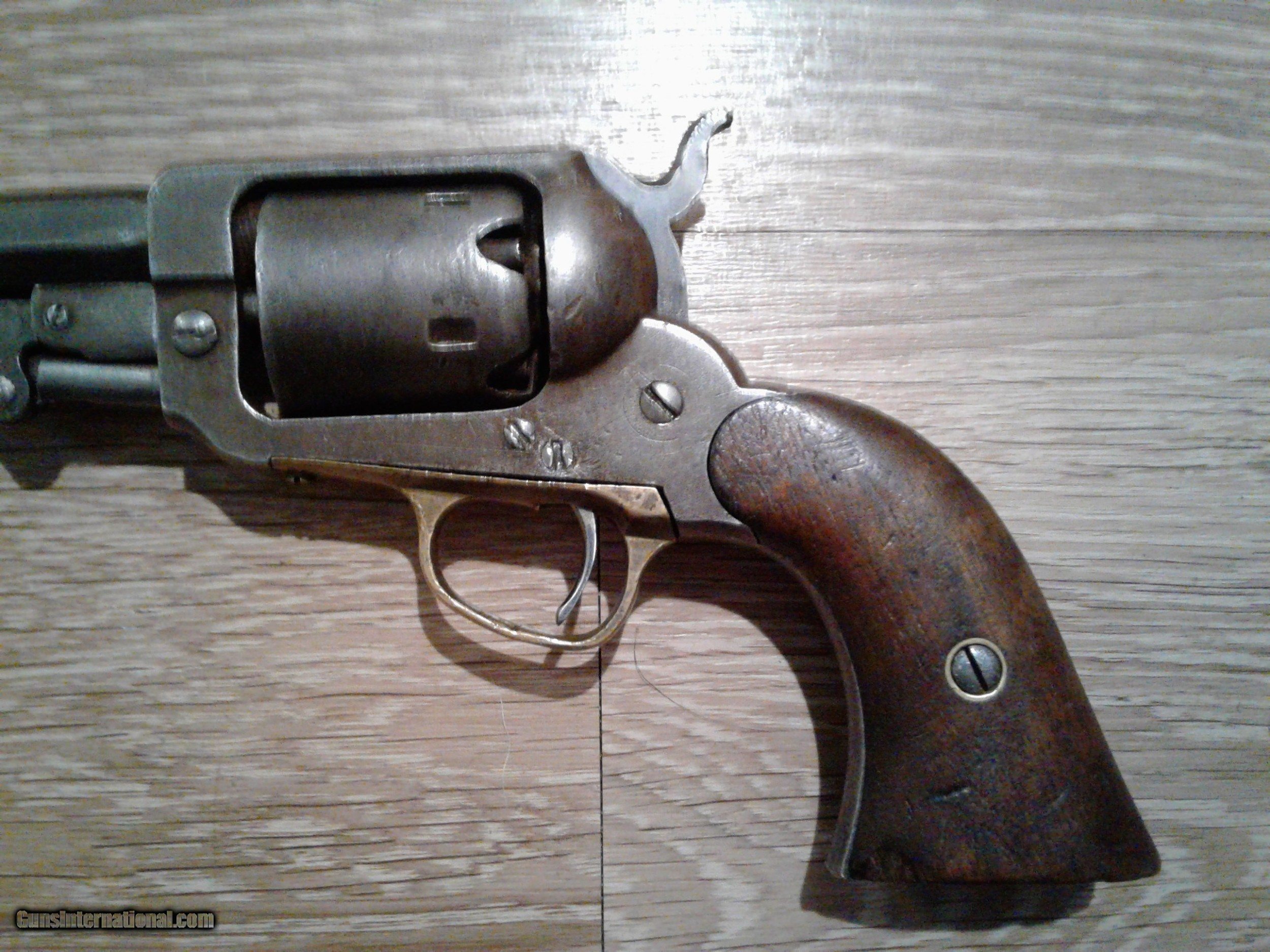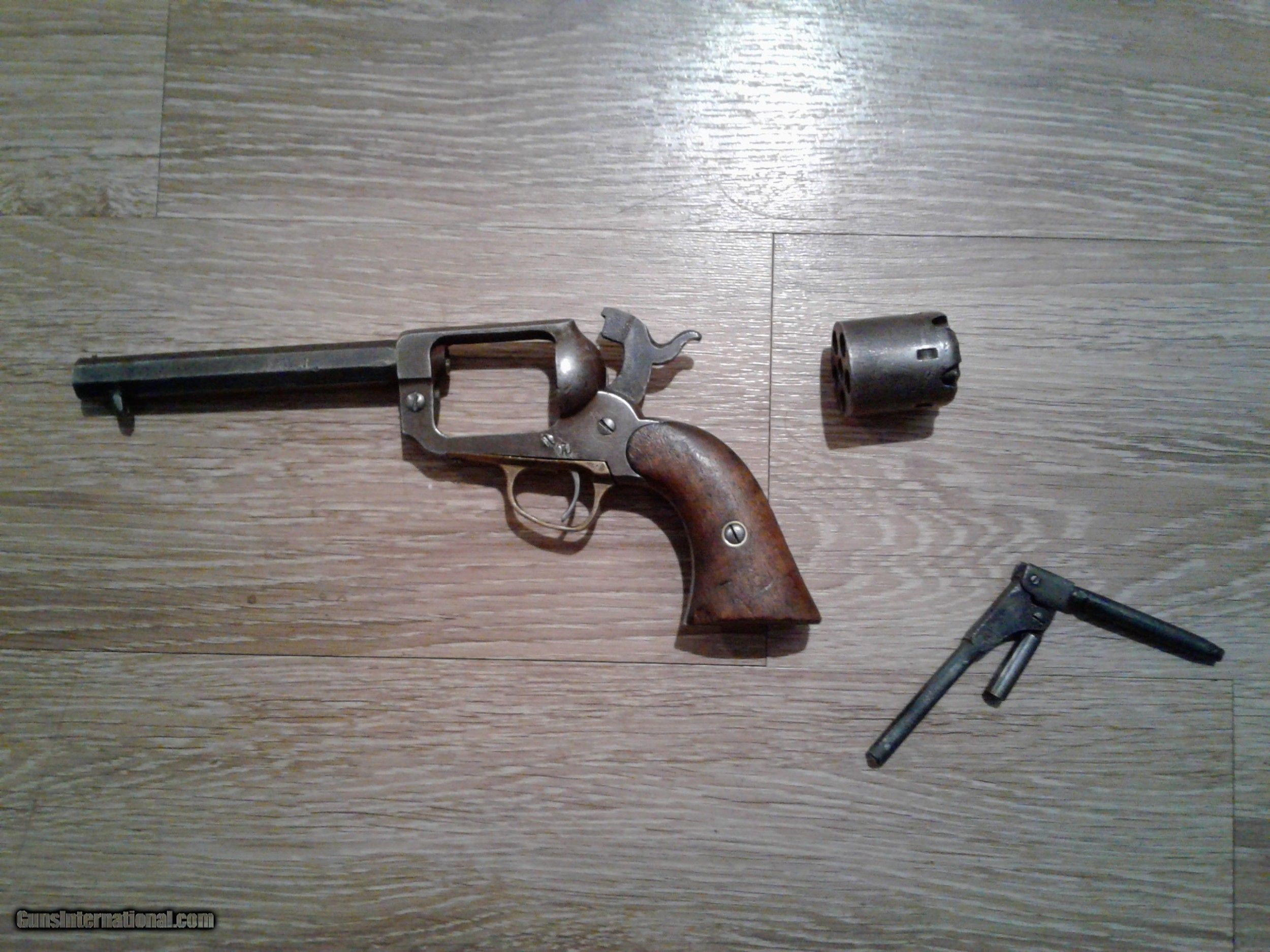 Description: This is a rare opportunity to own a piece of history! If you are looking for an honest representation of the Civil War and the mid-1800's old west, this revolver would be a great addition to your collection! Designated the Whitney Pocket Model Revolver, this type revolver is a 31 caliber sidearm of which a total of 32,500 such handguns were produced at the Whitneyville Armory manufacturing center in the Whitneyville section of New Haven, Connecticut from 1859 through the early 1860s. In good condition, this Second Model, 2nd Type Whitney sidearm is a three-screw model frame with a 5-shot unrebated cylinder mated to a 5” long, octagonal barrel and ball type latch on the loading lever. To me the 5 inch barrel revolver seems to be harder to find; most of them seem to be 4 inch. Gunmetal retains no case colors or bluing. Cylinder retains faint portions of the original roll engraved scene. Revolver bears the serial number “1764” stamped on the frame under the trigger guard. The serial number on the loading lever is not readable but appears to end with 7. There is no number on the underside of the barrel. The two-piece plain grips are of varnished walnut and are in good condition with wear along the bottom edge a couple of well-done chip repairs and the letter "W" carved on the right grip and on the bottom of the grips/backstrap. Barrel top flat shows a strong “E. WHITNEY / N. HAVEN”. Bore is very nice with strong rifling. Sidearm has an iron frame and backstrap which show moderate wear. Brass trigger guard has a beautiful uncleaned patina. Mechanics are great, it indexes well and locks-up tight. Original nipples are in excellent condition with clear openings. Overall the revolver wears a light gray coloring with scattered areas of mottling, some pitting on the loading bar, and moderate wear. SOLD Antique: Yes Manufacturer: E. Whitney Model: Pocket Revolver Serial Number: 1764 Barrel Length: 5 Bore: .31 Chambers: 5 Condition: good Bore Condition: fine Barrels: 1 Barrel Type: Octagon Action: Single Action Triggers: single Stock: Walnut Manufacture Date: 1859 |
