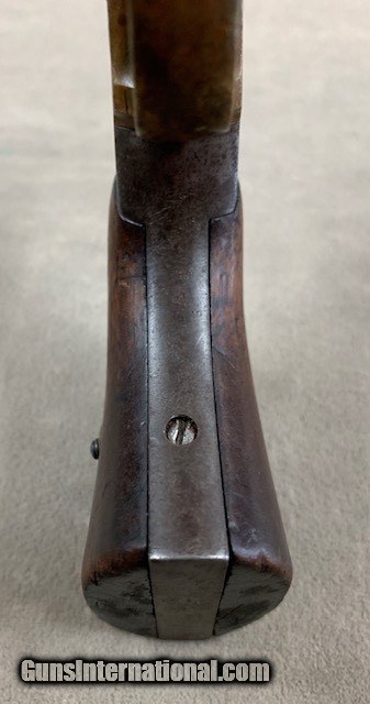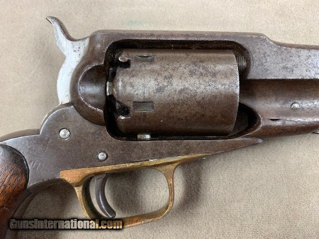 Description: This rare Remington Revolver is in original condition except a gunsmith has fit a new cylinder pin, different from the original, which entailed a modification to the bottom of the barrel for clearance under the lever. Not visible with the loading lever in place. Even with the alteration this is a most desireable Remington revolver. Serial range 19xxx. SOLD Curio/Relic: Yes Antique: Yes |