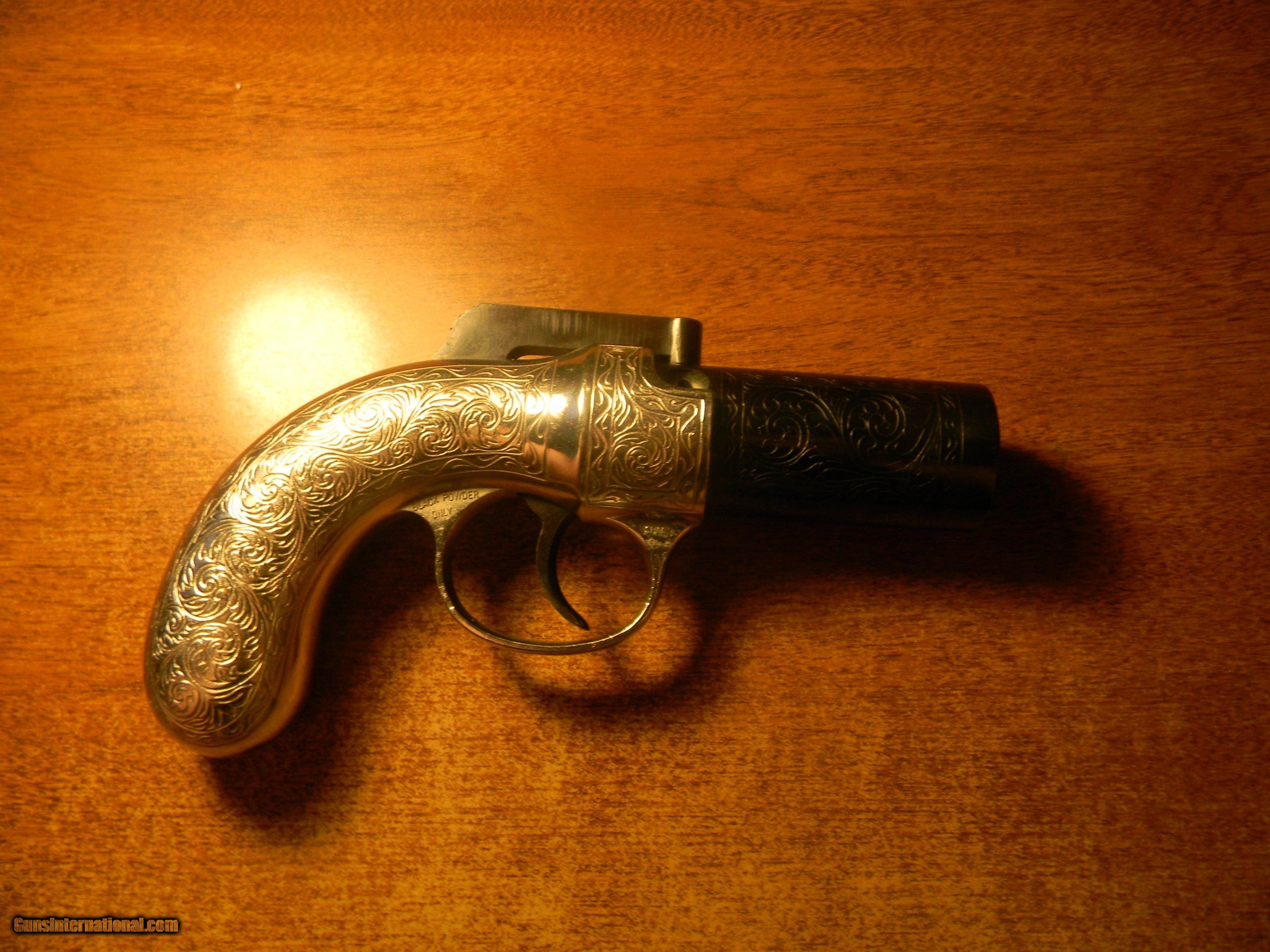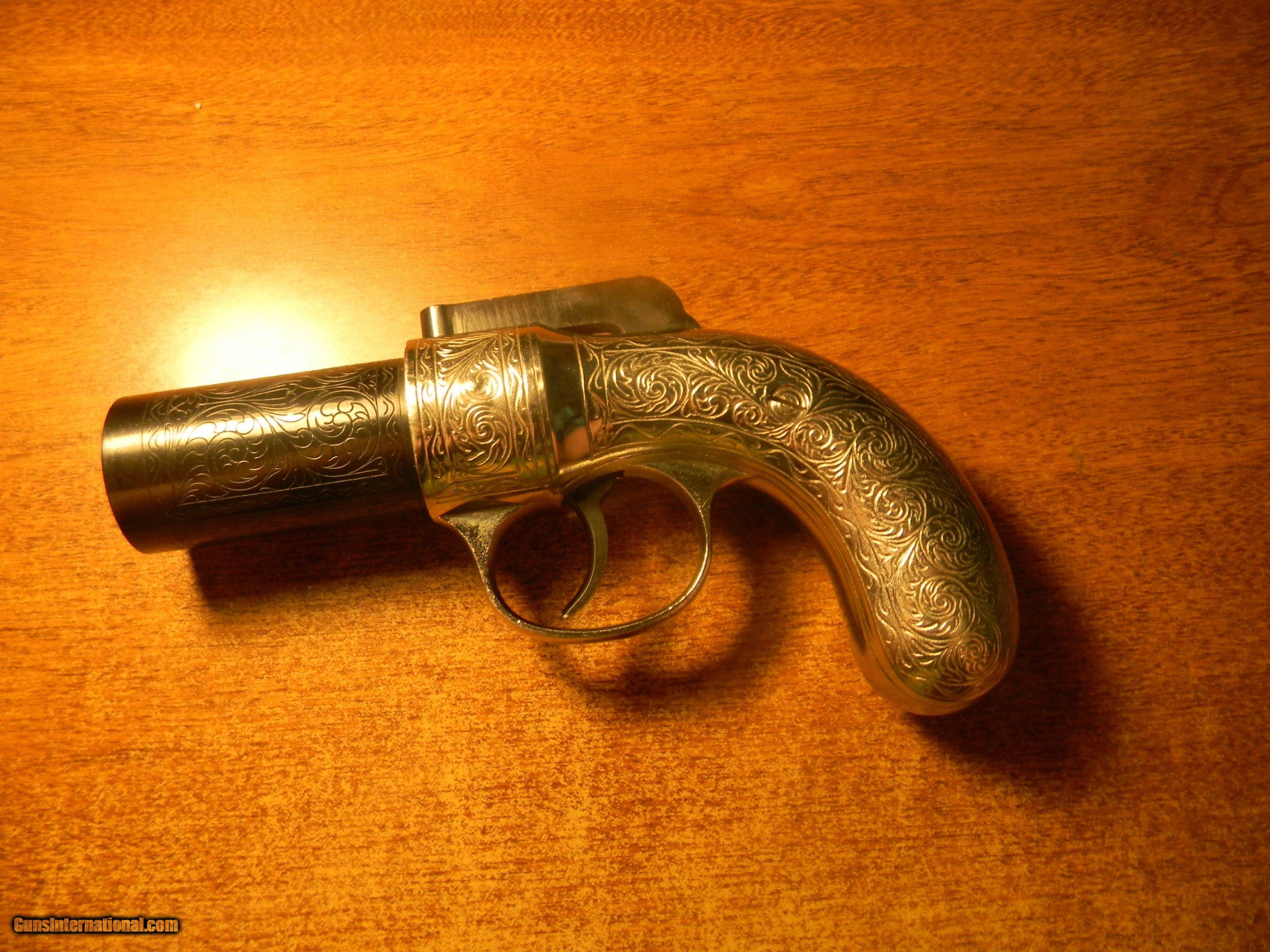 Description: (((((((((((((SOLD AZ))))))))))))))))REPRODUCTION PEPPER BOX PISTOL CALIBER .228 DIA CYLINDER FACE MADE IN SPAIN AND SO MARKED ALSO MARKED BLACK POWDER ONLY. NEW AND UNFIRED PERCUSSION. WANT TO PURCHASE CALL SHOP 716-941-3946 SOLD Antique: Yes |