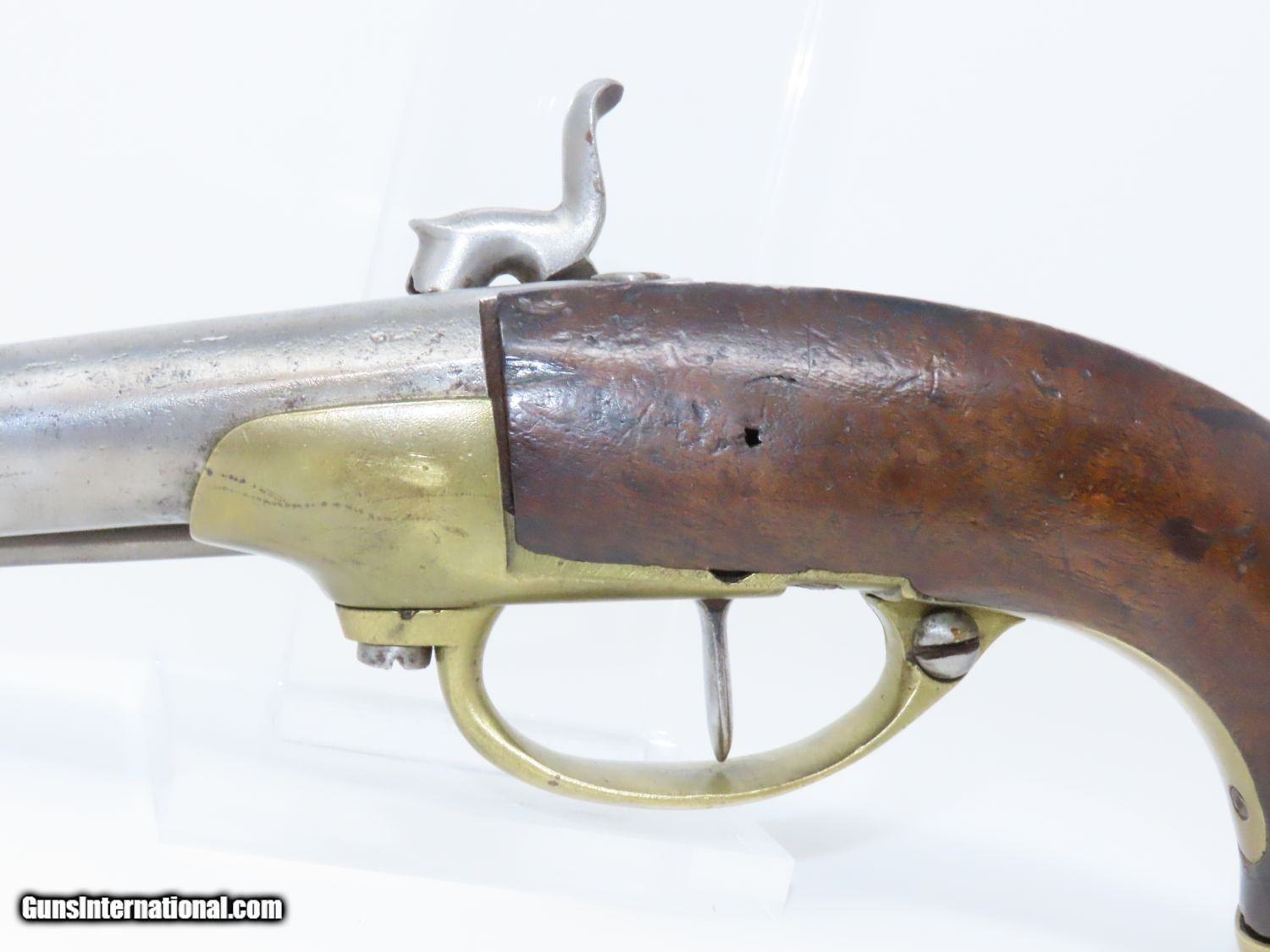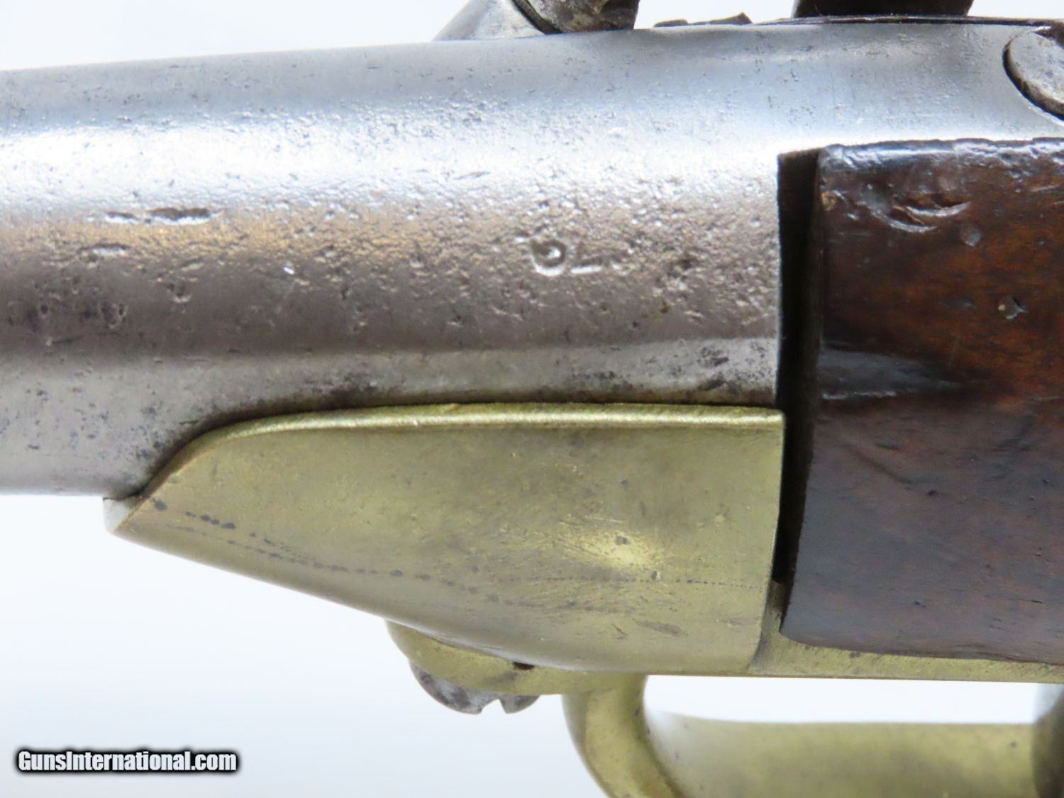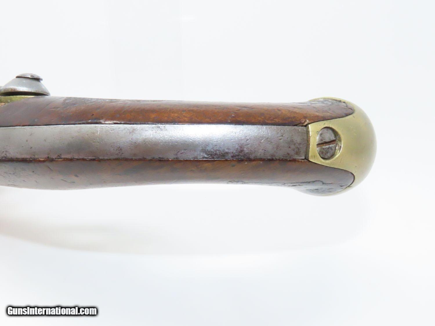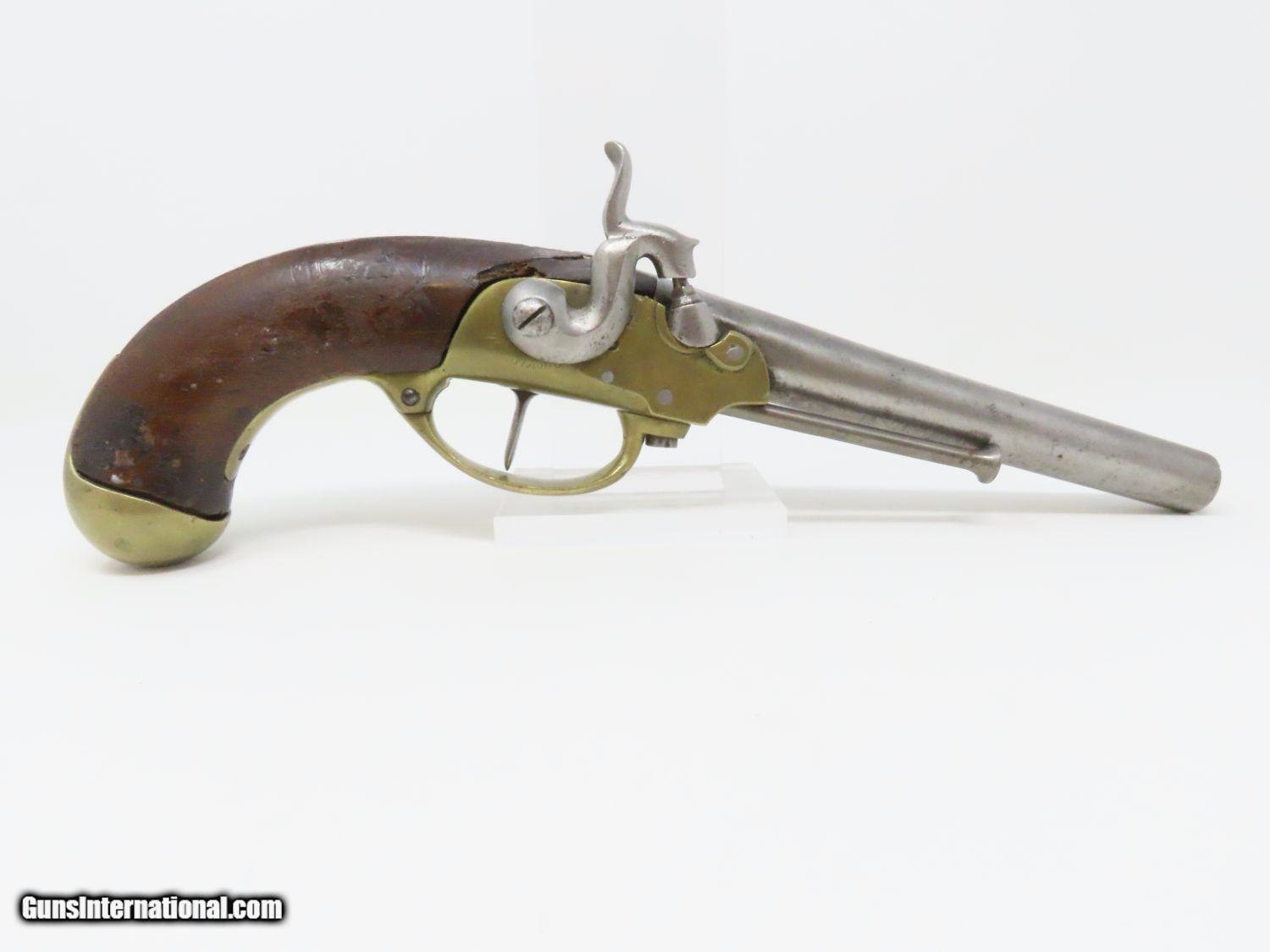 Description: REVOLUTIONARY WAR Period French CHARLEVILLE Model 1777 Pistol Converted French Military Sidearm Dated “[17]79”! Here we present an antique French Charleville Model 1777 Percussion Conversion Pistol, made at the armory at Charleville circa 1779. The Model 1777 is historically significant to the American Revolutionary War, as the French recognized the United States of America’s independence and sovereignty in 1778 and declared war on Britain as the fledgling nation’s ally. The French had begun sending arms and supplies in 1775, but secretly. With their new alliance, France provided the U.S. with loans, arms and even troops to fight on U.S. soil. Predecessor to the North & Cheney 1799 pistol, many French 1777 pistols came over from Europe during the American Revolutionary War, both with French troops and as part of the military aid supplied to the Revolution. After the American Revolution, the first U.S. martial pistol made and officially adopted in America was the incredibly scarce Model 1799, made by Simeon North & Elisha Cheney. The Model 1799 was patterned very closely to the Model 1777, with only a few changes. Only 2,000 1799s were made, making them incredibly rare and very expensive, valued in the tens of thousands. Finally, the Model 1777 is also historically significant to the French. At the time of this particular pistol’s making, in 1785, King Louis XVI was on the throne. In 1789, the French Revolution began and chaos ensued for the next 10 years, characterized by insurrections, mob violence, execution and assassination. King Louis XVI was executed in 1793. Simultaneously, France was at war with much of Europe. Eventually, Napoleon Bonaparte rose out of the ranks through coup and became emperor. This is one of the very few examples we have seen of one of these flintlock pistols converted to the percussion firing system, which was done circa the 1840s—this as a result of the mentality that nothing still useful gets wasted. The lock reads “CHARLEVILLE” and has “F/79” stamped just in front of the hammer as well as “79” stamped on the left side of the barrel—these dates of acceptance from 1779, which places this squarely inside the confines of the American Revolutionary War years of 1775-1783. The overall condition is good. The action is very strong. The bore is good. The stock is solid and stable regardless of the crack behind the breech. Whether you are a Franco-file, an American Patriot or want to own the pistol that the Model 1799 was designed upon, look no further. Here is an astounding amount of history in a small package. Own the original! This is a legitimate antique and not a reproduction. Barrel is 7-1/2 inches. Caliber: .69 Overall condition as seen in photos. Very Fast. Very Safe. FREE SHIPPING WORLDWIDE. Delivered directly to your door by express mail! Guaranteed AUTHENTIC & Includes CERTIFICATE OF AUTHENTICITY. ancestryguns $1895 #20157 SOLD Antique: Yes |