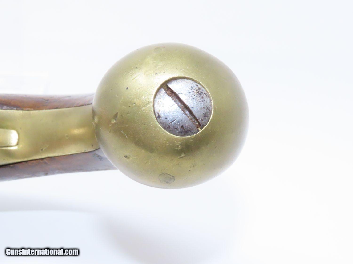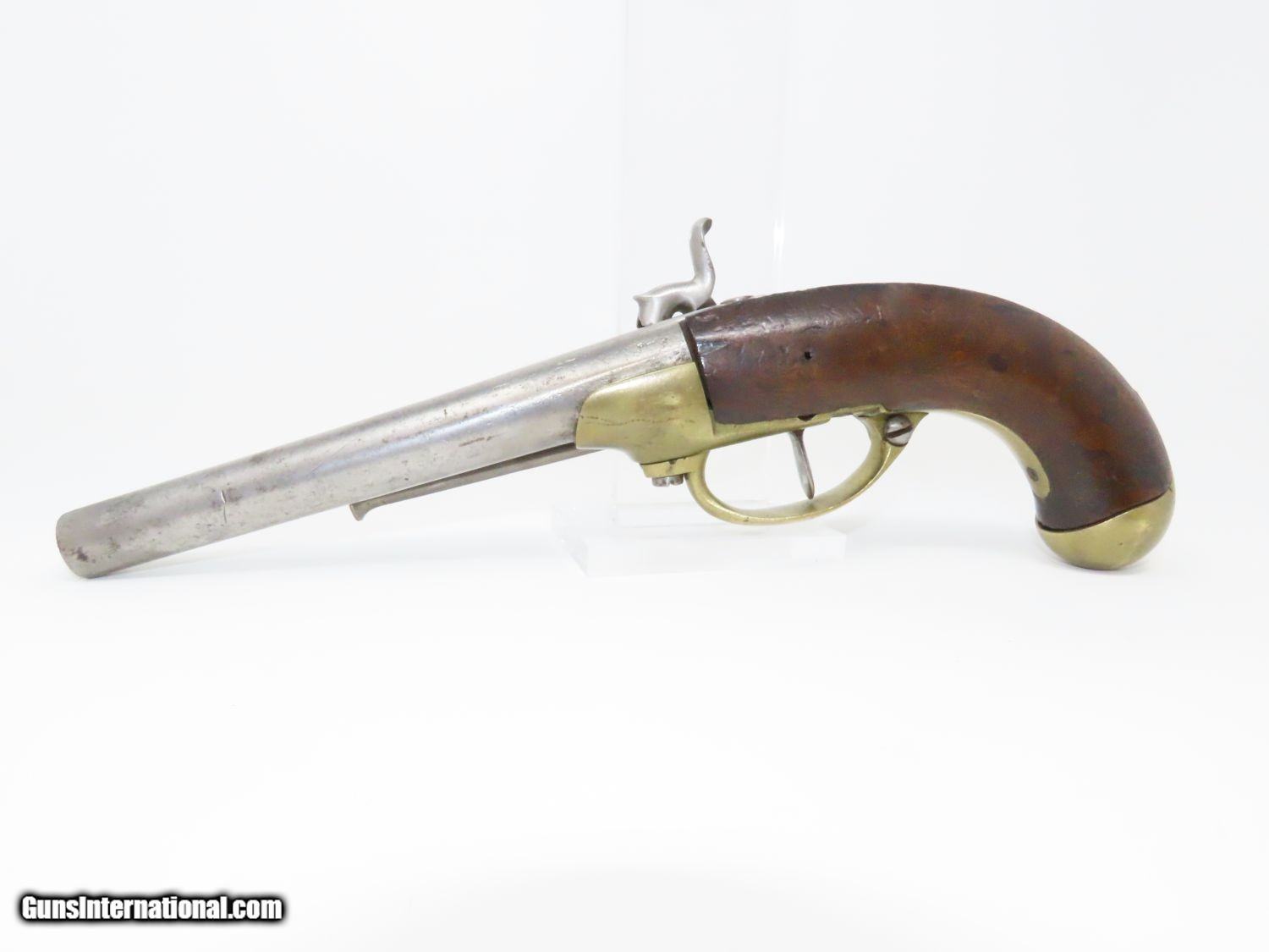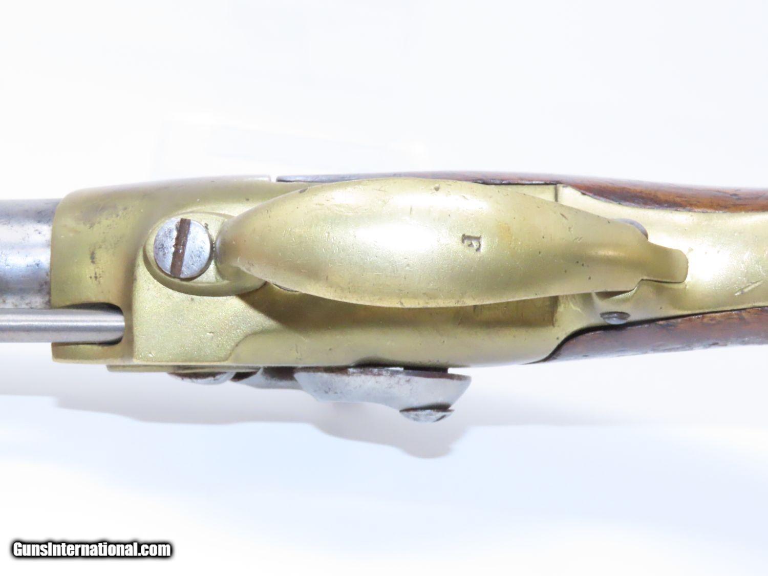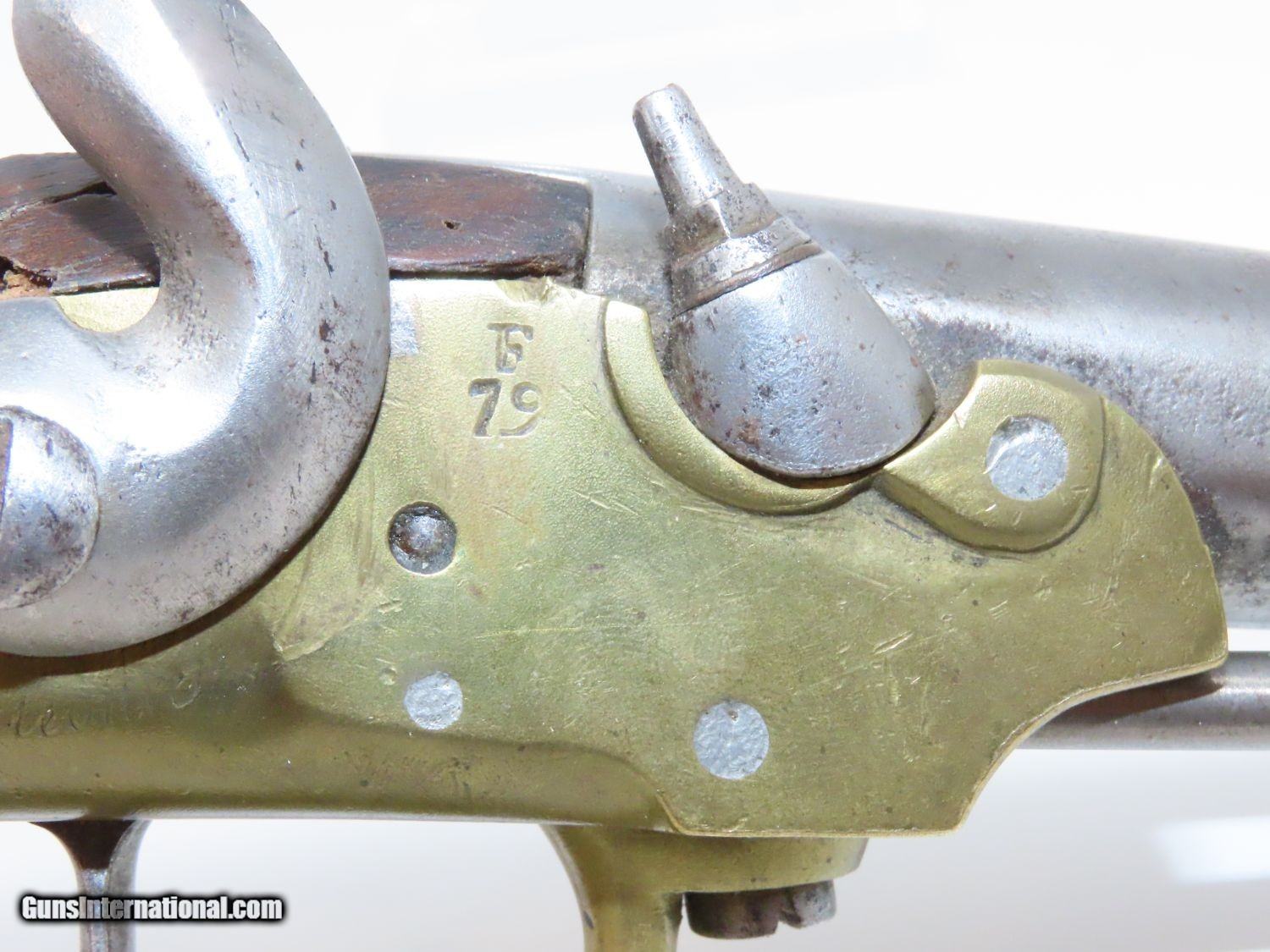 Description: REVOLUTIONARY WAR Period French CHARLEVILLE Model 1777 Pistol Converted French Military Sidearm Dated “[17]79”! Here we present an antique French Charleville Model 1777 Percussion Conversion Pistol, made at the armory at Charleville circa 1779. The Model 1777 is historically significant to the American Revolutionary War, as the French recognized the United States of America’s independence and sovereignty in 1778 and declared war on Britain as the fledgling nation’s ally. The French had begun sending arms and supplies in 1775, but secretly. With their new alliance, France provided the U.S. with loans, arms and even troops to fight on U.S. soil. Predecessor to the North & Cheney 1799 pistol, many French 1777 pistols came over from Europe during the American Revolutionary War, both with French troops and as part of the military aid supplied to the Revolution. After the American Revolution, the first U.S. martial pistol made and officially adopted in America was the incredibly scarce Model 1799, made by Simeon North & Elisha Cheney. The Model 1799 was patterned very closely to the Model 1777, with only a few changes. Only 2,000 1799s were made, making them incredibly rare and very expensive, valued in the tens of thousands. Finally, the Model 1777 is also historically significant to the French. At the time of this particular pistol’s making, in 1785, King Louis XVI was on the throne. In 1789, the French Revolution began and chaos ensued for the next 10 years, characterized by insurrections, mob violence, execution and assassination. King Louis XVI was executed in 1793. Simultaneously, France was at war with much of Europe. Eventually, Napoleon Bonaparte rose out of the ranks through coup and became emperor. This is one of the very few examples we have seen of one of these flintlock pistols converted to the percussion firing system, which was done circa the 1840s—this as a result of the mentality that nothing still useful gets wasted. The lock reads “CHARLEVILLE” and has “F/79” stamped just in front of the hammer as well as “79” stamped on the left side of the barrel—these dates of acceptance from 1779, which places this squarely inside the confines of the American Revolutionary War years of 1775-1783. The overall condition is good. The action is very strong. The bore is good. The stock is solid and stable regardless of the crack behind the breech. Whether you are a Franco-file, an American Patriot or want to own the pistol that the Model 1799 was designed upon, look no further. Here is an astounding amount of history in a small package. Own the original! This is a legitimate antique and not a reproduction. Barrel is 7-1/2 inches. Caliber: .69 Overall condition as seen in photos. Very Fast. Very Safe. FREE SHIPPING WORLDWIDE. Delivered directly to your door by express mail! Guaranteed AUTHENTIC & Includes CERTIFICATE OF AUTHENTICITY. ancestryguns $1895 #20157 SOLD Antique: Yes |