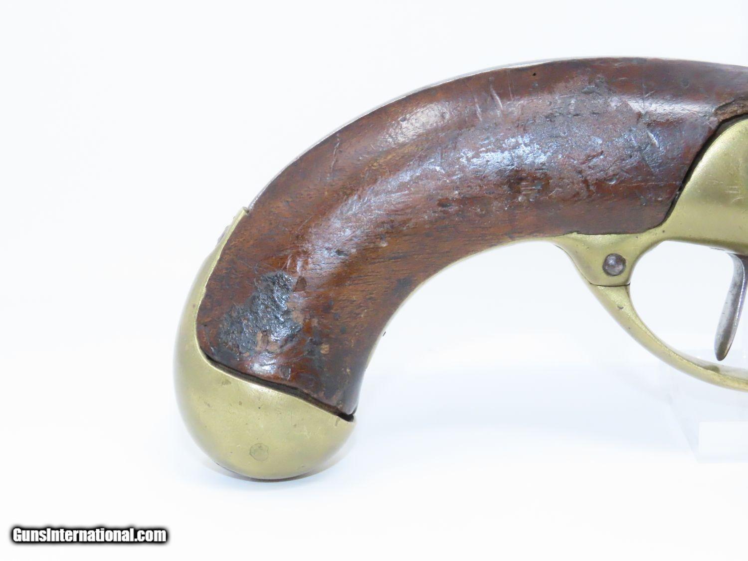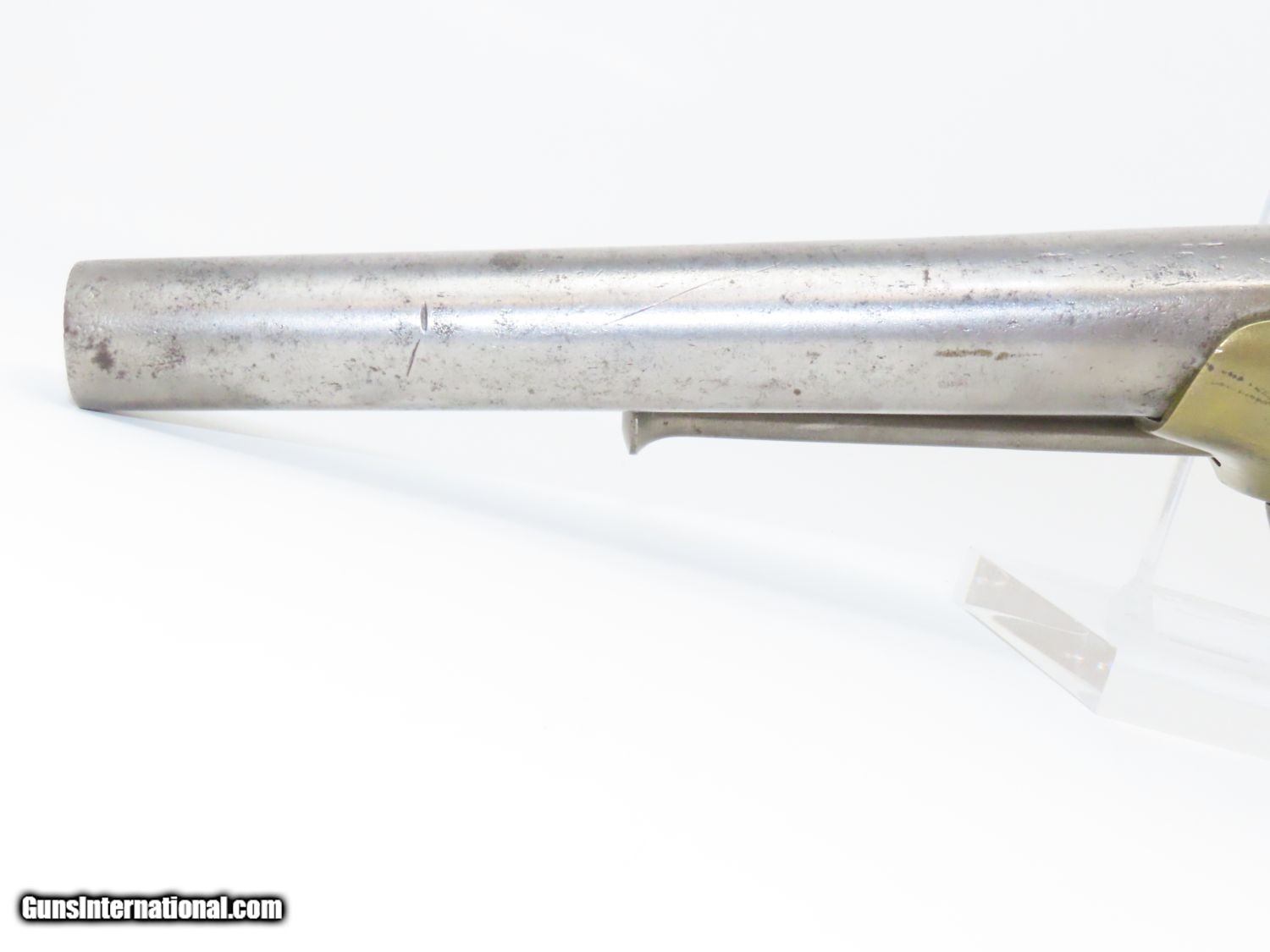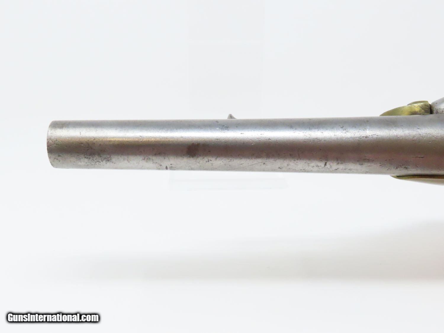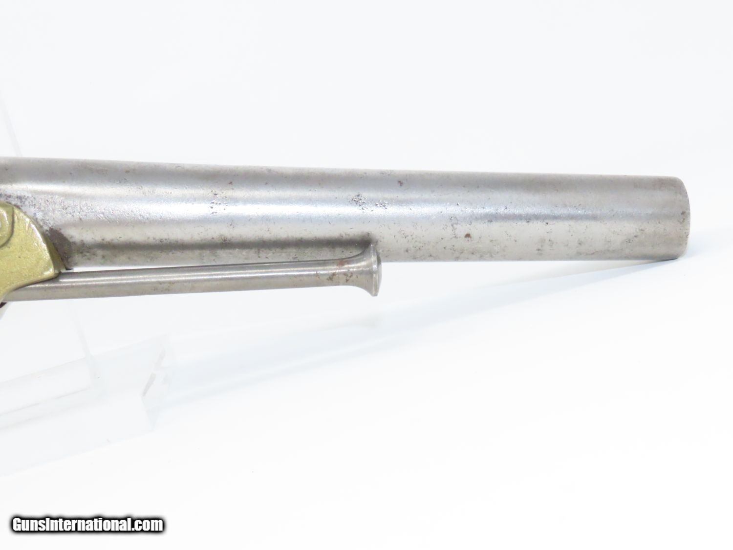 Description: REVOLUTIONARY WAR Period French CHARLEVILLE Model 1777 Pistol Converted French Military Sidearm Dated “[17]79”! Here we present an antique French Charleville Model 1777 Percussion Conversion Pistol, made at the armory at Charleville circa 1779. The Model 1777 is historically significant to the American Revolutionary War, as the French recognized the United States of America’s independence and sovereignty in 1778 and declared war on Britain as the fledgling nation’s ally. The French had begun sending arms and supplies in 1775, but secretly. With their new alliance, France provided the U.S. with loans, arms and even troops to fight on U.S. soil. Predecessor to the North & Cheney 1799 pistol, many French 1777 pistols came over from Europe during the American Revolutionary War, both with French troops and as part of the military aid supplied to the Revolution. After the American Revolution, the first U.S. martial pistol made and officially adopted in America was the incredibly scarce Model 1799, made by Simeon North & Elisha Cheney. The Model 1799 was patterned very closely to the Model 1777, with only a few changes. Only 2,000 1799s were made, making them incredibly rare and very expensive, valued in the tens of thousands. Finally, the Model 1777 is also historically significant to the French. At the time of this particular pistol’s making, in 1785, King Louis XVI was on the throne. In 1789, the French Revolution began and chaos ensued for the next 10 years, characterized by insurrections, mob violence, execution and assassination. King Louis XVI was executed in 1793. Simultaneously, France was at war with much of Europe. Eventually, Napoleon Bonaparte rose out of the ranks through coup and became emperor. This is one of the very few examples we have seen of one of these flintlock pistols converted to the percussion firing system, which was done circa the 1840s—this as a result of the mentality that nothing still useful gets wasted. The lock reads “CHARLEVILLE” and has “F/79” stamped just in front of the hammer as well as “79” stamped on the left side of the barrel—these dates of acceptance from 1779, which places this squarely inside the confines of the American Revolutionary War years of 1775-1783. The overall condition is good. The action is very strong. The bore is good. The stock is solid and stable regardless of the crack behind the breech. Whether you are a Franco-file, an American Patriot or want to own the pistol that the Model 1799 was designed upon, look no further. Here is an astounding amount of history in a small package. Own the original! This is a legitimate antique and not a reproduction. Barrel is 7-1/2 inches. Caliber: .69 Overall condition as seen in photos. Very Fast. Very Safe. FREE SHIPPING WORLDWIDE. Delivered directly to your door by express mail! Guaranteed AUTHENTIC & Includes CERTIFICATE OF AUTHENTICITY. ancestryguns $1895 #20157 SOLD Antique: Yes |