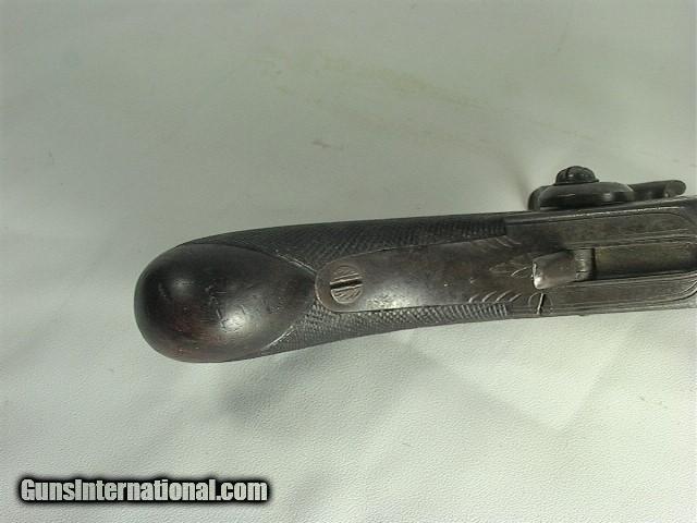 Description: RIVIERE LONDON 45 CALIBER SINGLE SHOT DERRINGER, 2” BARREL, SMOOTH PATINA, SCROLL ENGRAVED FRAME, HAMMER AND END OF BARREL, NICE FINELY CHECKERED GRIPS, CLEAN BORE, FLIP DOWN TRIGGER SOLD Antique: Yes |