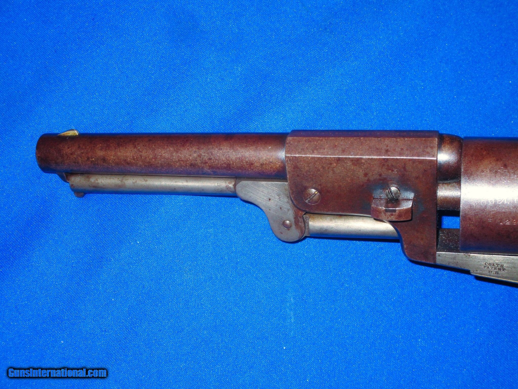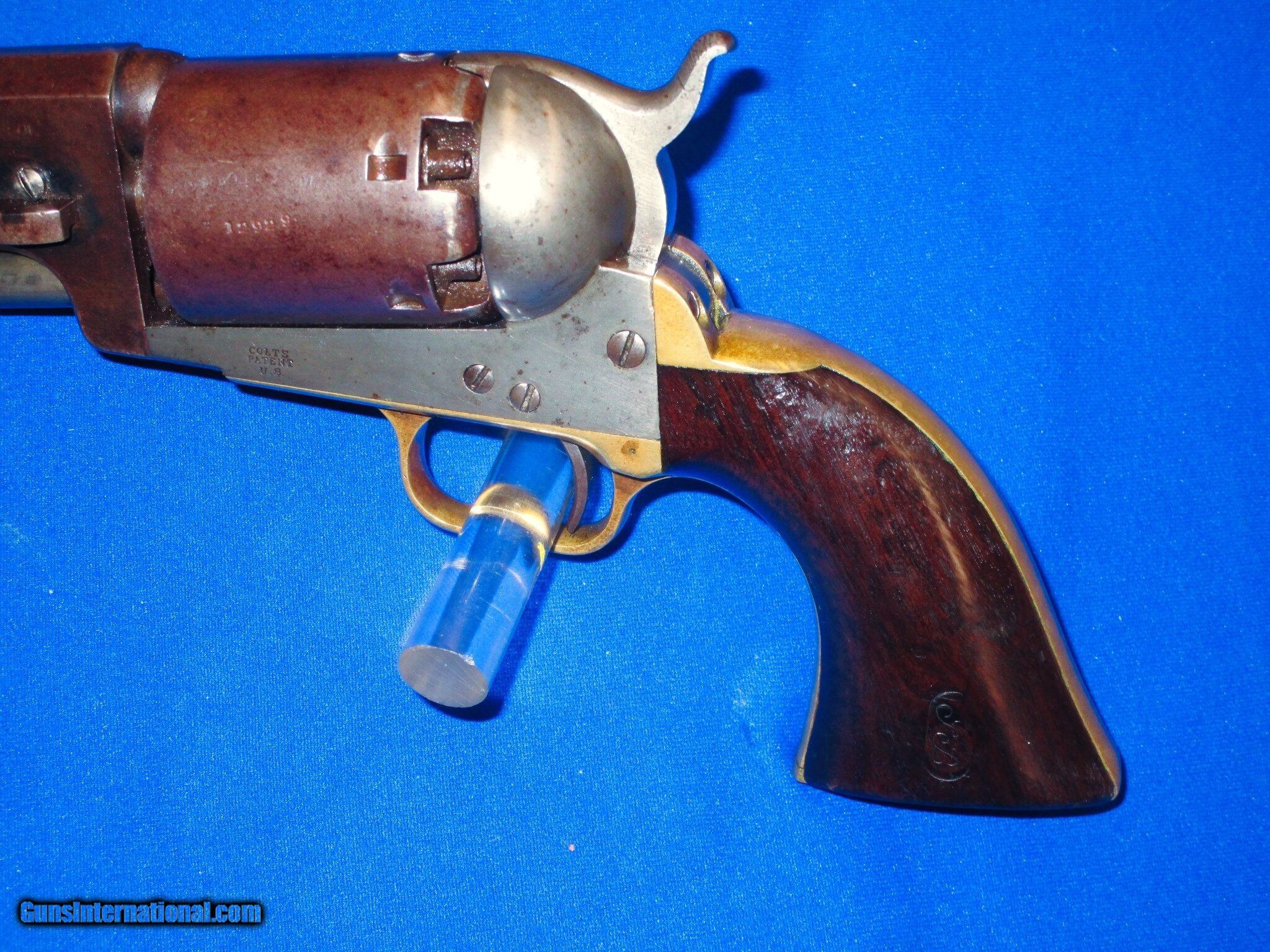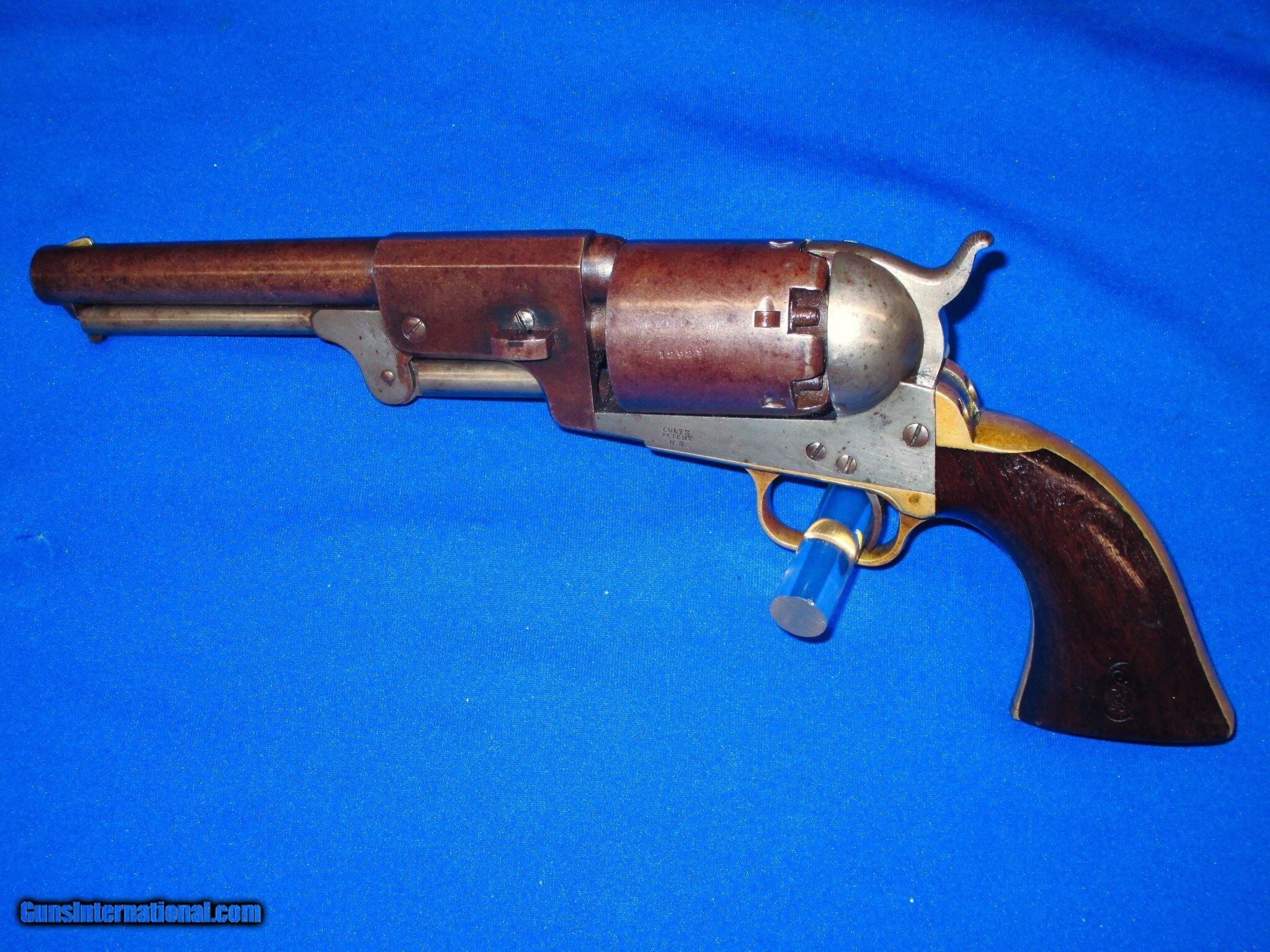 Description: Scarce U.S. Civil War Military Issued Percussion Colt 3rd Model Dragoon Revolver In Fine Untouched Condition. Serial #12,929, all matching numbers including the wedge. Made in 1853. The gun has fine metal and markings throughout including a full cylinder scene. It is fully U.S. Sub-Inspected. The barrel & cylinder have an even natural light brown patina throughout them with hints of color in spots. The frame, hammer, and loading lever show mousey case colors on them. The contrast in the colors in the gun are from the flash on the camera. The frame and loading lever are not as light as they appear. The brass trigger guard and backstrap are fine and untouched. The original grips are excellent throughout with clear vertical U.S. Inspectors Cartouches on both sides of them. The gun has a fine bore and very tight action. This Is a Fine looking Example Of A U.S. Civil War Military Issued Percussion Colt 3rd Model Dragoon Revolver! SOLD Manufacturer: Colt Model: 3rd Model Dragoon Serial Number: 12929 Condition: Fine Untouched Metal Condition: Nice Untouched Wood Condition: Fine Untouched Bore Condition: Fine Untouched |