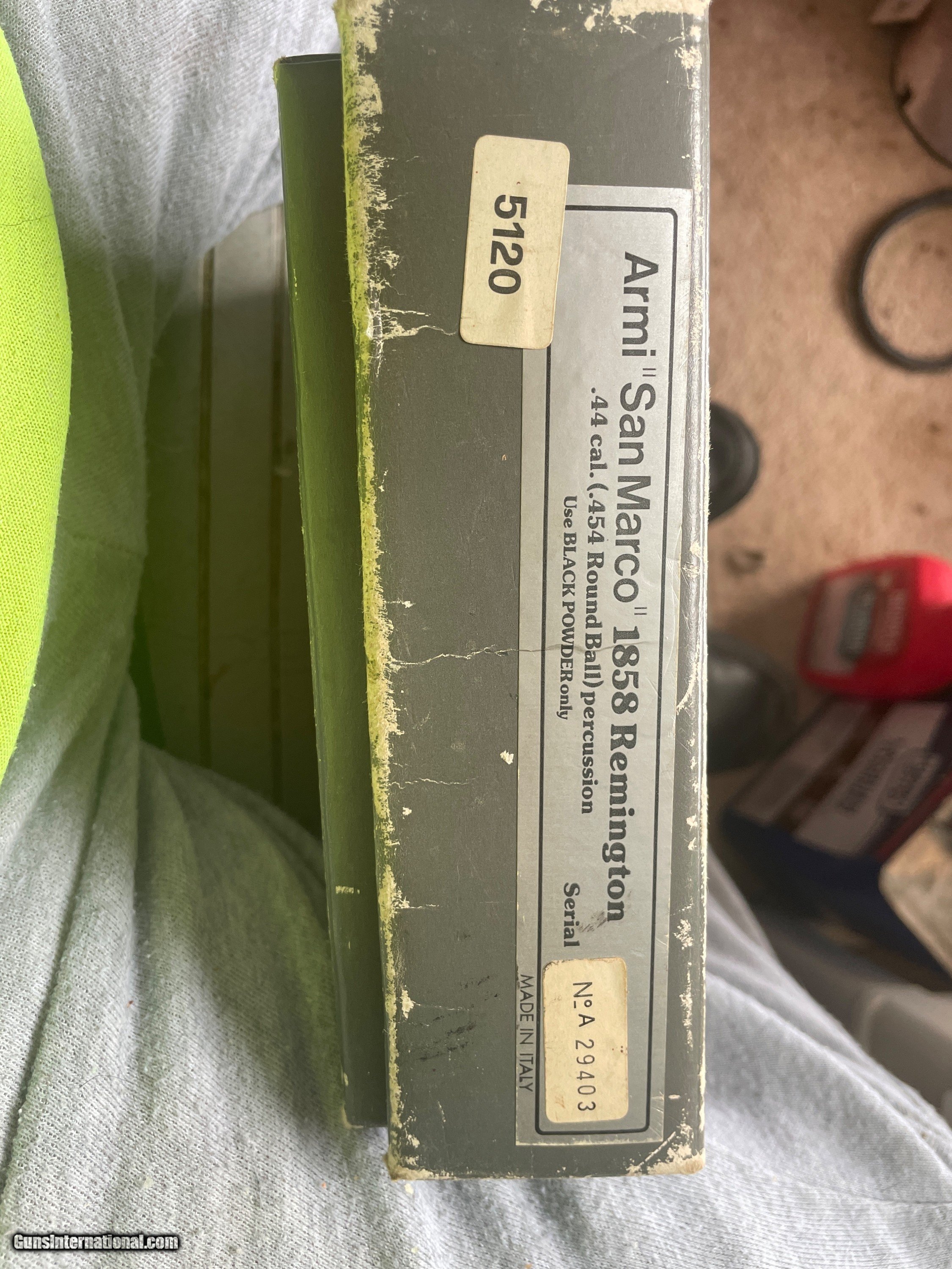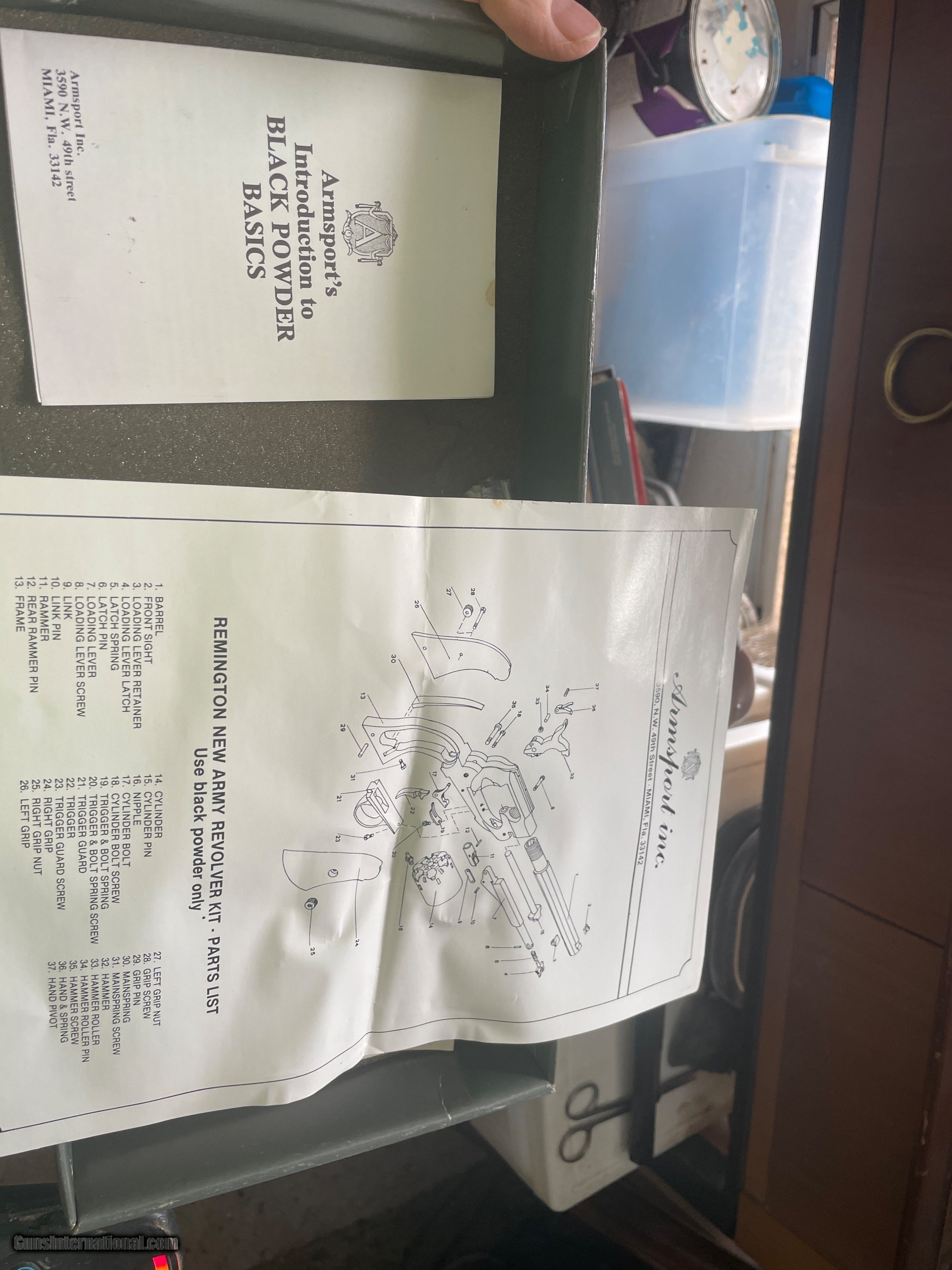 Description: Here's a 44 percussion pistol made by army never been fired still in the original box even includes a few round balls. this is a copy of the 1858 Remington made in Italy. I've had this gun for probably 30 years. It's been out of box a couple times but never fired. shipping is $30 if required in your state to have an FFL please send me a copy if you purchase it. Manufacturer: Armsport Model: 1858 Remington Serial Number: A29403 Barrel Length: 7.5 Chambers: 6 Condition: New Metal Condition: New Wood Condition: New Bore Condition: New unfired Price: $310.00 Shipping: $30.00 Buy Now Pay with