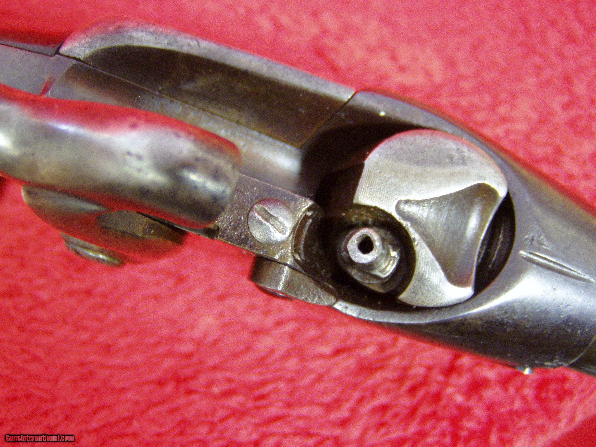 Description: THis is a very nice collectible Sharps Single Shot Pistol, Small Frame , First Model,.31 Caliber. Has a 5" barrel, with a strong five grooved, barrel. Bore is very good. Metal is all brown to plum patina. Light freckling on some areas. Action is strong and everything works like it should. Has small blade front sight and groove rear sight. Has a single adjustible trigger. Has Walnut grips with some of original varnish remaining. Grips show handling marks but are solid with no losses. Serial number #144 is marked on lever and on the backstrap. It is, also marked, in an oval panel, on left sidplate: "SHARPS PATENT / ARMS MFRD / FAIR MOUNT / PHILA. PA. ". These were made for only one year. Period of production 1855 to 1856. I accept USPS Money Orders or Bank Cashier's Check. Will accept Personal Check, with shipping hold .Buyer pays $25.00 shipping to lower 48 states. International shipping varies as to destination. Layaway available, ANTIQUE SOLD Antique: Yes Manufacturer: SHARPS Model: FIRST MODEL Serial Number: Serial #144 Caliber Info: .31 Bore: 5 inch Chambers: SINGLE Ejectors: lever action Condition: Very Good Metal Condition: Very Good Wood Condition: solid, very good Bore Condition: Very Good Barrels: ONE Barrel Type: round Action: Lever Action Triggers: one Finish: PATINA Sights: open Manufacture Date: 1855-1856 |