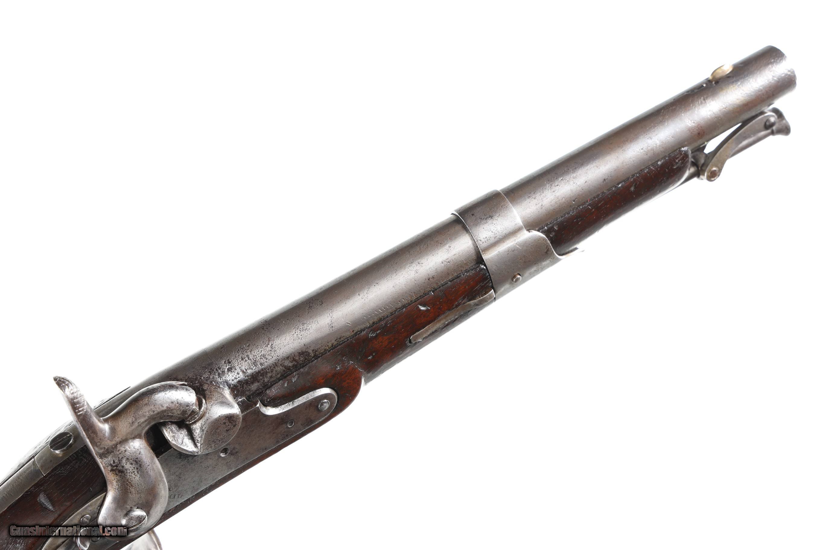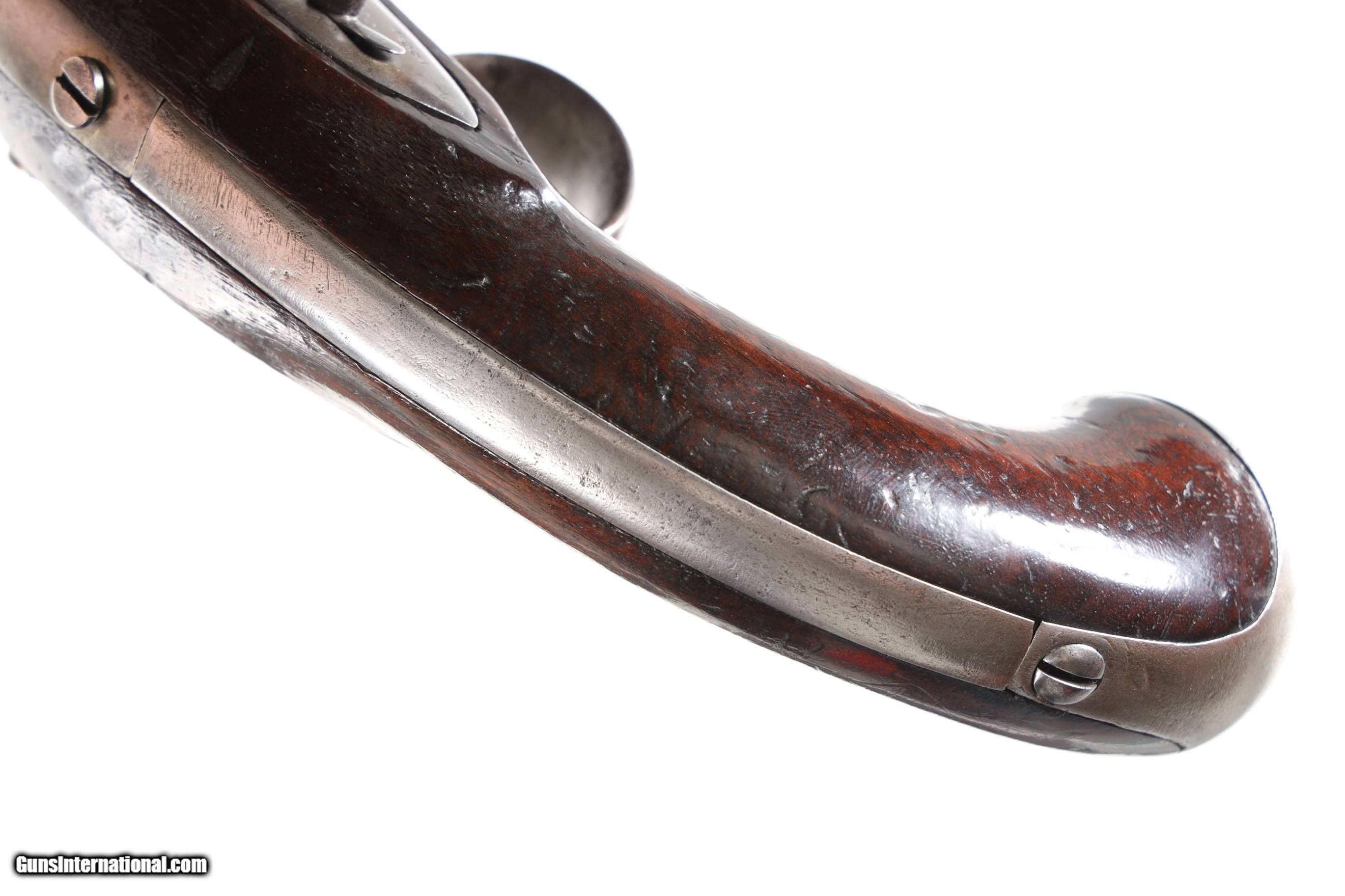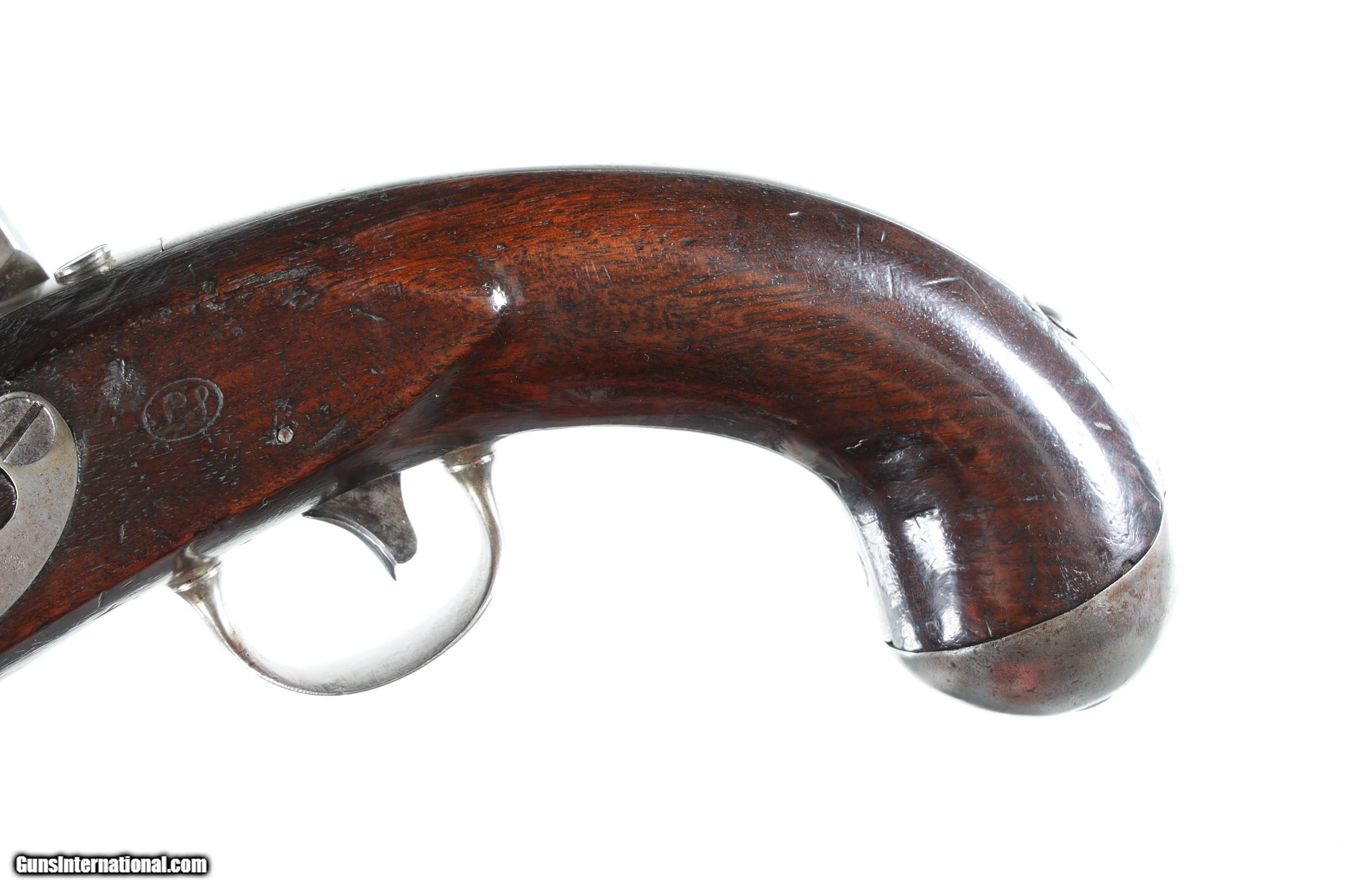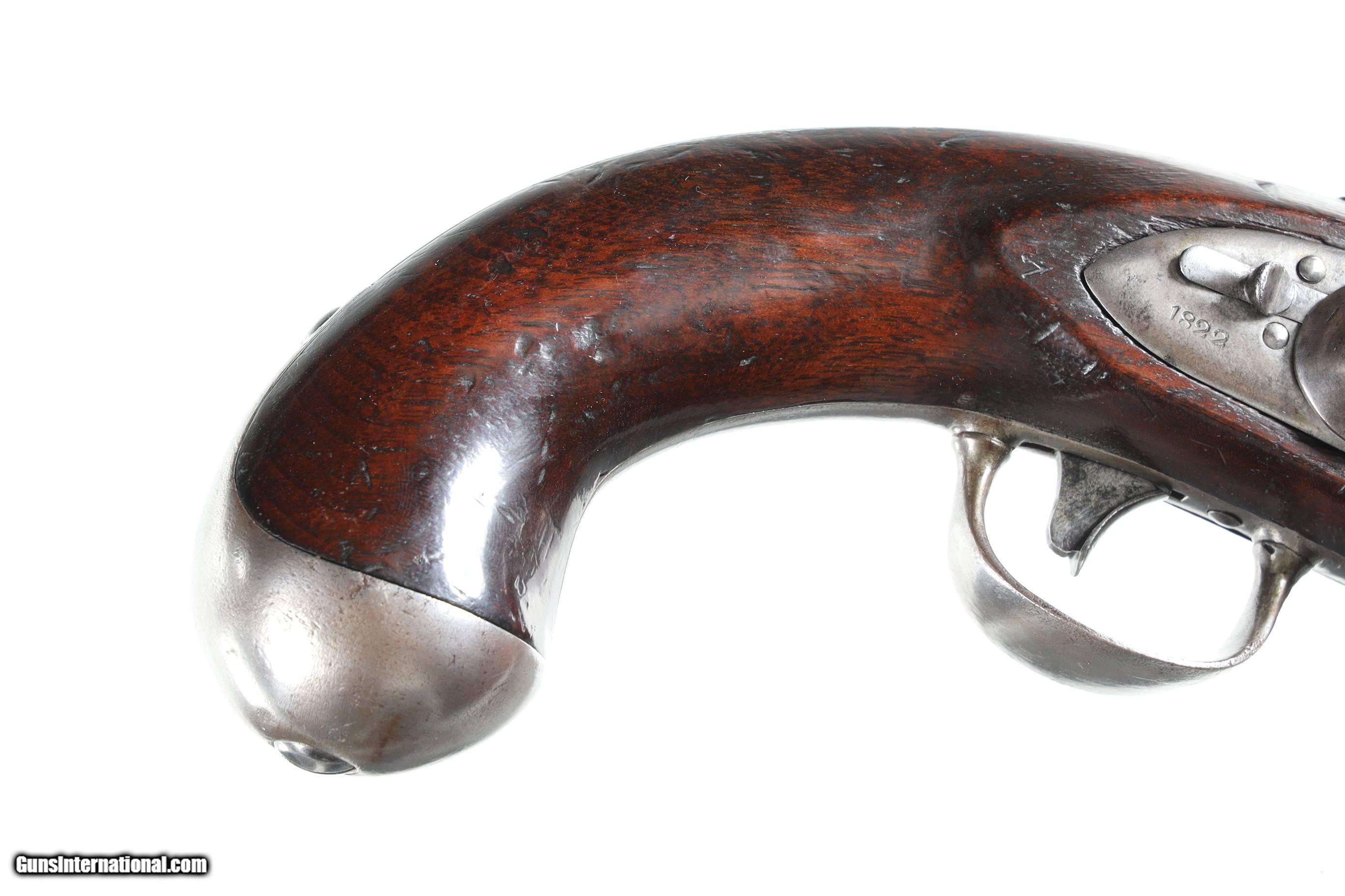 Description: Iron mounted 54 Cal, smooth bore pistol produced by Simeon North and dated 1822. 1st American Martial pistol ith swivel rammer. Sliding hammer safety and one piece oil finished walnut stock. Defined oval Cartouche on left side of LS in oval. Arsenalconverted to percussion with probable Civil War use as these early percussions were used extensively by State Militias. Condion, Very good with iron being bright. Bore is good with some darkness. Action operates properly. Stock remains full sized with markings being very light and probably thinned at time of conversion. Antique • Free Shipping, No Credit Card Fees. • Lay-a-way available for this firearm. • 1/3 Down, a 1/3 in 30 Days, 1/3 in 60 Days. SOLD Antique: Yes Manufacturer: Simeon North Model: 1819 Serial Number: NSN Barrel Length: 10 |
