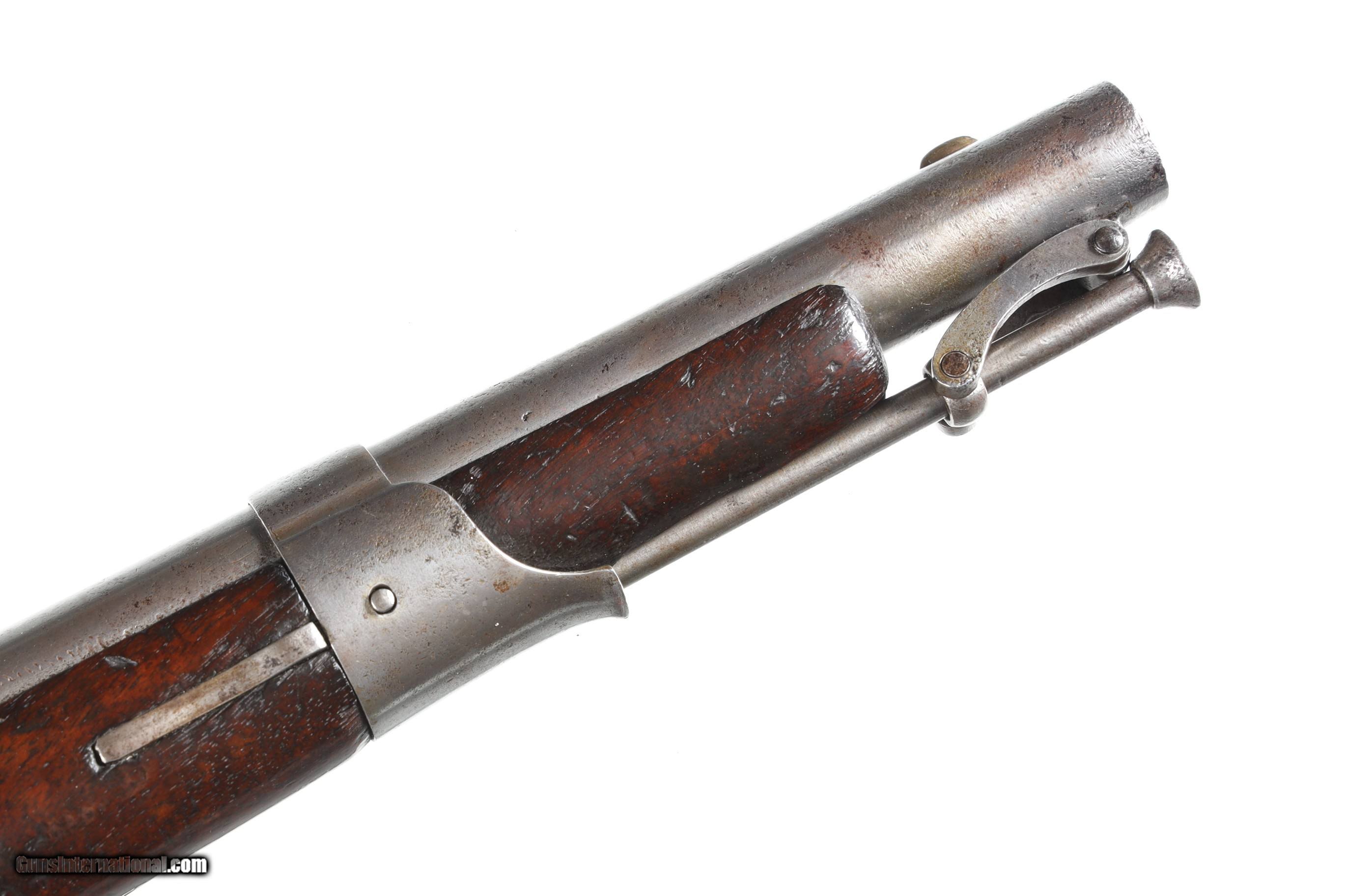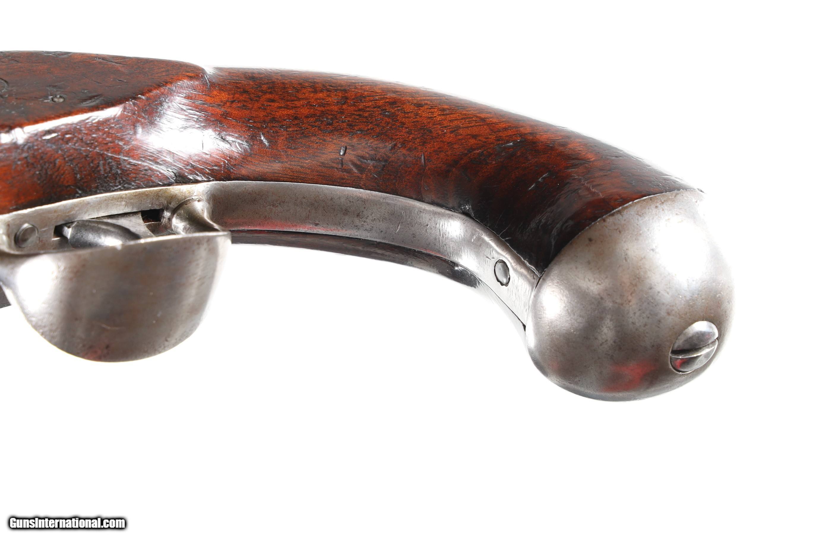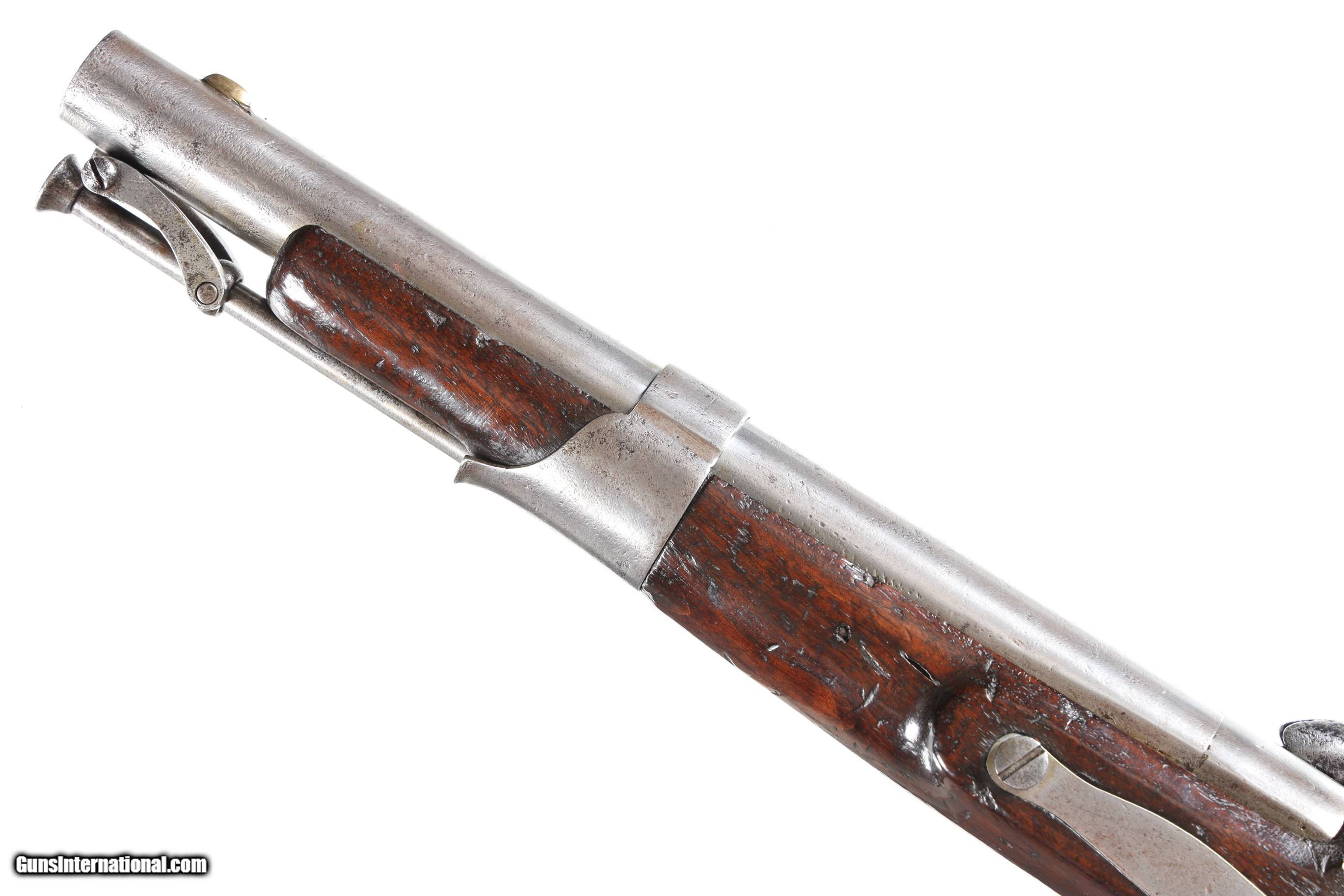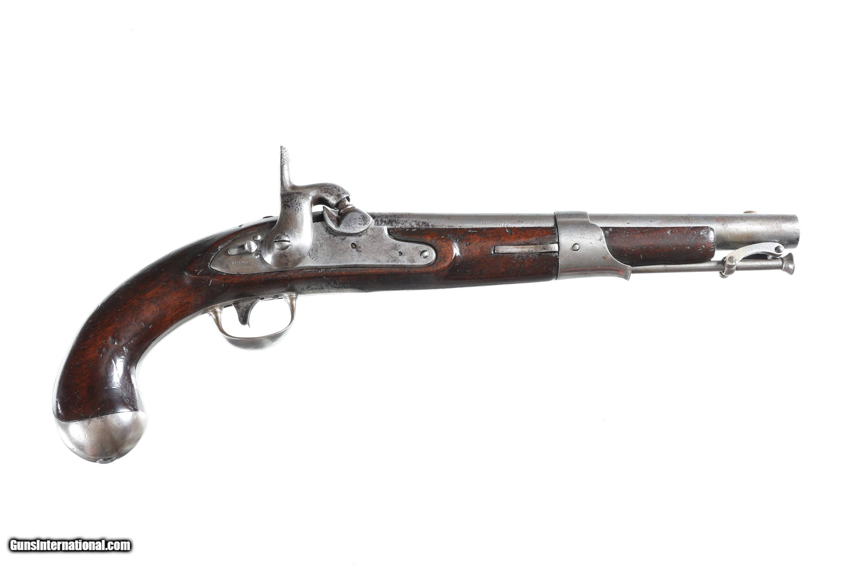 Description: Iron mounted 54 Cal, smooth bore pistol produced by Simeon North and dated 1822. 1st American Martial pistol ith swivel rammer. Sliding hammer safety and one piece oil finished walnut stock. Defined oval Cartouche on left side of LS in oval. Arsenalconverted to percussion with probable Civil War use as these early percussions were used extensively by State Militias. Condion, Very good with iron being bright. Bore is good with some darkness. Action operates properly. Stock remains full sized with markings being very light and probably thinned at time of conversion. Antique • Free Shipping, No Credit Card Fees. • Lay-a-way available for this firearm. • 1/3 Down, a 1/3 in 30 Days, 1/3 in 60 Days. SOLD Antique: Yes Manufacturer: Simeon North Model: 1819 Serial Number: NSN Barrel Length: 10 |
