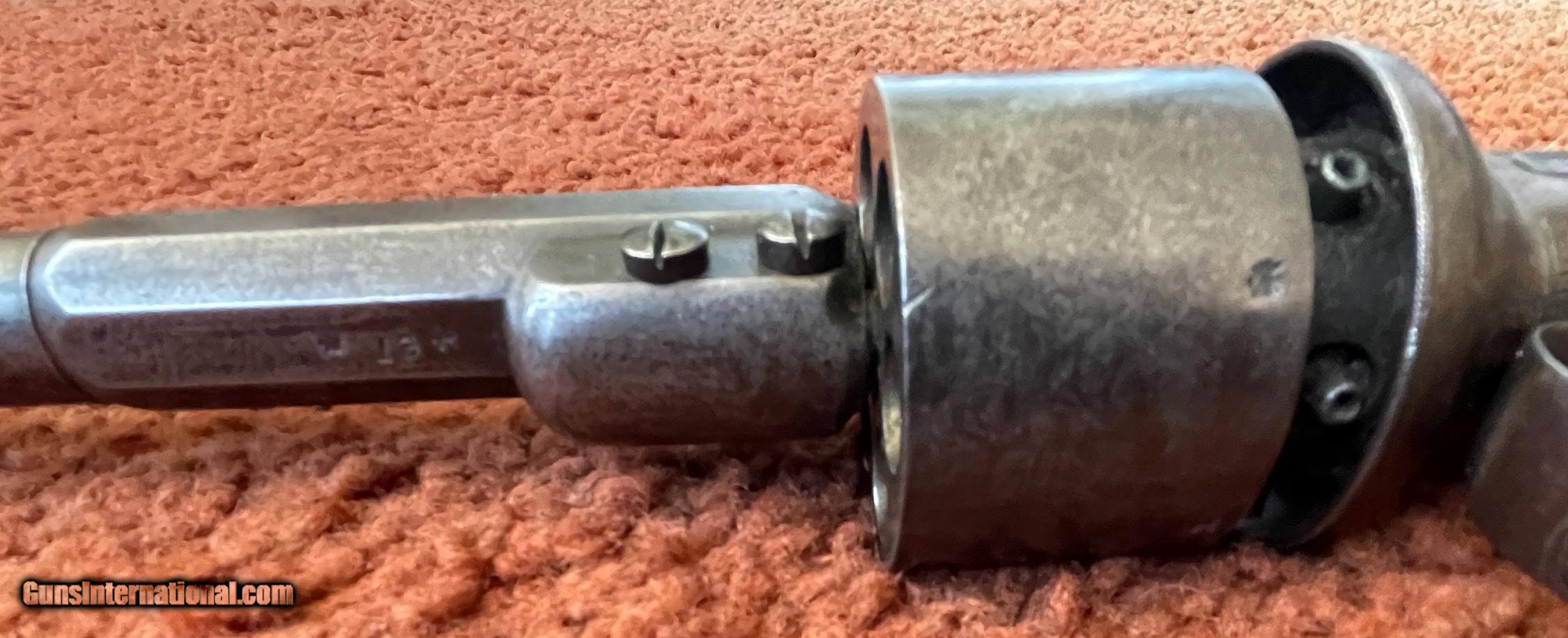 Description: Thomas Kerslake Baker worked in London 1845-1853 at 88 Fleet Street. The action is crisp but it appears the safety on left side does not function. The bore has stong rifling but has some roughness. A good honest untouched patinaed example. The bore measures .44" SOLD Antique: Yes Manufacturer: Thomas Kerslake Baker Model: Transitional Revolver Serial Number: 2251 Barrel Length: 5.5 |