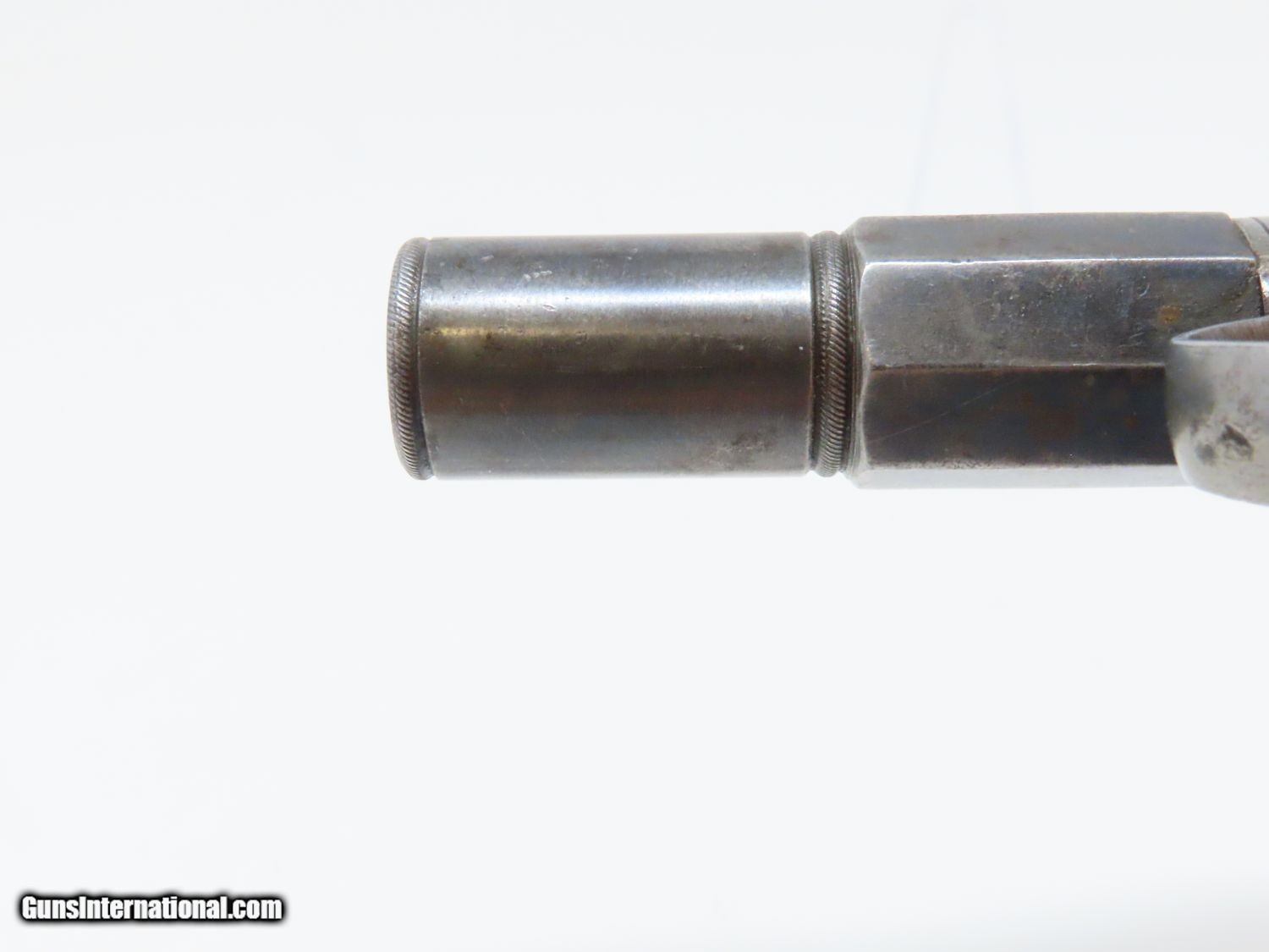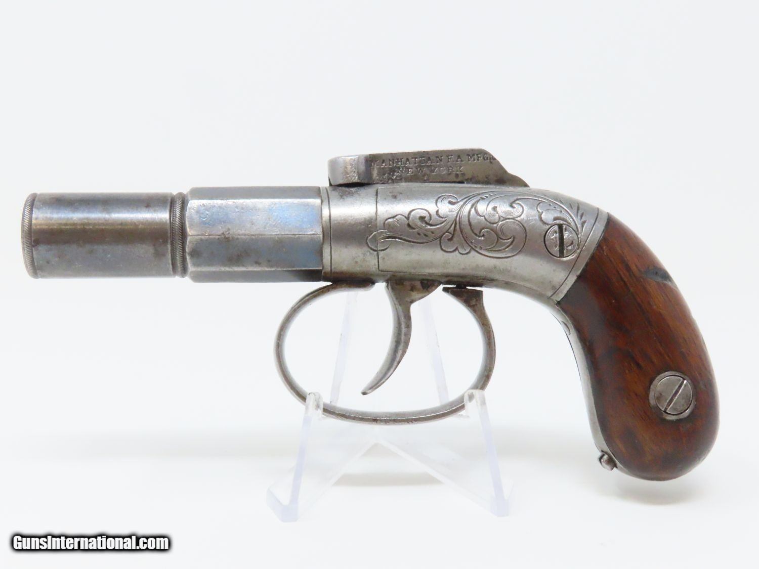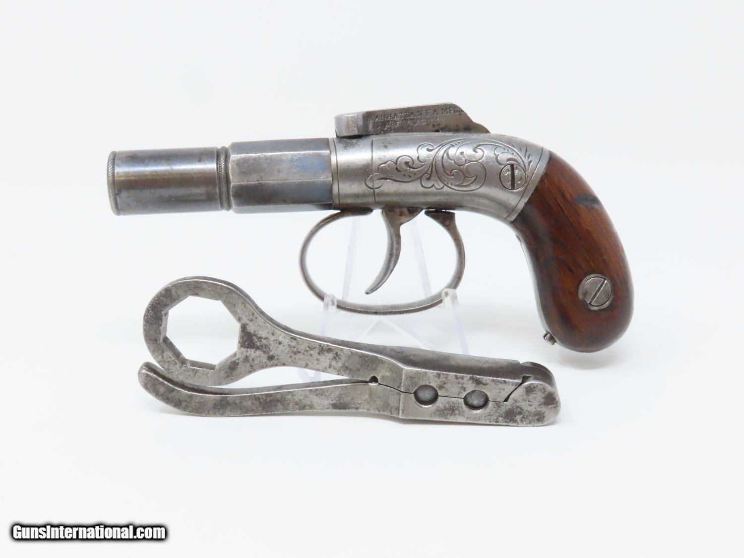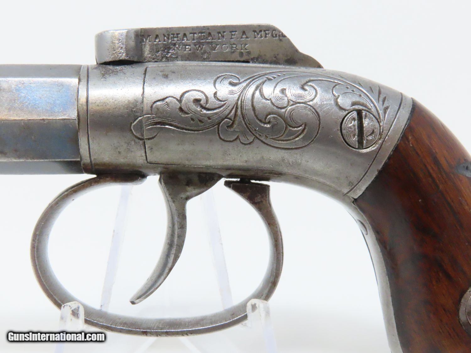 Description: SMALL Double Action MANHATTAN BAR HAMMER .31 Cal Pistol Antique Single Shot With BARREL WRENCH & BALL MOLD Here we present an antique Manhattan Arms Company Bar Hammer Percussion Pistol, made in Norwich, Connecticut circa 1856-59. The Double Action Bar Hammer single-shot pistol marked Manhattan Fire Arms Manufacturing Company's entry into the pistol-making business in early 1856. The Double Action Bar Hammer made by Manhattan has a distinctive barrel that is half round and half octagon. Even though this pistol was the first effort by Manhattan to manufacture pistols, they had already decided to feature engraving from the factory. The bar hammer is marked “MANHATTAN F.A. MFG. CO./NEW YORK” The Manhattan Bar Hammer single shot pistols were manufactured in several different calibers, .31, .34, and .36. The barrel lengths may be 2 to 4 inches in length. The Bar Hammer single shot Manhattan pistols are among the rarest of Manhattan handguns. The overall condition is fine. The action is strong and tight. The bore is in great shape. The markings are clear. Original blue finish. This example includes a barrel wrench and ball mold that’s in very good condition. A handsome little piece that can fit into any collection! Own the original! This is a legitimate antique and not a reproduction. Barrel is 2 inches. Caliber: .31 Percussion Overall condition as seen in photos. Very Fast. Very Safe. FREE SHIPPING WORLDWIDE. Delivered directly to your door by express mail! Guaranteed AUTHENTIC & Includes CERTIFICATE OF AUTHENTICITY. ancestryguns $1350 #20285 SOLD Antique: Yes |