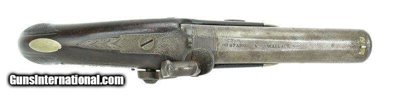 Description: Spang & Wallace Percussion Pocket Pistol. Made circa 1850. .41 Caliber with a 4” barrel. Markings are all clear. Top of the barrel is marked “SPANG & WALLACE” and the lock is marked “SPANG & WALLACE/ PHIL. All engraving is nice and sharp. Metal has a light gray patina. Nice looking Philadelphia gun! SOLD Antique: Yes |