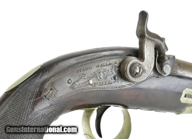 Spang & Wallace Percussion Pocket Pistol. Made circa 1850. .41 Caliber with a 4” barrel. Markings are all clear. Top of the barrel is marked “SPANG & WALLACE” and the lock is marked “SPANG & WALLACE/ PHIL. All engraving is nice and sharp. Metal has a light gray patina. Nice looking Philadelphia gun!