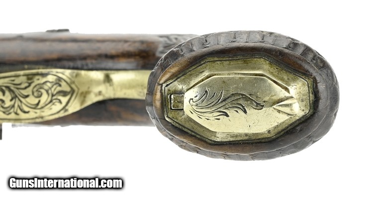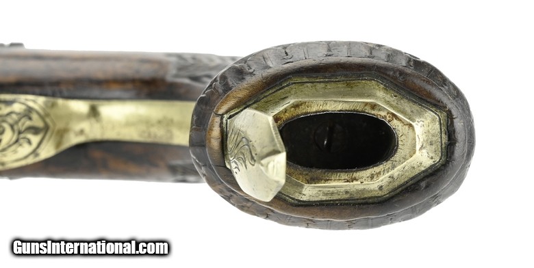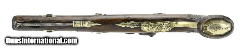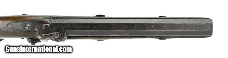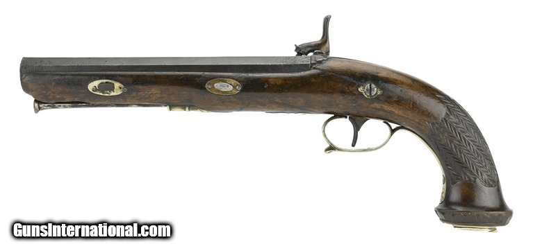 Description: Spanish Percussion Pistol. Marked J.M. Happholdt. This is a Spanish percussion pistol with a back-action lock marked J.M. Happholdt. Happholdt was a quality maker from South Carolina who made guns from the 1830s-1860s. This gun is spuriously marked “J.M. Happholdt”. This gun is in .70 caliber with a 8 ½” barrel. Metal has a dark brown almost black platina. Butt has a cap trap. SOLD Antique: Yes |