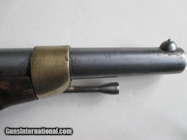 Description: For sale an original French Model 1822 Flintlock which was converted to Percussion in the early part of 1840's. It is in 70 caliber as was the muskets at the time. This pistol would have seen a lot of use in Europe at the time. Somehow it found its way into the United States. It was made in the French armory of St Etienne. This gun functions well but the nipple which can be replaced shows a lot of wear. The stock was cracked and professionally repaired by gluing and pinned. If you look close you can see the crack and the pins. A great collector piece but is not sold to shoot. The ramrod is a replacement. The price reflects the repaired stock. Well marked with some pitting see photos. Shipping cost is only for the lower 48 states. I have only recently started to sell on guns International. I have however been selling on Gun since 2006 under the log in name of vankeurenmj with over 119 items bought and sold with a feedback rating of 100%. If interested in one of the items I am going to sell please check on my selling history with to see how I do business. As with any antique if you have any plans on shooting it please have it checked by a Gunsmith. Very few of the weapons I own do I ever shoot. Also please make sure that it is legal to own this weapon in your state. SOLD Antique: Yes Manufacturer: St Etienne Model: 1822 Serial Number: None Caliber Info: 70 Condition: far to good Metal Condition: Fair to good |