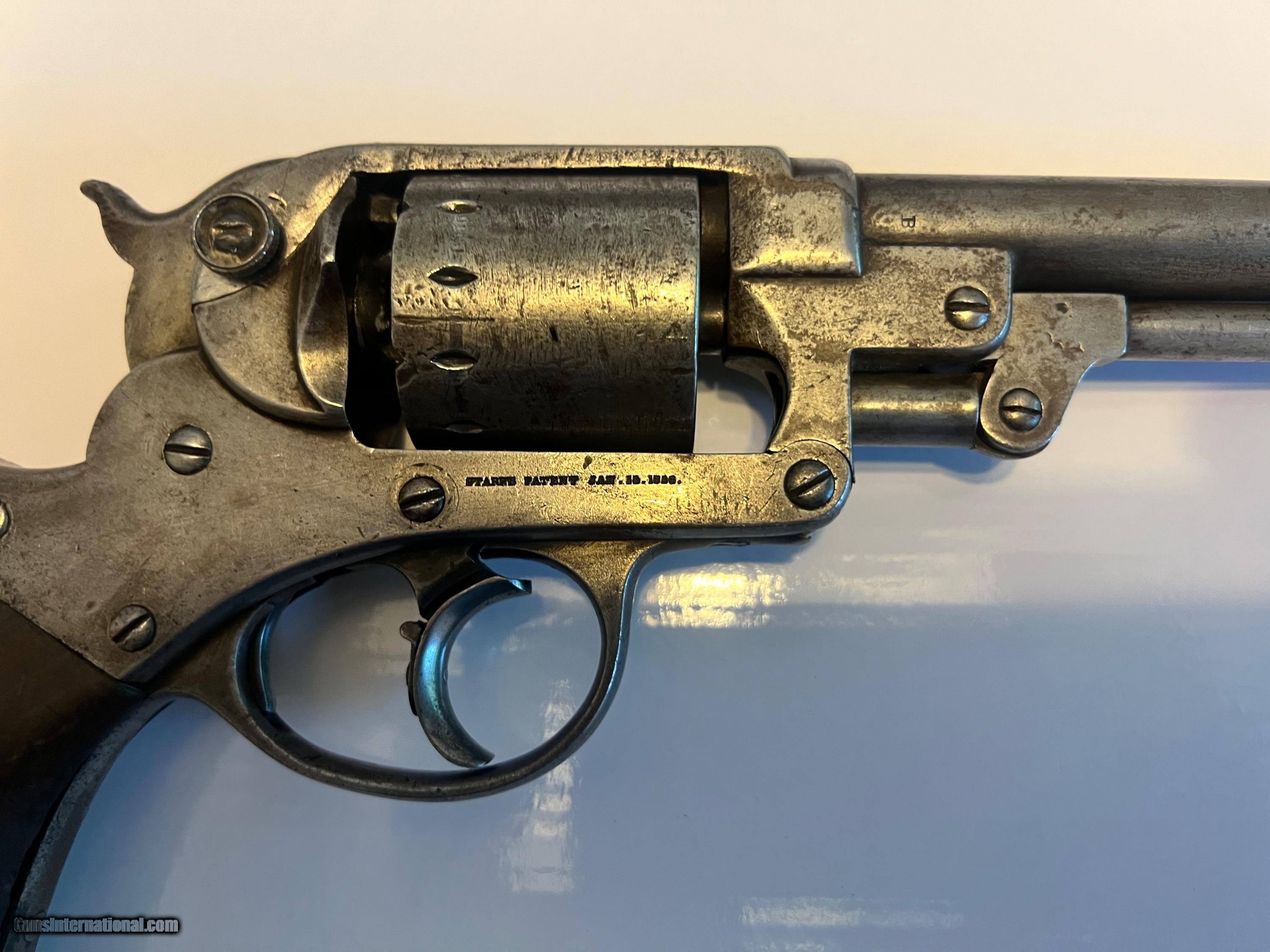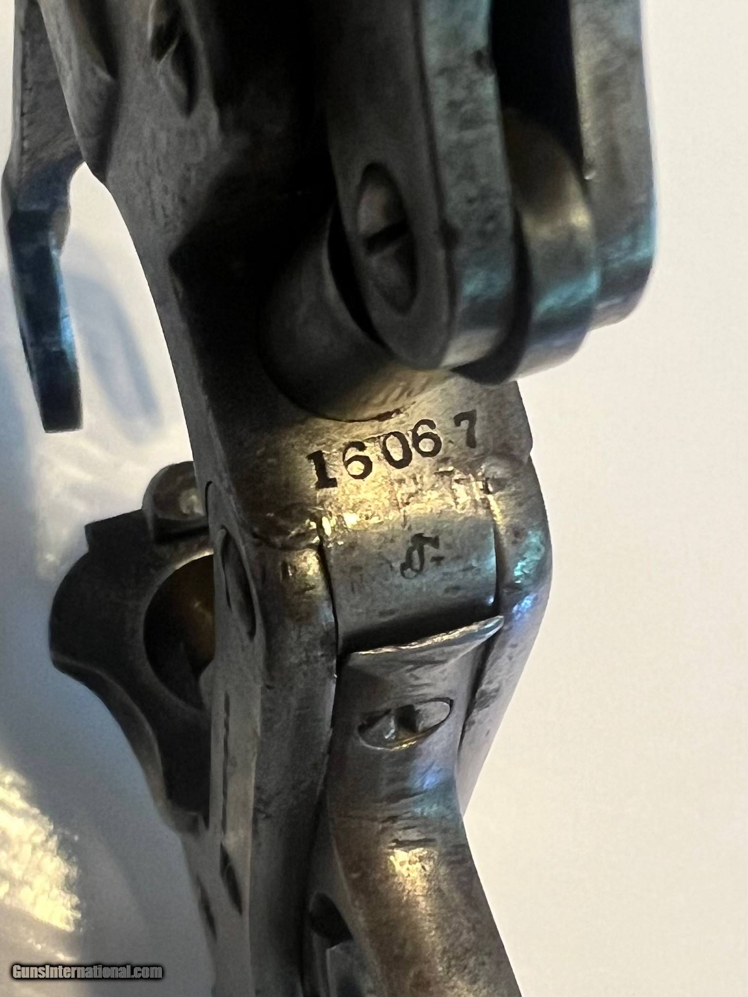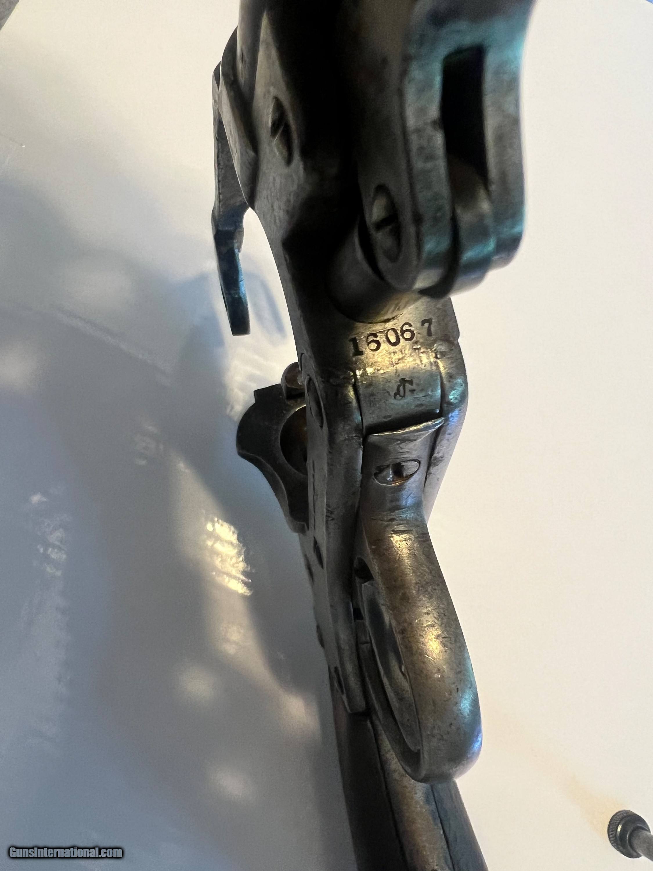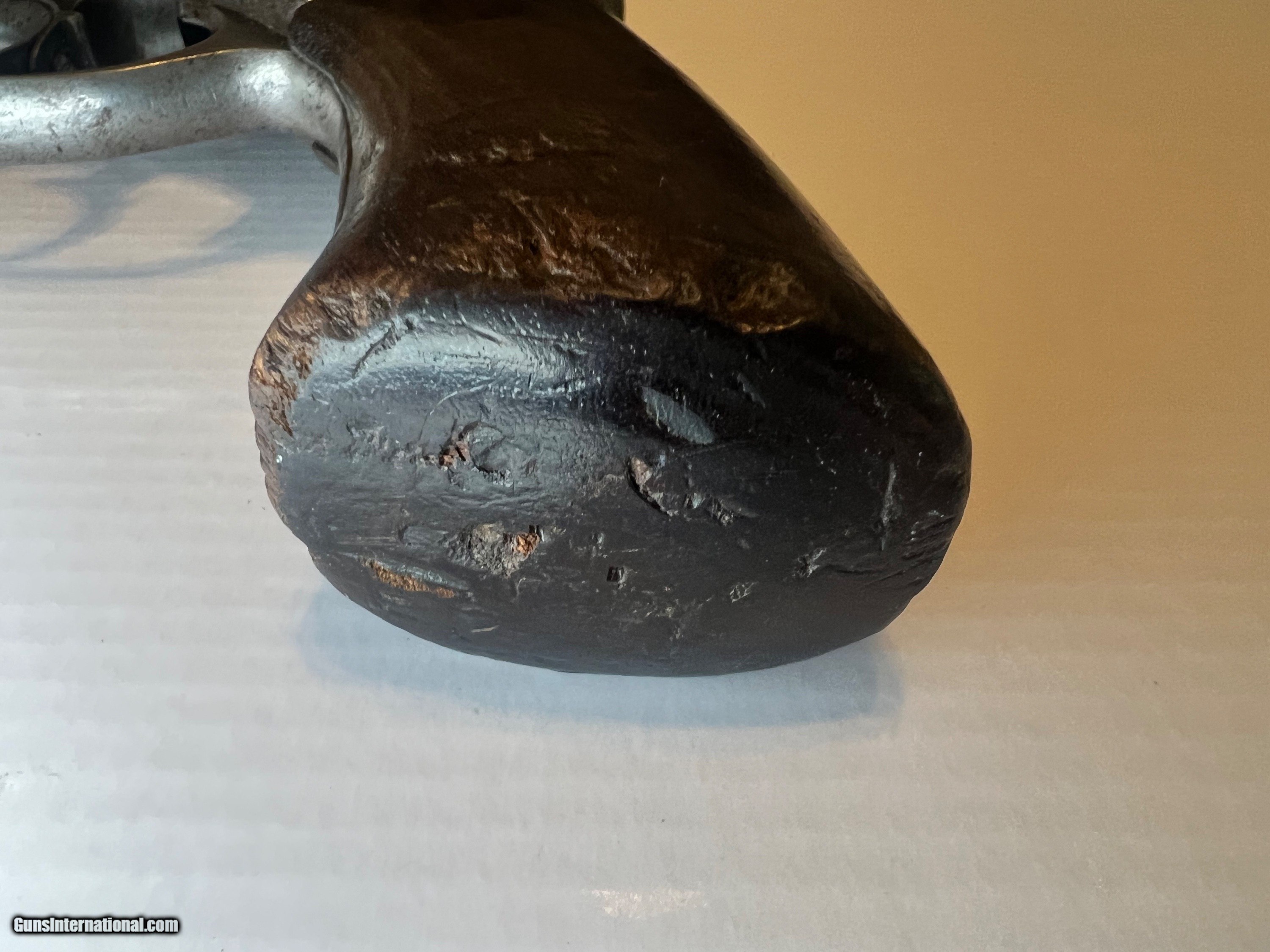 Description: Model 1858 DA Starr Perxuasion Revolver. Matching serials numbers. Grips have wear and chips. Two chambers of the cylinder have been converted to 44 at some point in history (See Pictures); all nipples have been removed during this process I would have to assume. The partial conversion causes the cylinder not to appropriately cycle when trigger is pulled. Please see pictures for condition. This is a handgun that has many stories to tell to say the least. Condition is as found. See pictures for condition. Weapon sold as antique not intended for firing. SOLD Antique: Yes Handgun Caliber: .44 Manufacturer: Starr Arms Model: M1858 Double Action Serial Number: 16067 Barrel Length: 6” Chambers: 2 Chambers have been converted. Condition: Fair Metal Condition: Fair Wood Condition: Worn Grips |