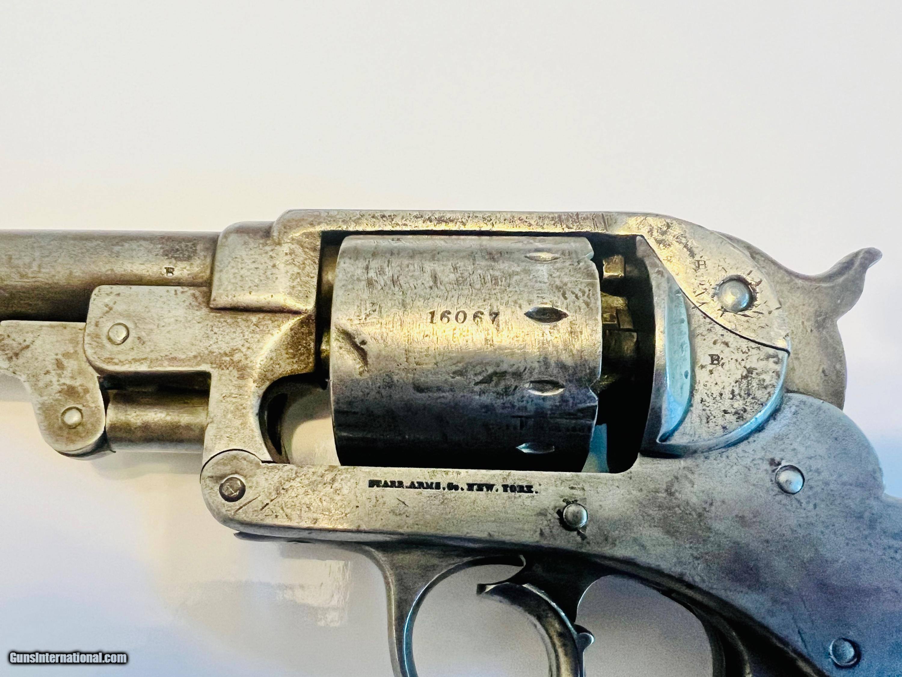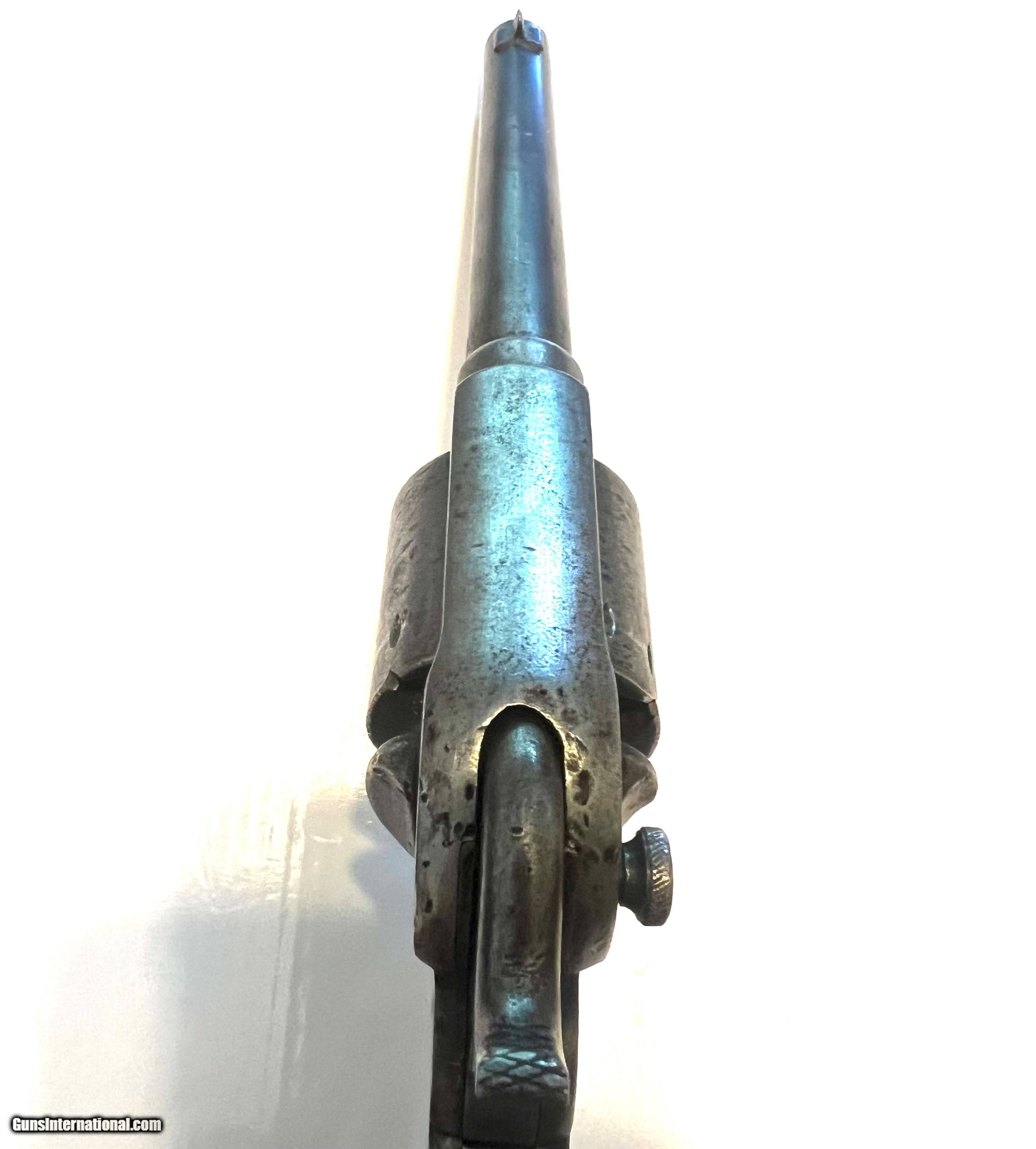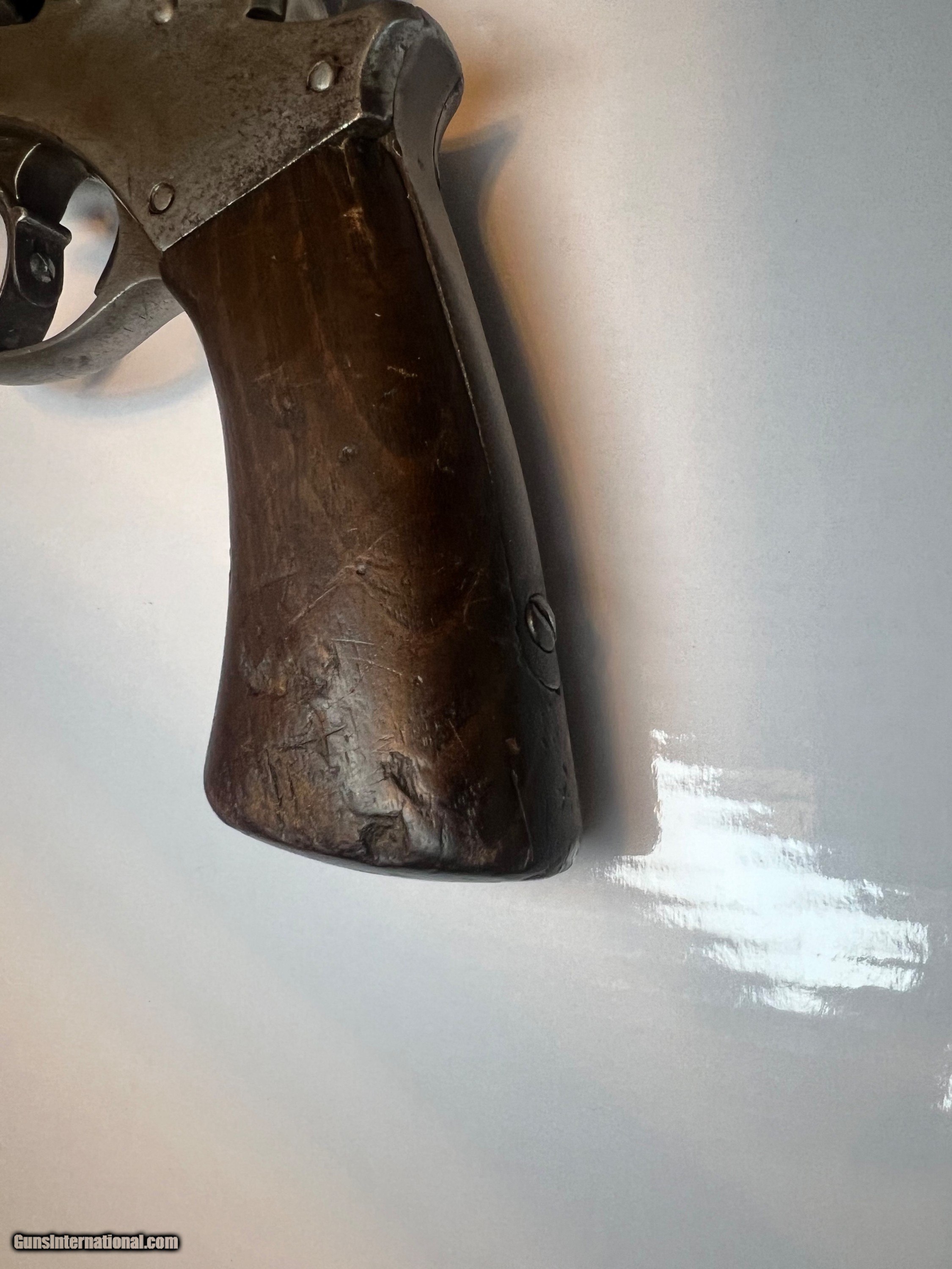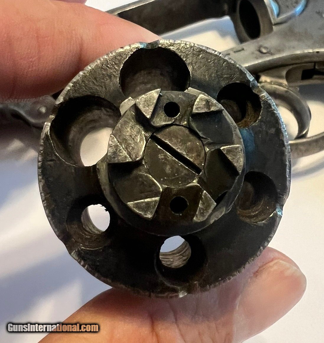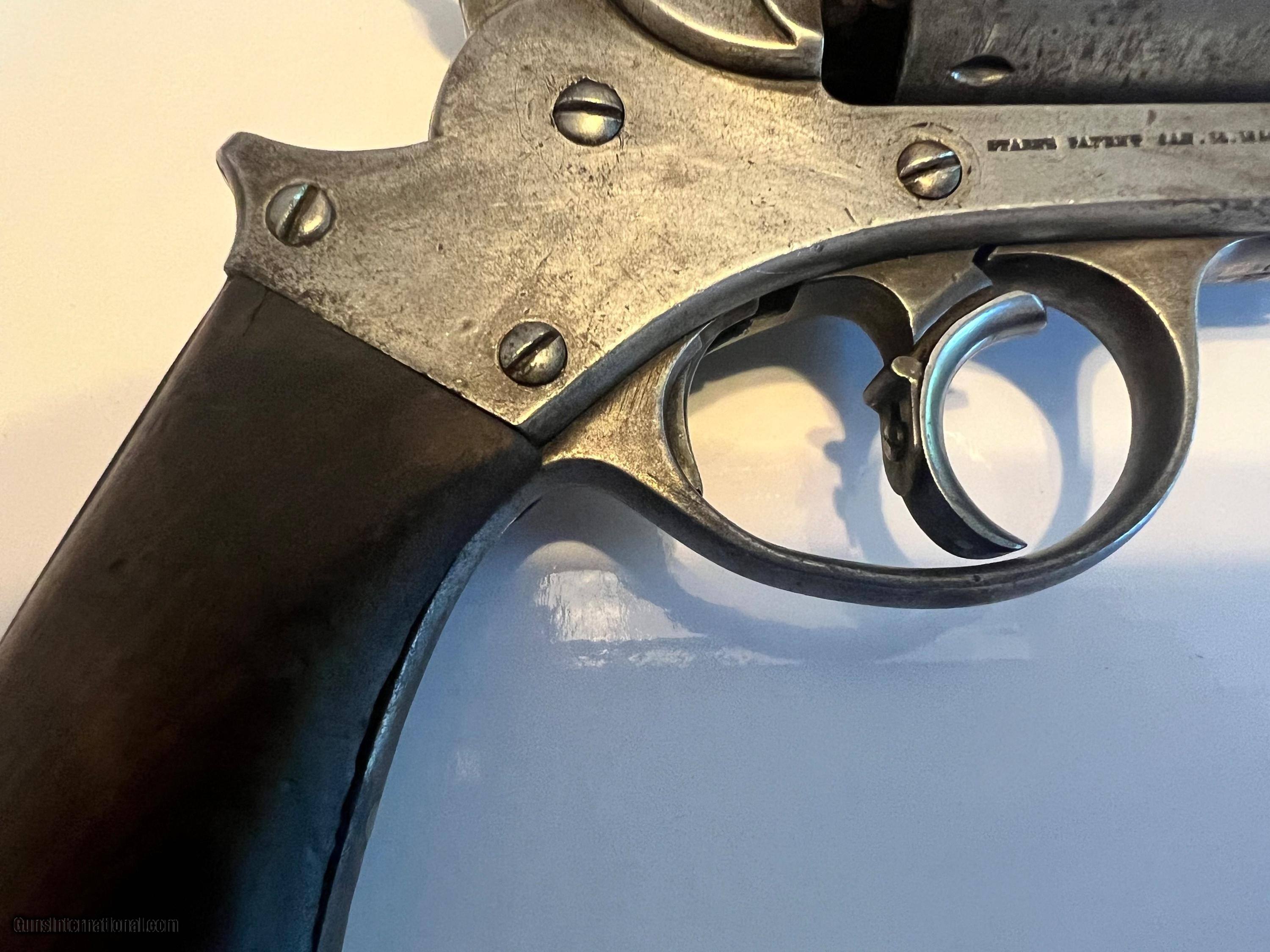 Description: Model 1858 DA Starr Perxuasion Revolver. Matching serials numbers. Grips have wear and chips. Two chambers of the cylinder have been converted to 44 at some point in history (See Pictures); all nipples have been removed during this process I would have to assume. The partial conversion causes the cylinder not to appropriately cycle when trigger is pulled. Please see pictures for condition. This is a handgun that has many stories to tell to say the least. Condition is as found. See pictures for condition. Weapon sold as antique not intended for firing. SOLD Antique: Yes Handgun Caliber: .44 Manufacturer: Starr Arms Model: M1858 Double Action Serial Number: 16067 Barrel Length: 6” Chambers: 2 Chambers have been converted. Condition: Fair Metal Condition: Fair Wood Condition: Worn Grips |