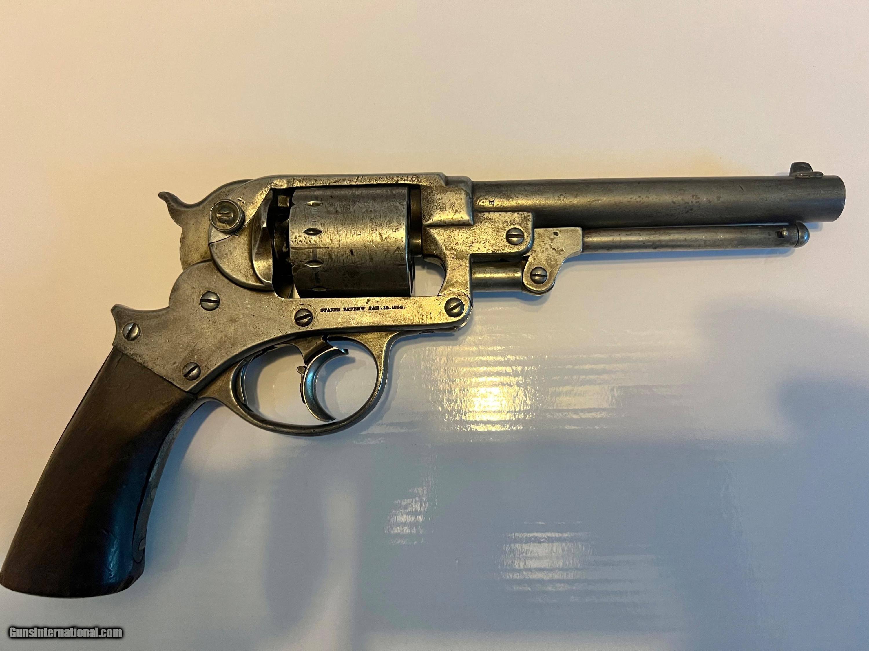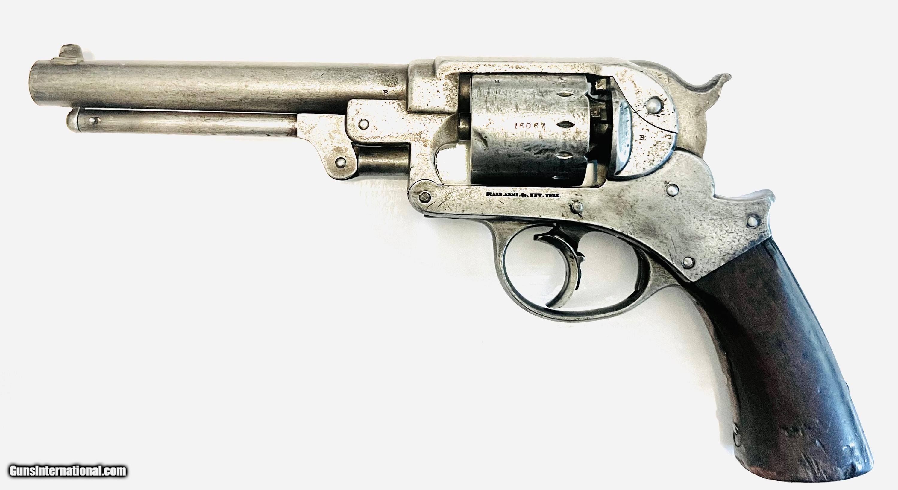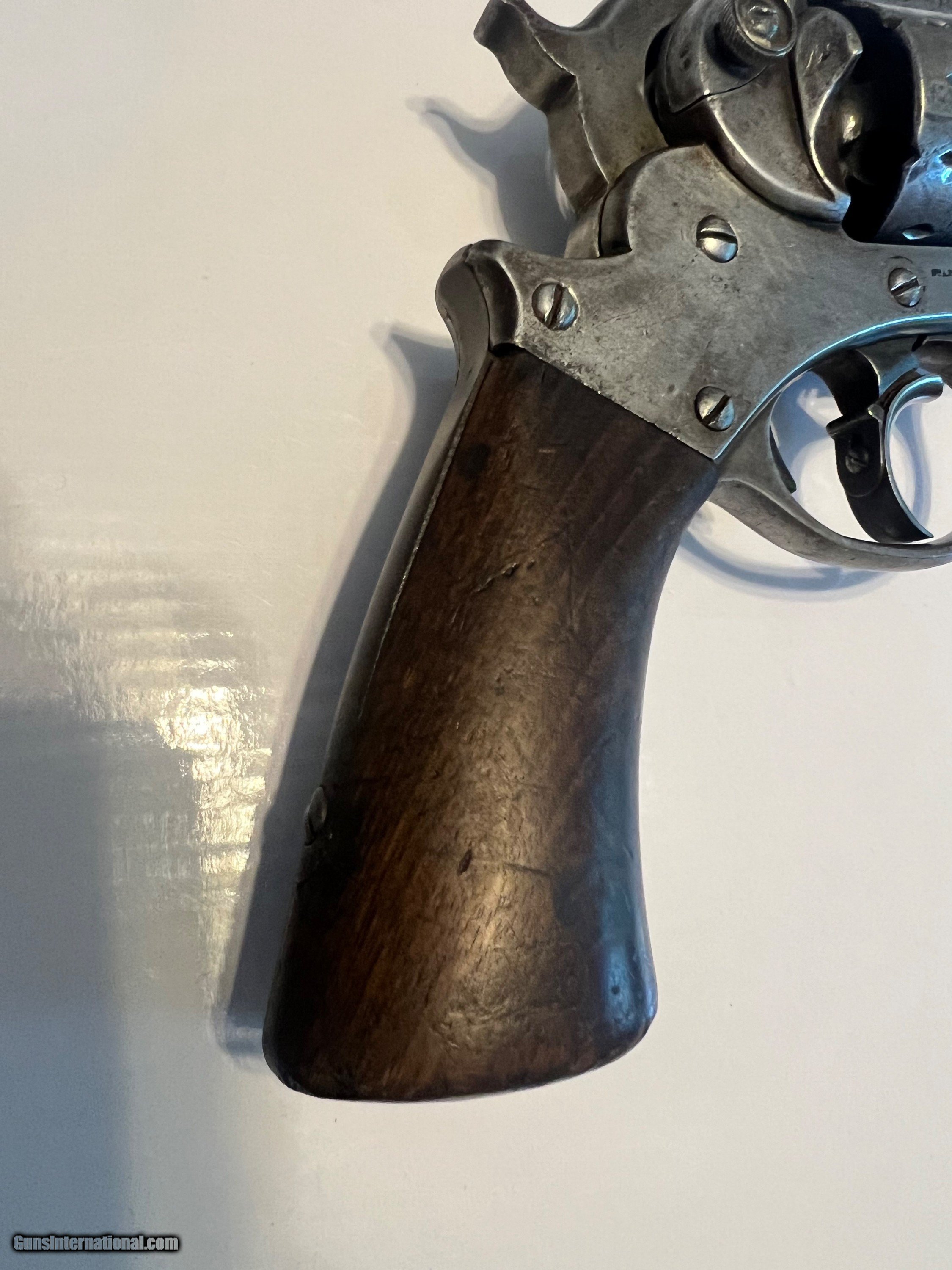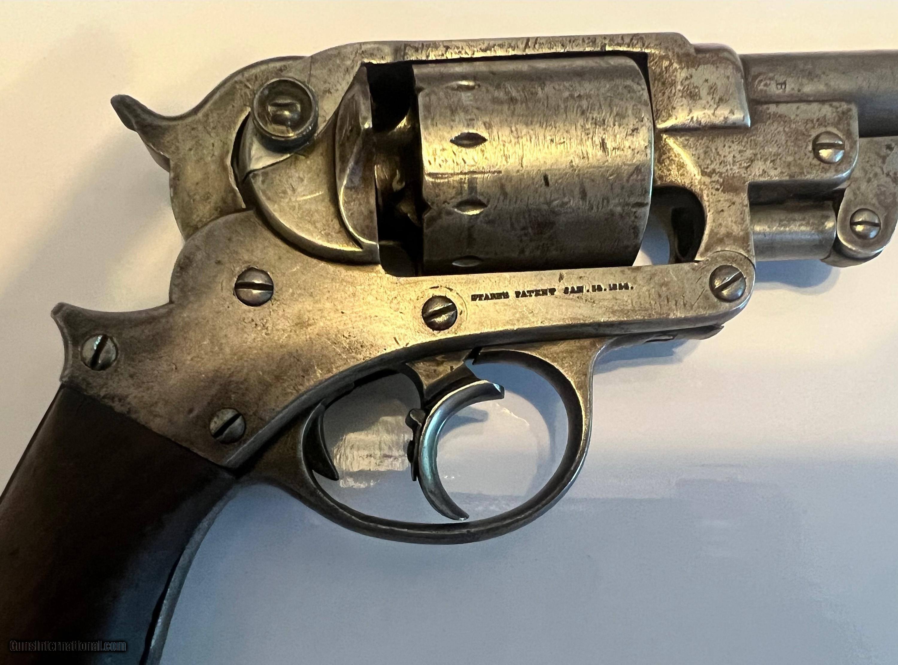 Description: Model 1858 DA Starr Perxuasion Revolver. Matching serials numbers. Grips have wear and chips. Two chambers of the cylinder have been converted to 44 at some point in history (See Pictures); all nipples have been removed during this process I would have to assume. The partial conversion causes the cylinder not to appropriately cycle when trigger is pulled. Please see pictures for condition. This is a handgun that has many stories to tell to say the least. Condition is as found. See pictures for condition. Weapon sold as antique not intended for firing. SOLD Antique: Yes Handgun Caliber: .44 Manufacturer: Starr Arms Model: M1858 Double Action Serial Number: 16067 Barrel Length: 6” Chambers: 2 Chambers have been converted. Condition: Fair Metal Condition: Fair Wood Condition: Worn Grips |