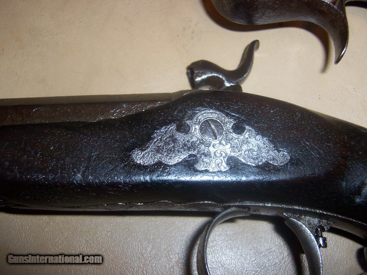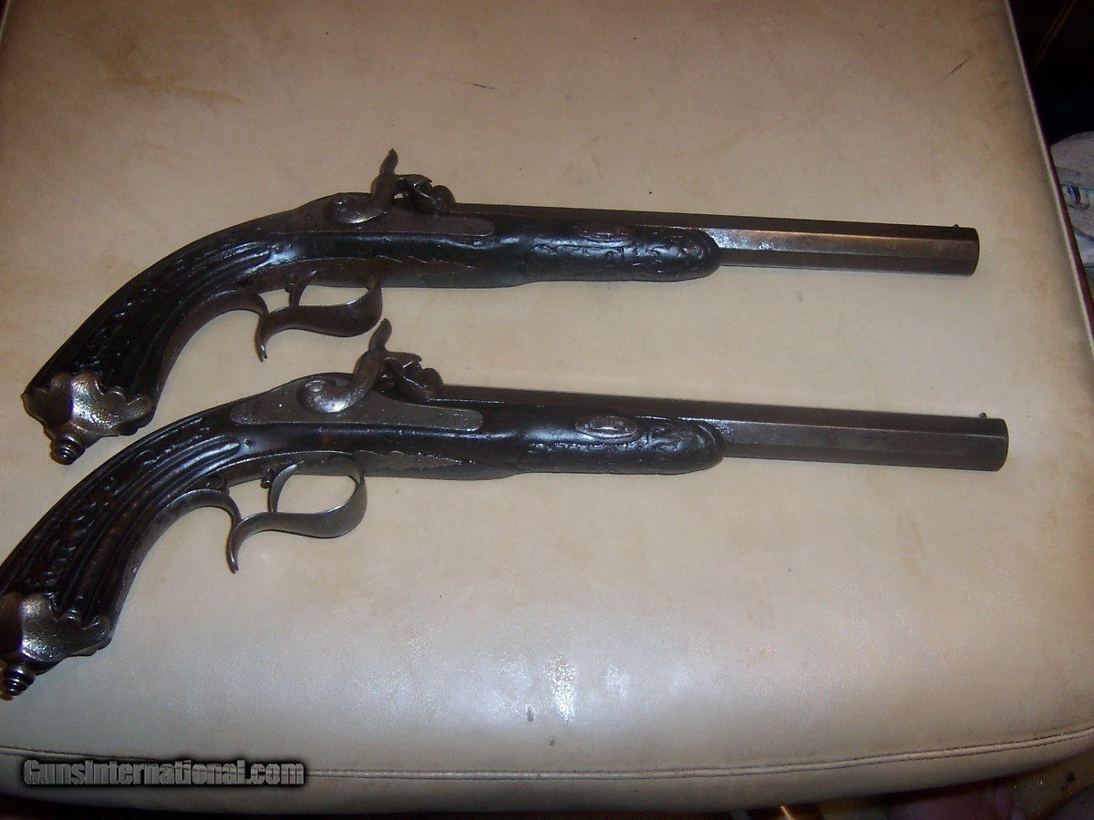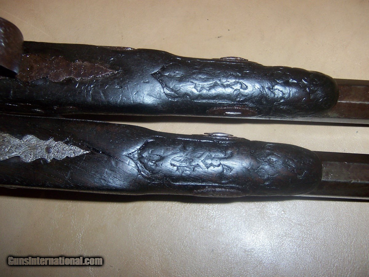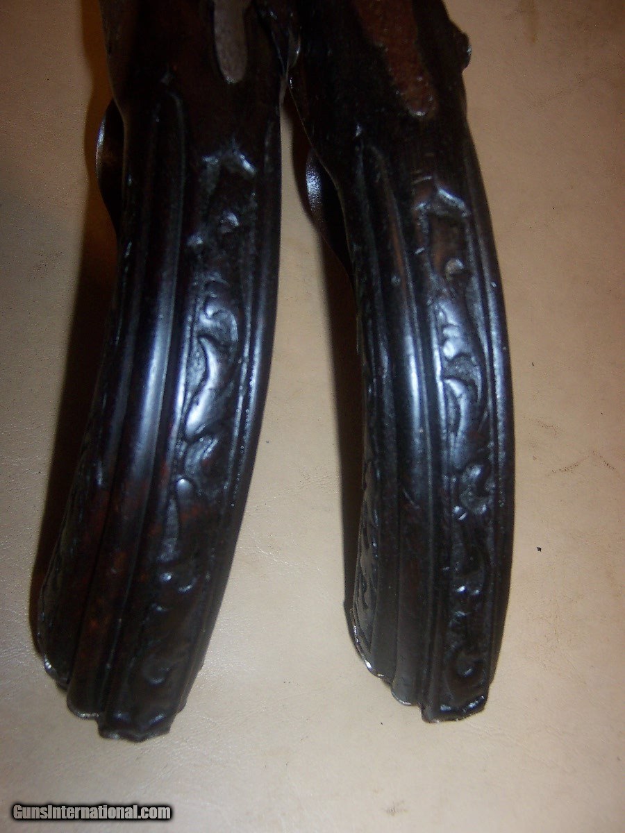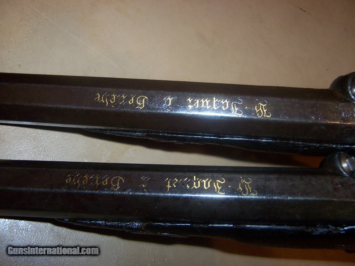 Description: marked in gold on barrels best i can make out '' jaquiet a geneve '''''''' fair condition;; locks work fine set trigger '' stock wear with cracks and chips .. .475 rifled bores good rifling . 9 15/16 inch barrel lenght 16 inches oa .. guns marked 1 and 2 '' the most interesting thing about these guns is the rear sight is adjustable for elevation 160 years ago these were nice target pistols ;;; now fair condition minor salt and pepper pitting on some parts ;; look all original and complete $45 sh ins ''''''' may be a lion and tiger engraved on locks '' set triggers work move hammer two clicks and push trigger forward to set ''some of the patina can be removed with careful cleaning locks all original inside look like clock works BUY ANT 2 ITEMS GET 5% DISCOUNT AND FREE SHIPPING SOLD Antique: Yes Manufacturer: Swiss Model: target |