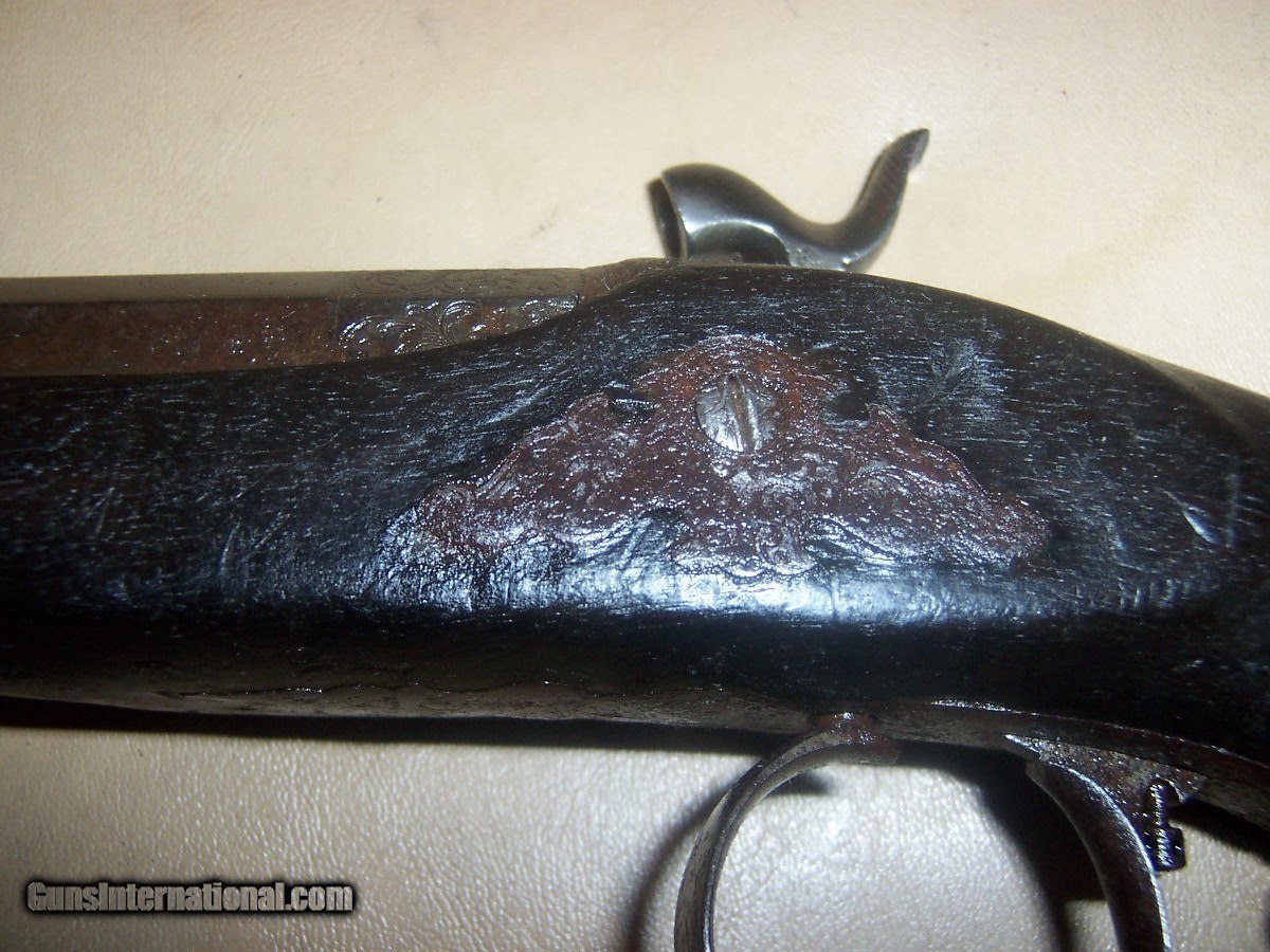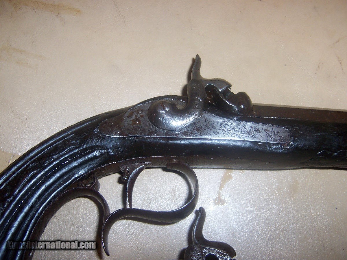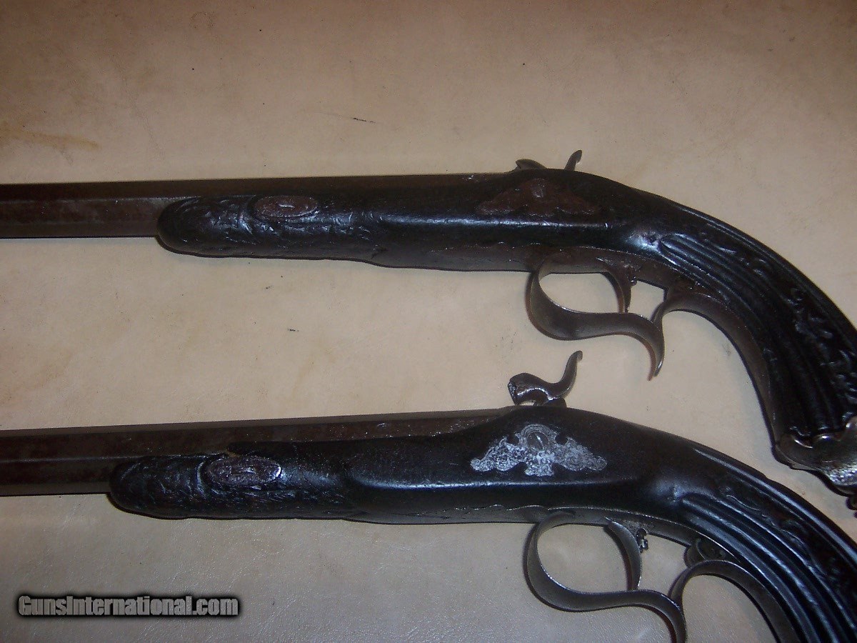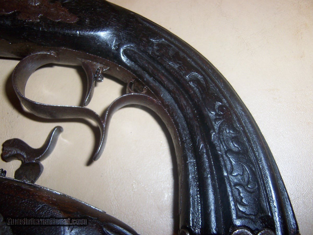 Description: marked in gold on barrels best i can make out '' jaquiet a geneve '''''''' fair condition;; locks work fine set trigger '' stock wear with cracks and chips .. .475 rifled bores good rifling . 9 15/16 inch barrel lenght 16 inches oa .. guns marked 1 and 2 '' the most interesting thing about these guns is the rear sight is adjustable for elevation 160 years ago these were nice target pistols ;;; now fair condition minor salt and pepper pitting on some parts ;; look all original and complete $45 sh ins ''''''' may be a lion and tiger engraved on locks '' set triggers work move hammer two clicks and push trigger forward to set ''some of the patina can be removed with careful cleaning locks all original inside look like clock works BUY ANT 2 ITEMS GET 5% DISCOUNT AND FREE SHIPPING SOLD Antique: Yes Manufacturer: Swiss Model: target |