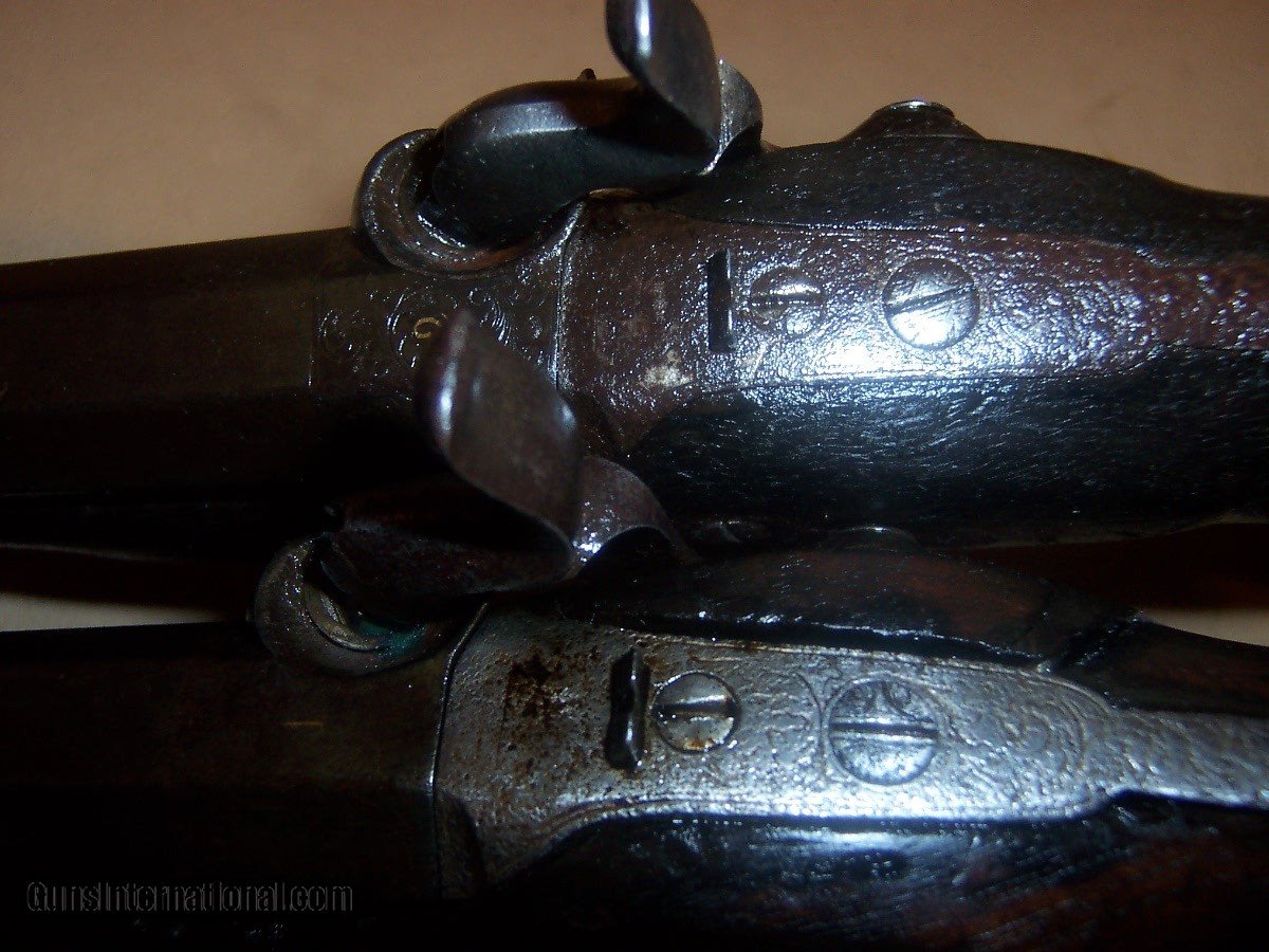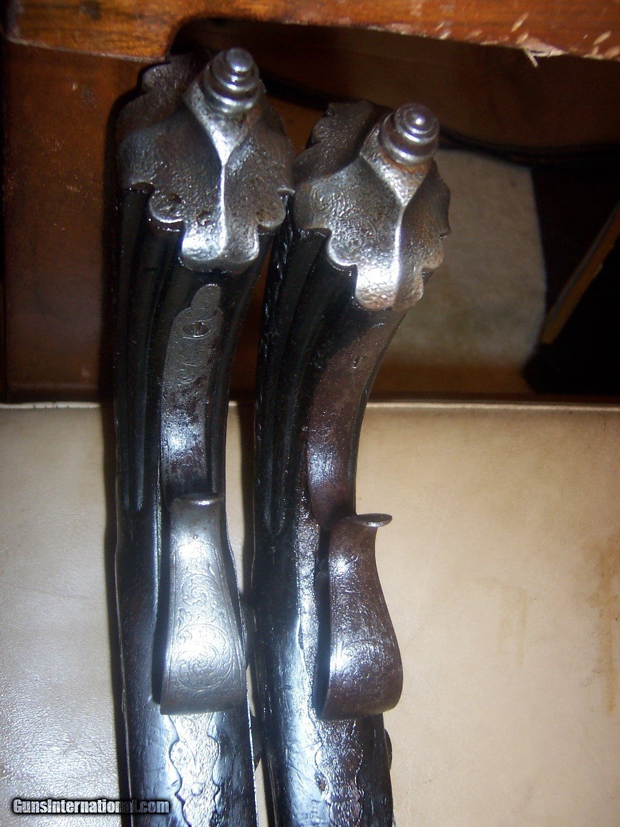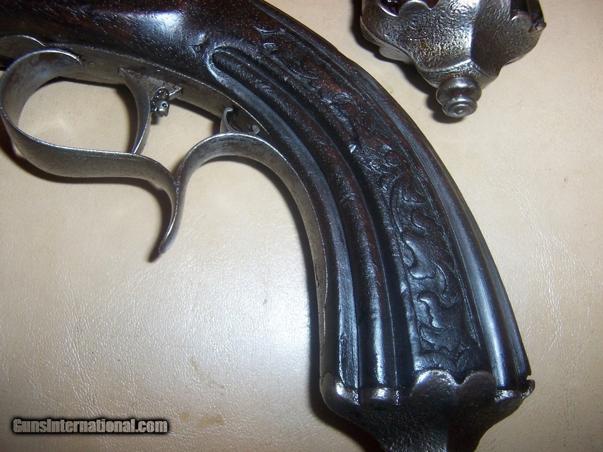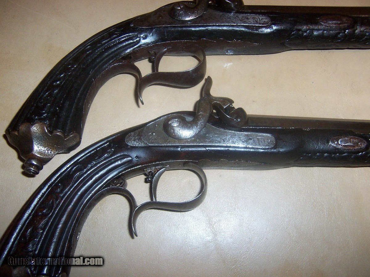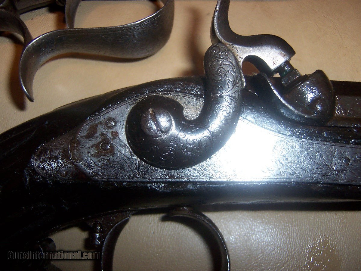 Description: marked in gold on barrels best i can make out '' jaquiet a geneve '''''''' fair condition;; locks work fine set trigger '' stock wear with cracks and chips .. .475 rifled bores good rifling . 9 15/16 inch barrel lenght 16 inches oa .. guns marked 1 and 2 '' the most interesting thing about these guns is the rear sight is adjustable for elevation 160 years ago these were nice target pistols ;;; now fair condition minor salt and pepper pitting on some parts ;; look all original and complete $45 sh ins ''''''' may be a lion and tiger engraved on locks '' set triggers work move hammer two clicks and push trigger forward to set ''some of the patina can be removed with careful cleaning locks all original inside look like clock works BUY ANT 2 ITEMS GET 5% DISCOUNT AND FREE SHIPPING SOLD Antique: Yes Manufacturer: Swiss Model: target |