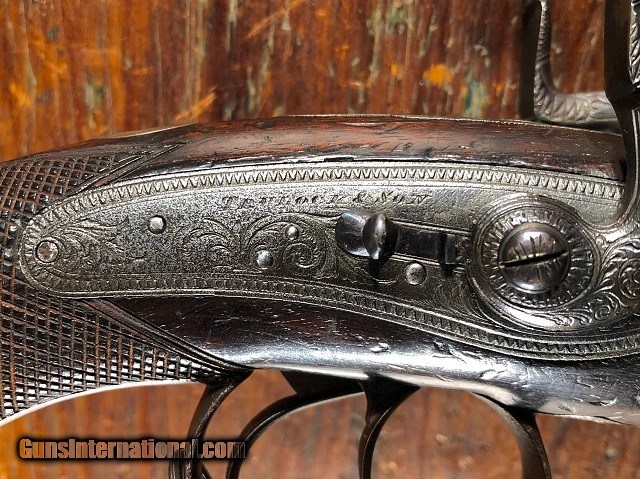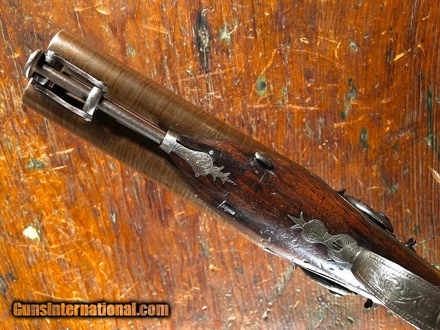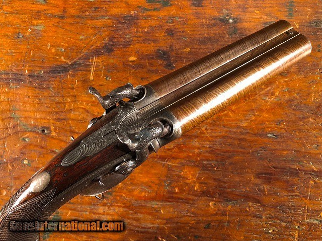 Description: *SALE PENDING* Fine & Scarce Trulock & Son, Dublin, Ireland, Engraved Percussion Double Barrel Howdah Pistol, .68 cal smoothbore, mfg. circa 1840. This is a truly fantastic big-bore dangerous game pistol by a desirable quality Irish maker. Double barreled pistols of such large caliber were intended as back up guns for dangerous game hunters typically in India who needed the fast handling firepower to stop charging tigers attacking the platform, or "howdah", mounted atop elephants from which the hunters took aim. This example measures just shy of 11 1/4" long overall and features massive 6" barrels fitted with an iron bead front sight. The gun is profusely engraved throughout with "TRULOCK & SON" inscribed on both locks and "TRULOCK & SONS 9 DAWSON St DUBLIN" on the barrels. The locks and furniture show a silver/gray patina while the barrels retain 90% older reapplied brown Damascus finish. The sliding safeties are bright fire blued with traces of bluing still visible on the nipples. The surfaces are smooth and edges very sharp throughout. The stock features a checkered grip with silver wrist escutcheon and retains a pleasing untouched dark appearance. A small square of wood around the ramrod entry pipe has been neatly replaced during the period of use but otherwise there is no further damage or repair. Military style swivel ramrod with triggerguard mounted lanyard ring. Both actions are impeccably crisp and function flawlessly as if new. They feature both internal half-cocks and external stalking safeties which work perfectly. Both nipples are perfect originals. Clean bright bores have been lightly honed and appear quite serviceable. A really impressive Howdah pistol of substantial caliber and quality! Jeremiah Johnson Trading sells antique firearms manufactured prior to 1899 and muzzleloading blackpowder reproductions only. For the purpose of these conditions the term "antique firearm" will hence include muzzleloading blackpowder reproductions. Buyers must be 21 years of age or older and have no felony convictions to purchase antique firearms. Antique firearms do not require Federal licensing and may be shipped directly to the buyer with the following exceptions. No antique firearms will be shipped to Washington D. C. or any of the five boroughs of New York City (or residents thereof). Some restrictions may apply to antique firearms shipped to California and will be noted in the item description if applicable. Any handgun (antique or muzzleloading blackpowder reproduction) shipped to New Jersey must ship to a licensed FFL holder. Any muzzleloading blackpowder reproduction rifle, shotgun, or handgun shipped to Illinois must ship to an FFL holder. No international sales of antique firearms which may fire conventional metallic cartridges or any reproductions regardless of ignition. Antique muzzleloaders, or antiques which fire obsolete cartridges, may be shipped internationally however it is the responsibility of the buyer to know and abide by their local laws and provide proof that the antique arm is legal to receive and own. Payment can be made by money order, banker's check, personal check, or credit card (no fees). Please allow 7-10 business days for clearance on personal checks. If paying by credit card please call us directly to process your order. If not satisfied with an item within 3 days of receiving it, simply return the item in the same condition as shipped for a full refund, minus return shipping costs. Cleaning, disassembly, or altering of a firearm in any way will void inspection privileges. Layaway may be allowed upon negotiation, but will void inspection privileges. Buyer pays actual shipping & insurance costs. Occasionally a post-1898 firearm from my personal collection may be sold under this account however it will be noted that any such transaction is a personal sale in no way affiliated with our business. Any such arm will be shipped to a licensed FFL or C&R holder in accordance with Federal law. All firearms are sold as collector's items and are not warranted safe for shooting. Please consult a competent gunsmith prior to shooting any firearm. Message or call with any questions about this firearm, or any of our other items at 860-873-1092 (office) or 860-345-2100 (shop). SOLD Antique: Yes Handgun Caliber: .68 Manufacturer: Trulock & Son Model: Howdah Barrel Length: 6 Barrels: SxS Manufacture Date: Circa 1840 Engraving: Yes |