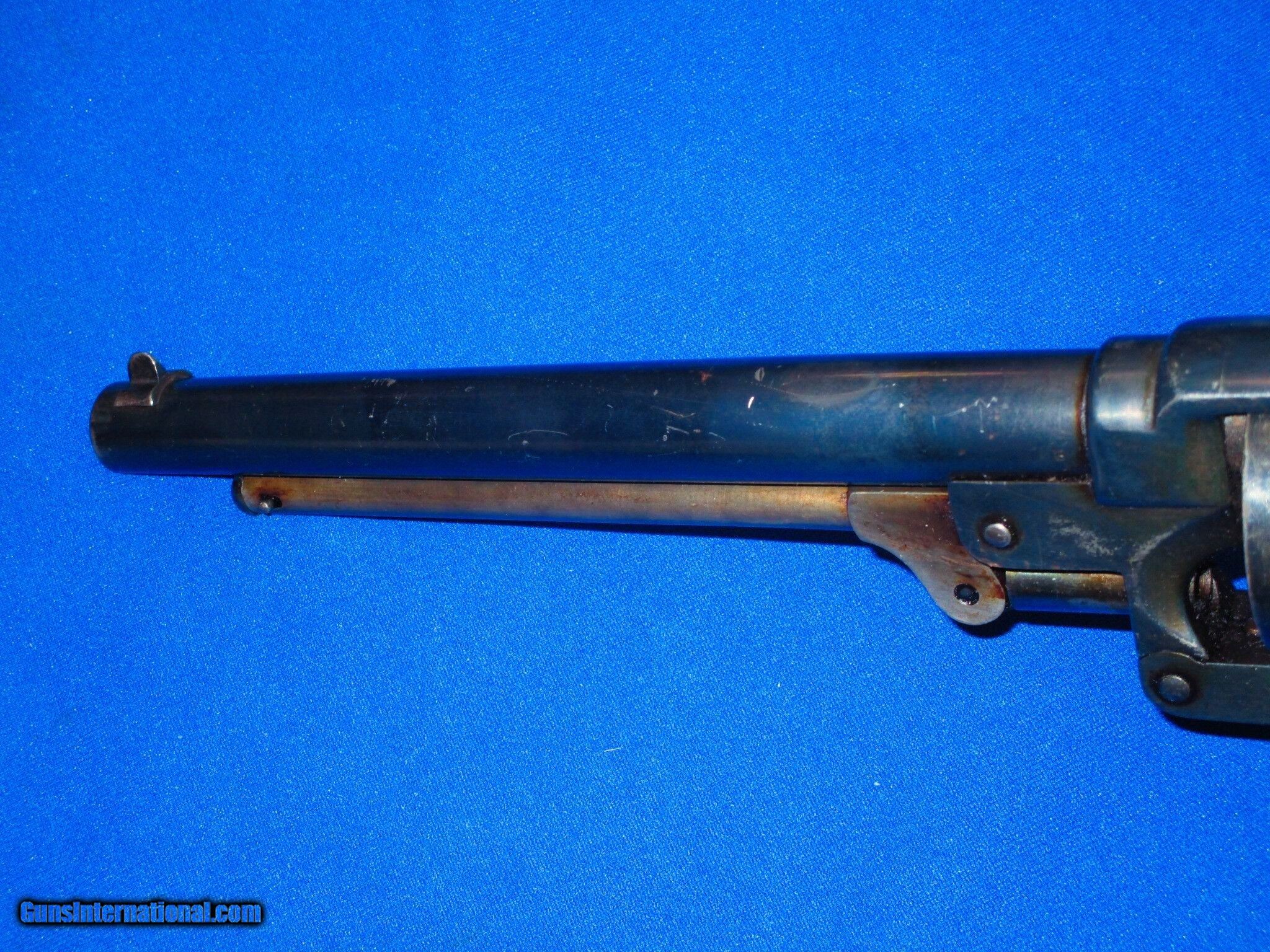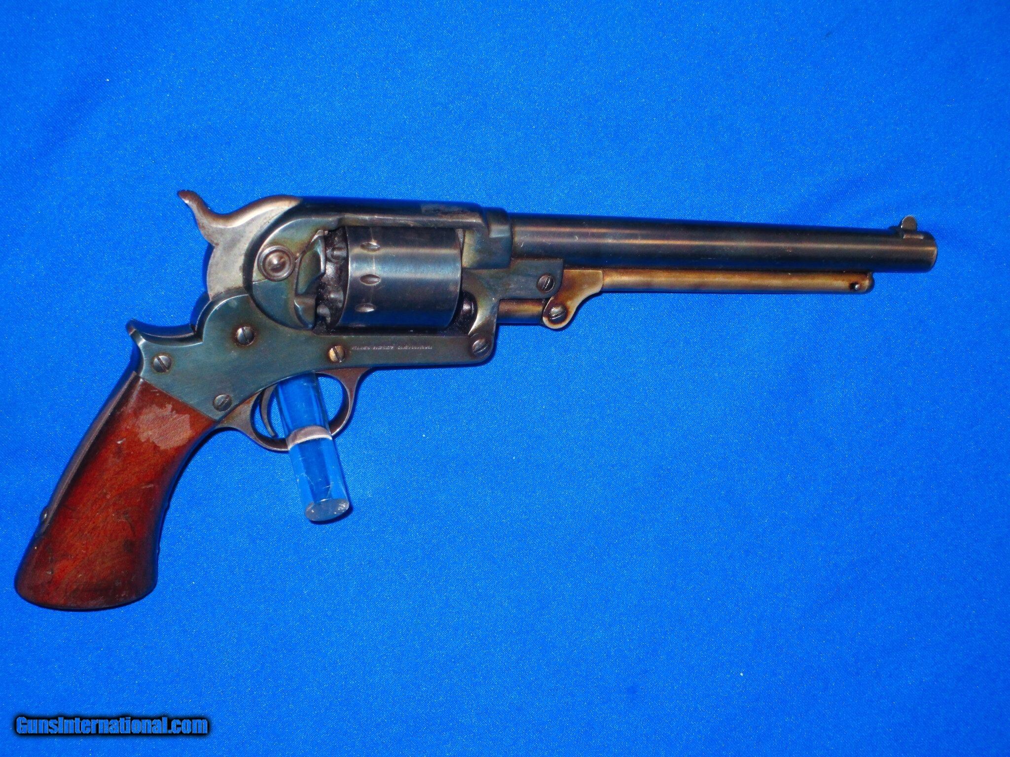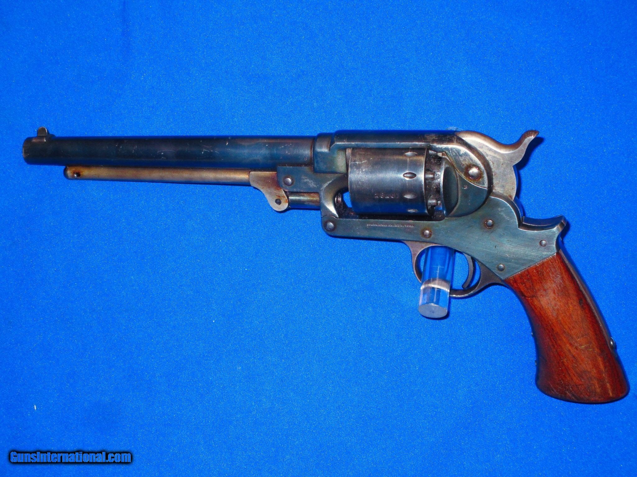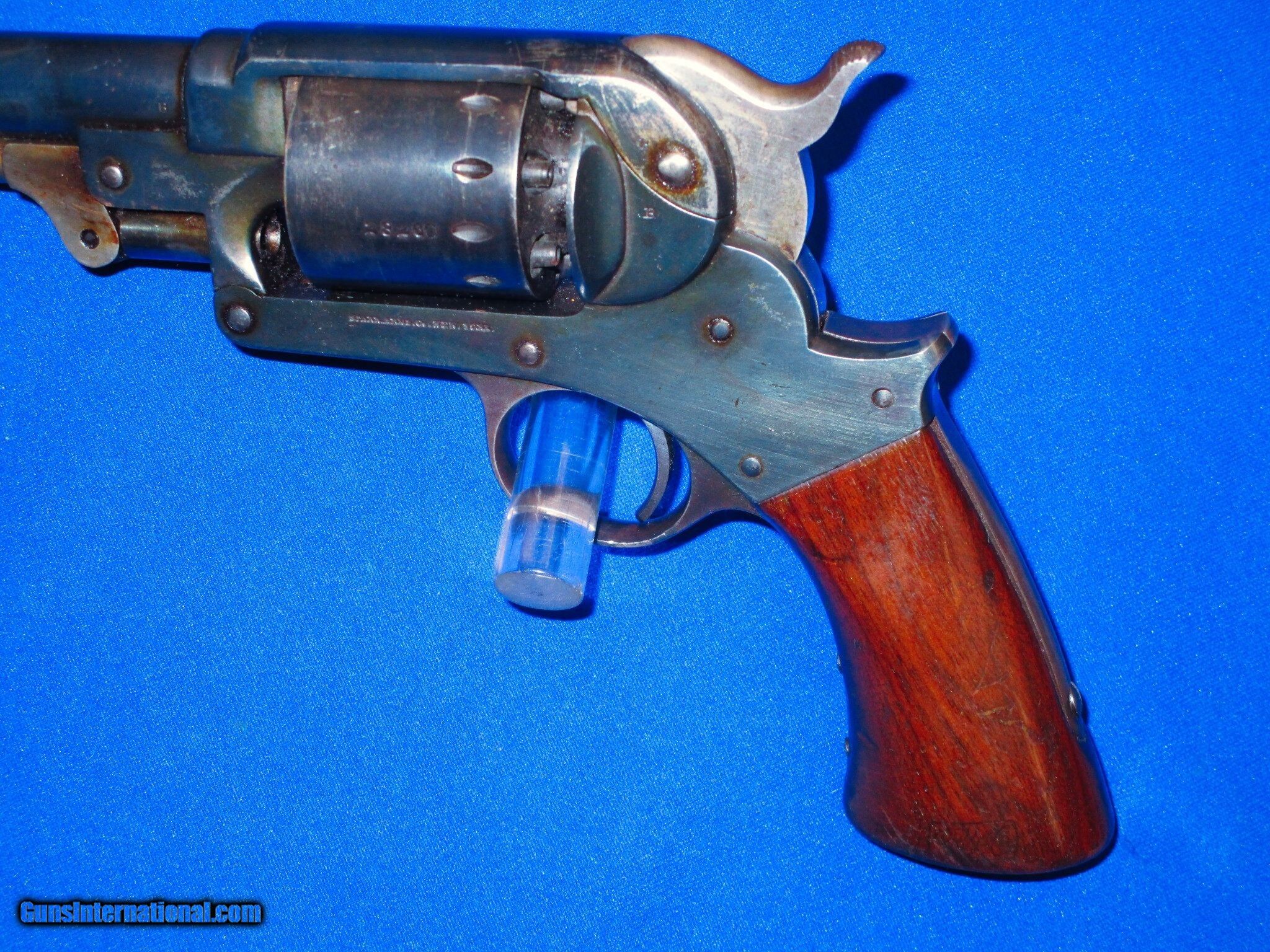 Description: U.S. Civil War Military Issued Model 1863 Starr S/A Percussion Army Revolver In Very Good Plus Condition. Serial #28,260, The gun has all matching numbers and is all original and complete. The revolver has very good plus metal & clear markings. It has nice edges on the metal. It is fully U.S. Sub Inspected. All of the metal on the gun has some original blue mixing with an early 1900's refinish. The hammer shows original case colors. All screws are fine. The original grips are fine throughout with U.S. Inspectors Cartouches on both sides. The action is tight and crisp. The bore is fine and bright. This Is A Fine Looking Example Of A U.S. Civil War Military Issued Model 1863 Starr S/A Army Revolver! SOLD Antique: Yes Manufacturer: Starr Model: S/A Army Serial Number: 28260 Condition: Very Nice untouched Condition Metal Condition: Very Nice Wood Condition: Very Nice Bore Condition: Excellent |