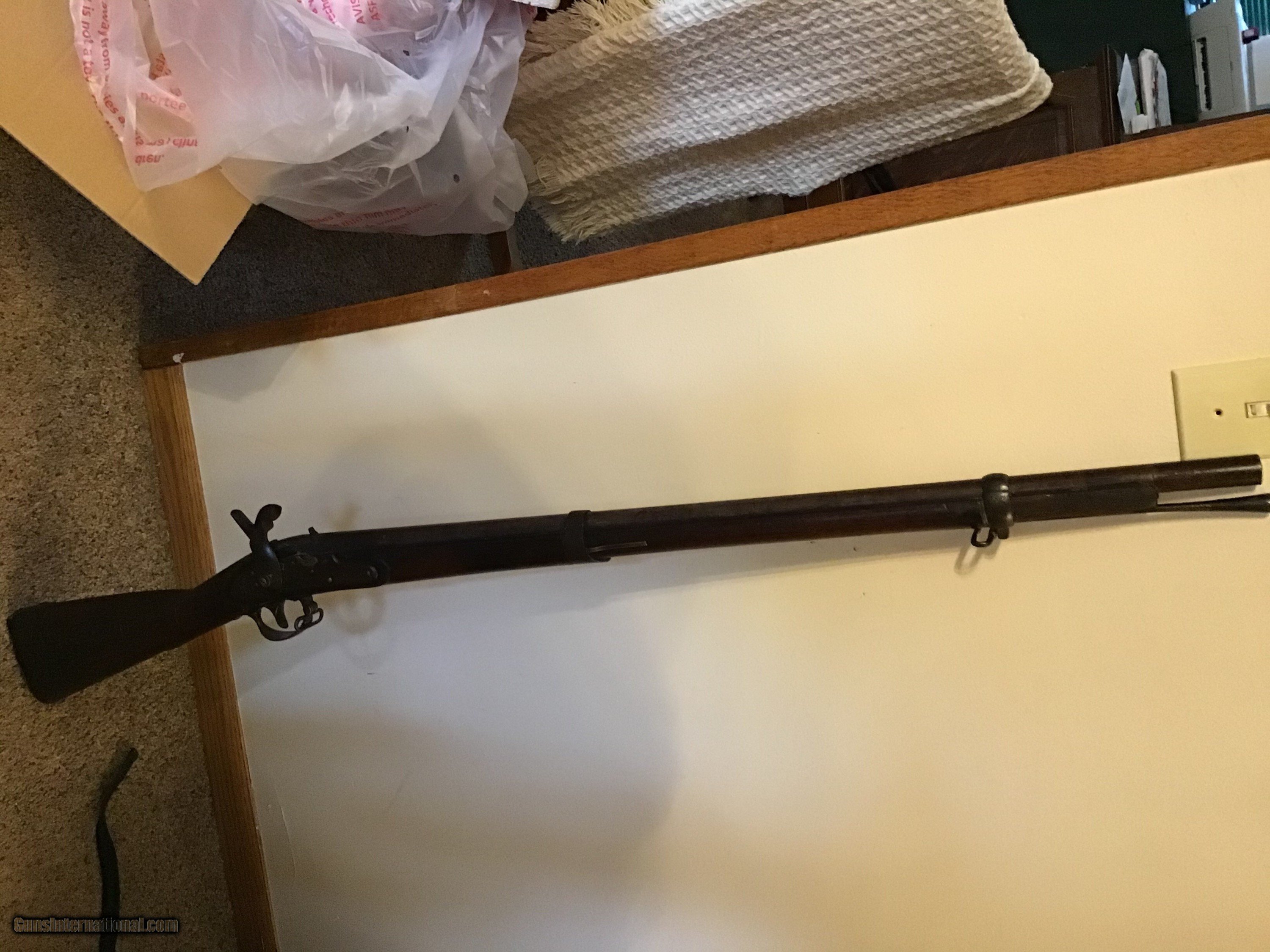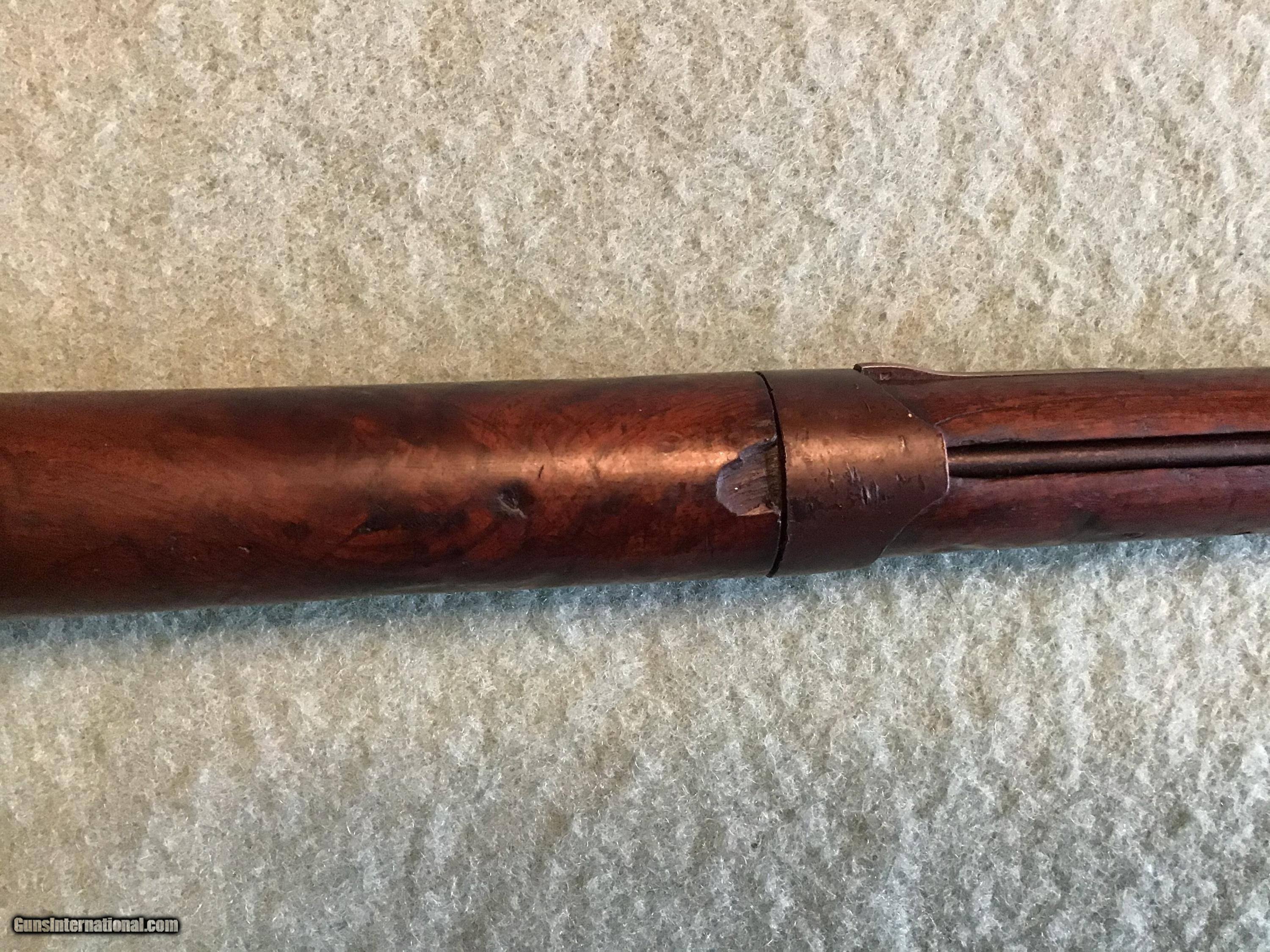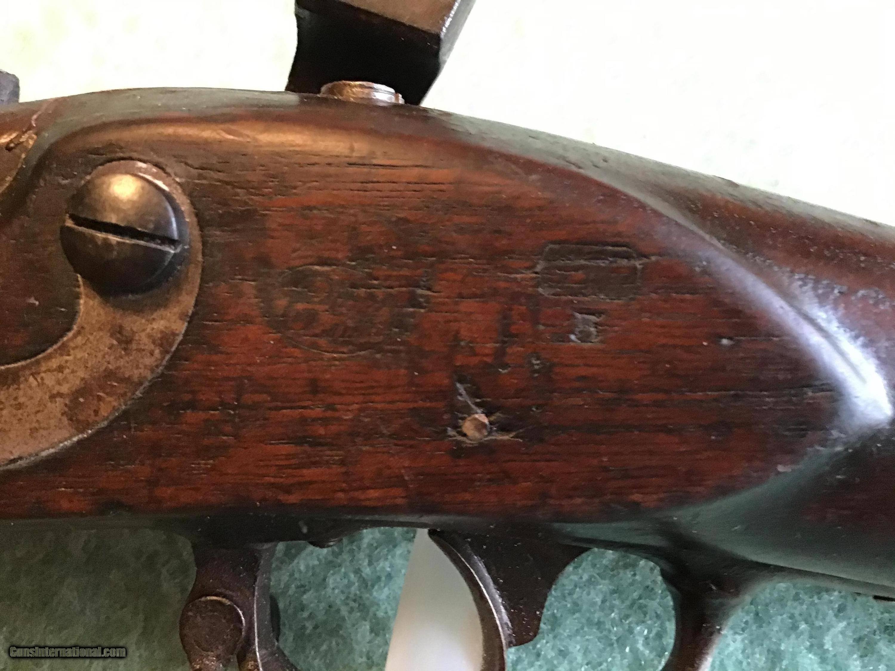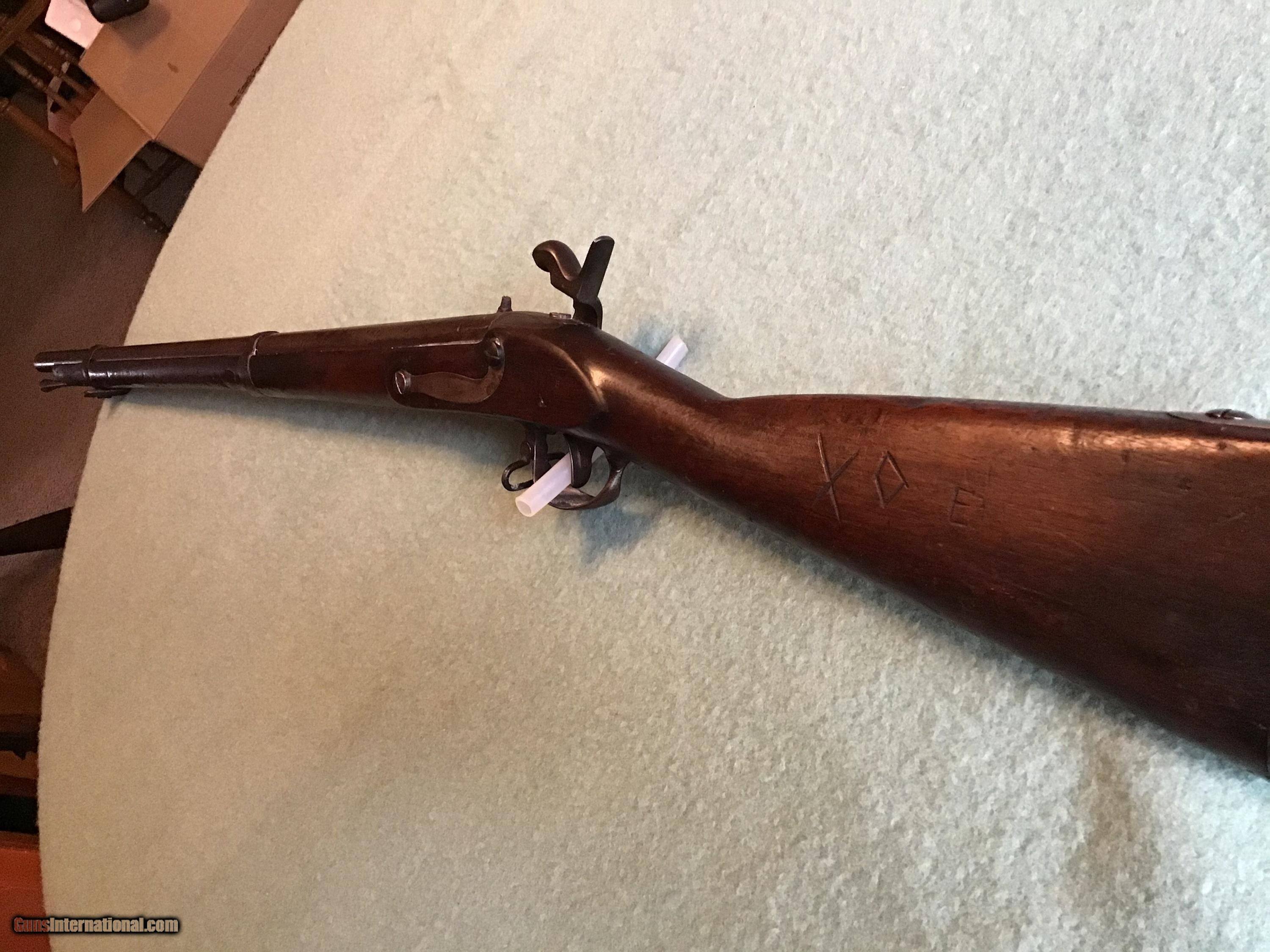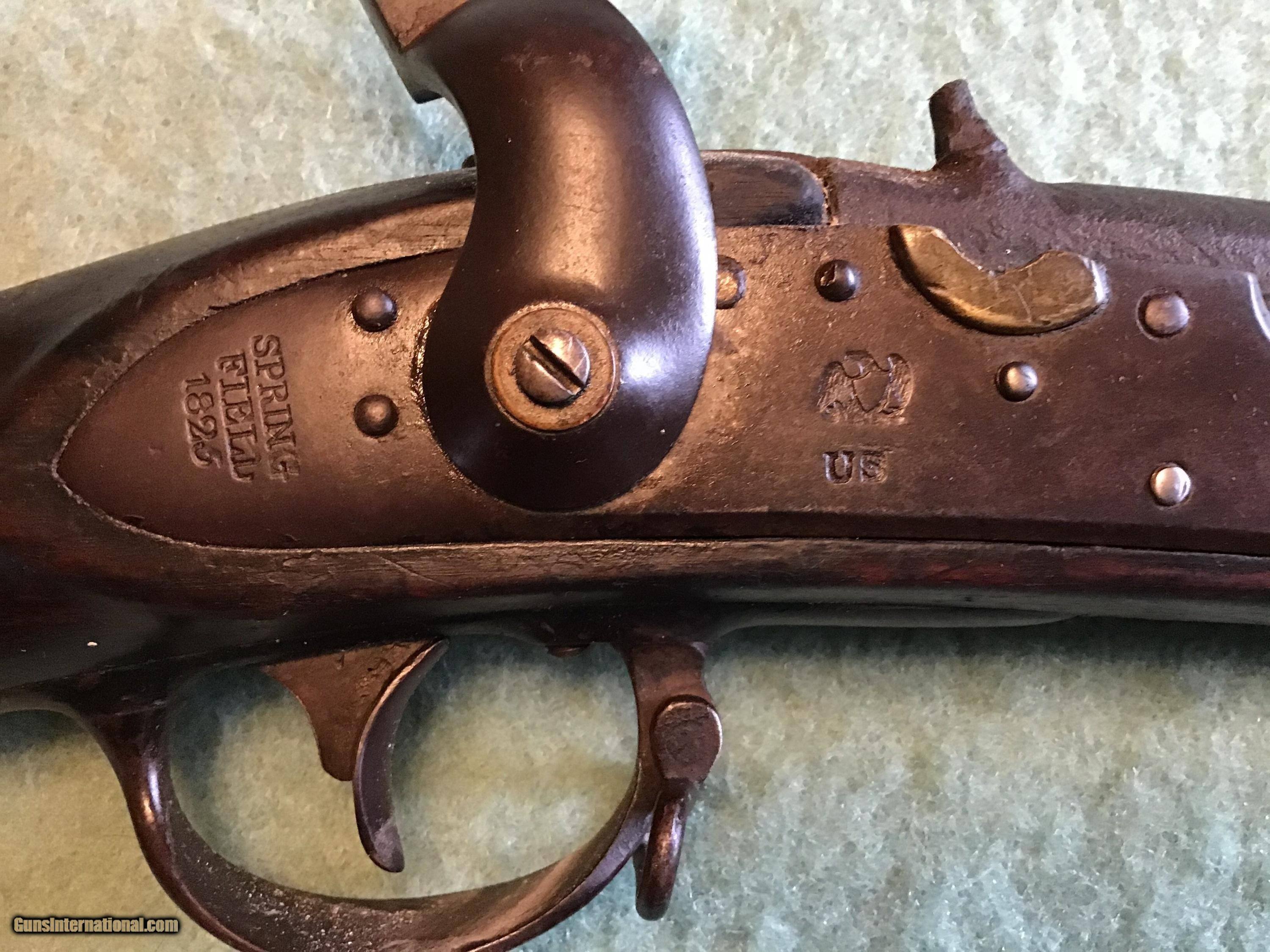 Description: On Hold Sale Pending. US Springfield Model 1816 Springfield flintlock converted to percussion approximately 69 caliber. This Springfield started its life as a flintlock but was converted to percussion probably in the 1850s and long ago shortened to 2 band length with a 32.5 inch barrel. The percussion lock works fine and is marked US Springfield 1825 with the American eagle. The tang markings are faint but appears to be the same date. The barrel proof markings are present near the breach. The dark walnut stock has nice color 2 cartouches a rack number 3 and a name on the right side and other initials on the left side. The but plate is marked US and both sling swivels and ramrod are present. Shipping will be actual cost approximately $50.00. On Hold Sale Pending SOLD Antique: Yes Manufacturer: US Springfield Model: Model 1816 Barrel Length: 32.5” |