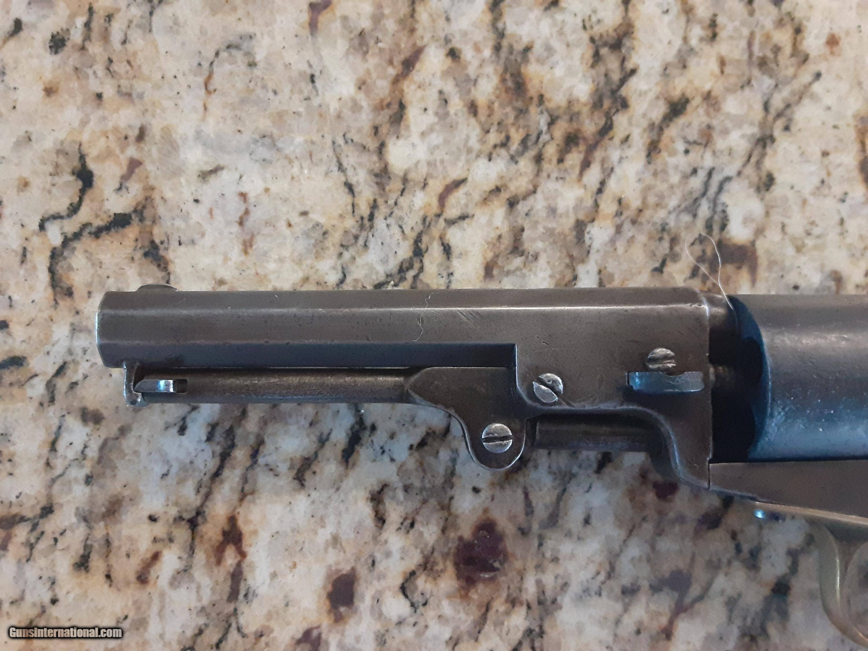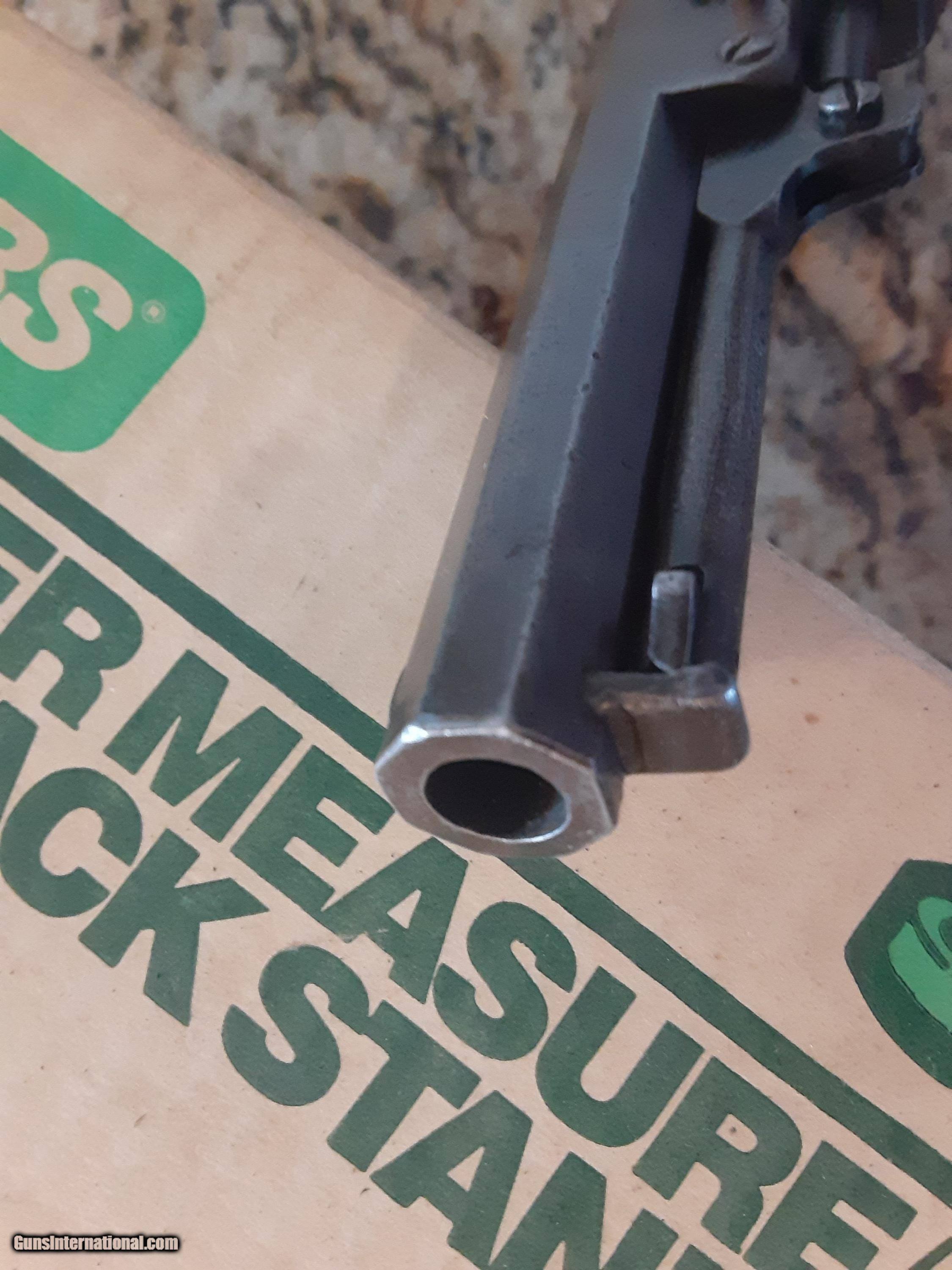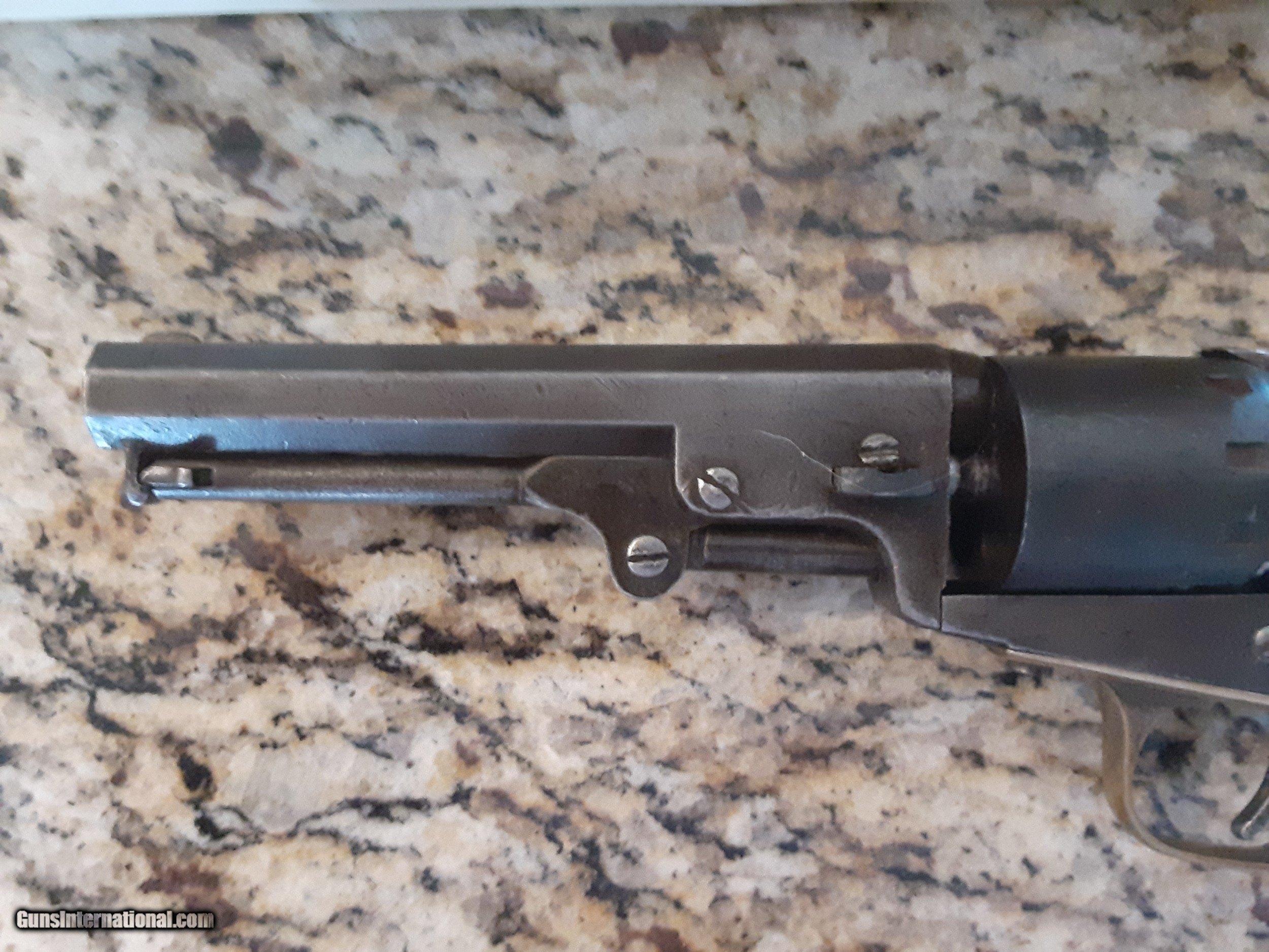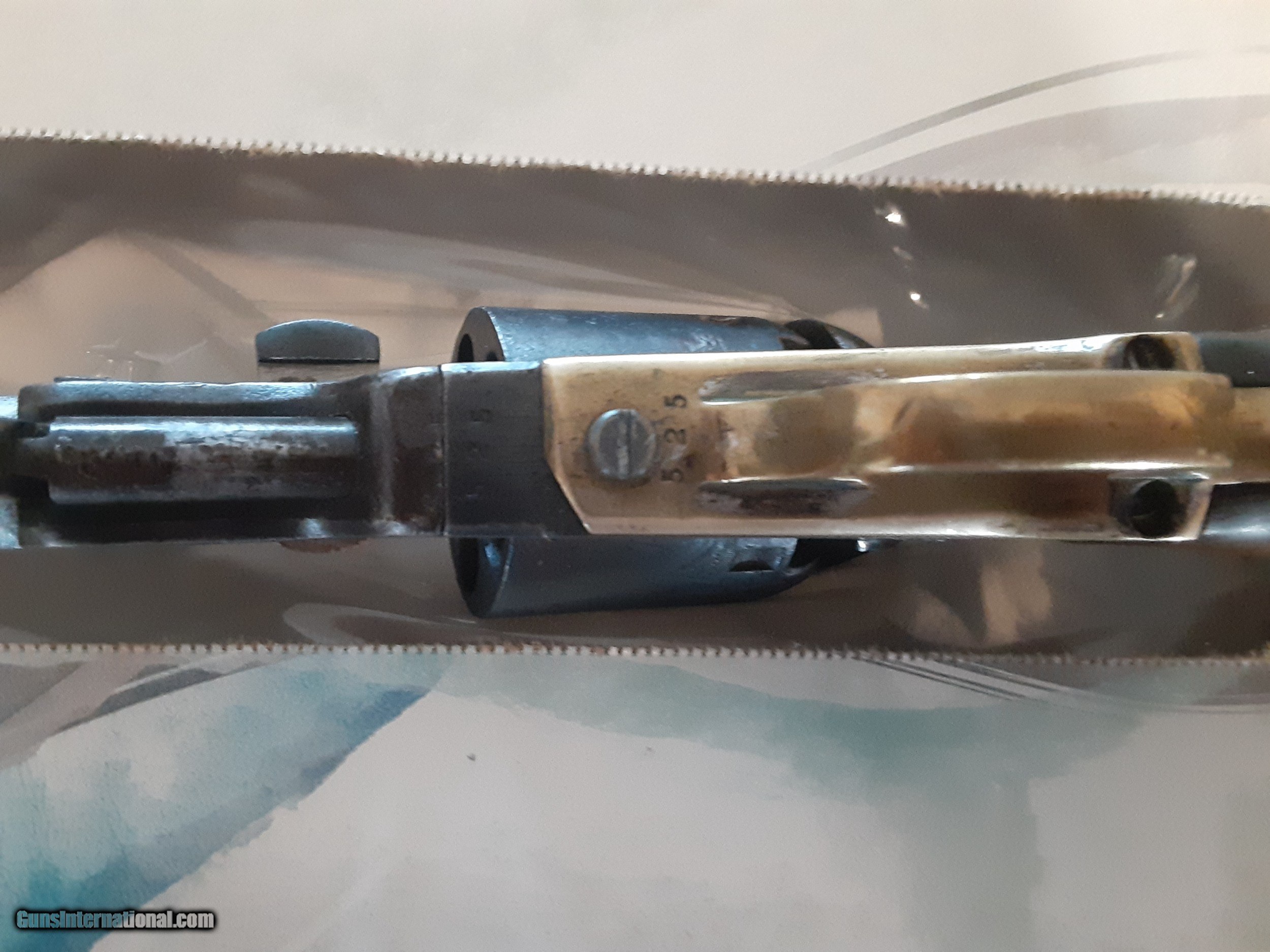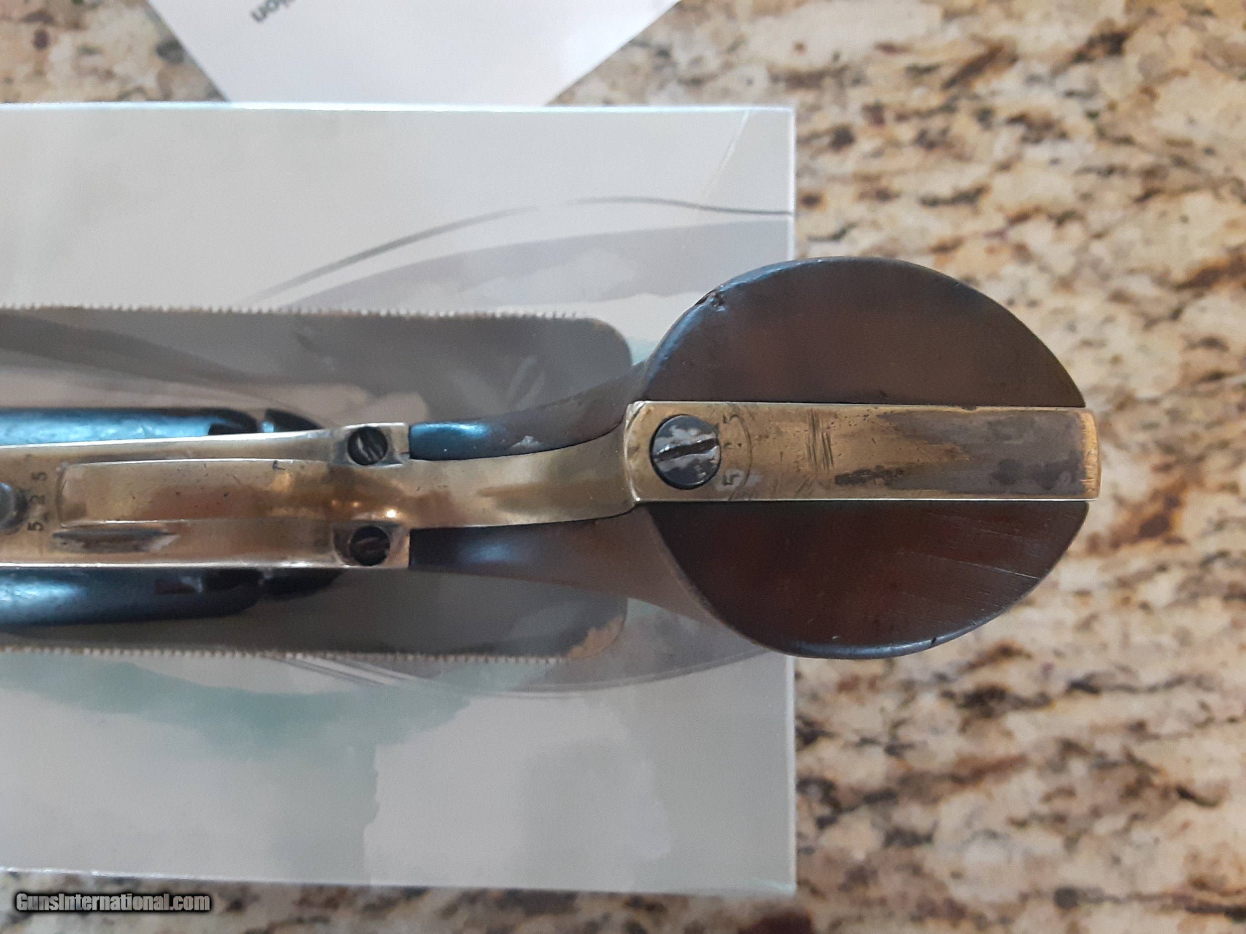 Description: Early Manhatten serial no. 525. Bore is very nice with sharp rifling,grey in color and almost no pitting. What is there is more like freckles. The cylinder chambers are free of corrosion with only minor pitting. The pins and holes are in good shape. The barrel/cylinder gap is were it should be. Wedge is tight. Cylinder locks up very tight, with very little play. The hand does not properly rotate the cylinder. The nipples are new and the cylinder ratchet notches were welded up to higher profile. If you are someone who likes to play with these and shoot them, this is perfect for a cheap price. SOLD |