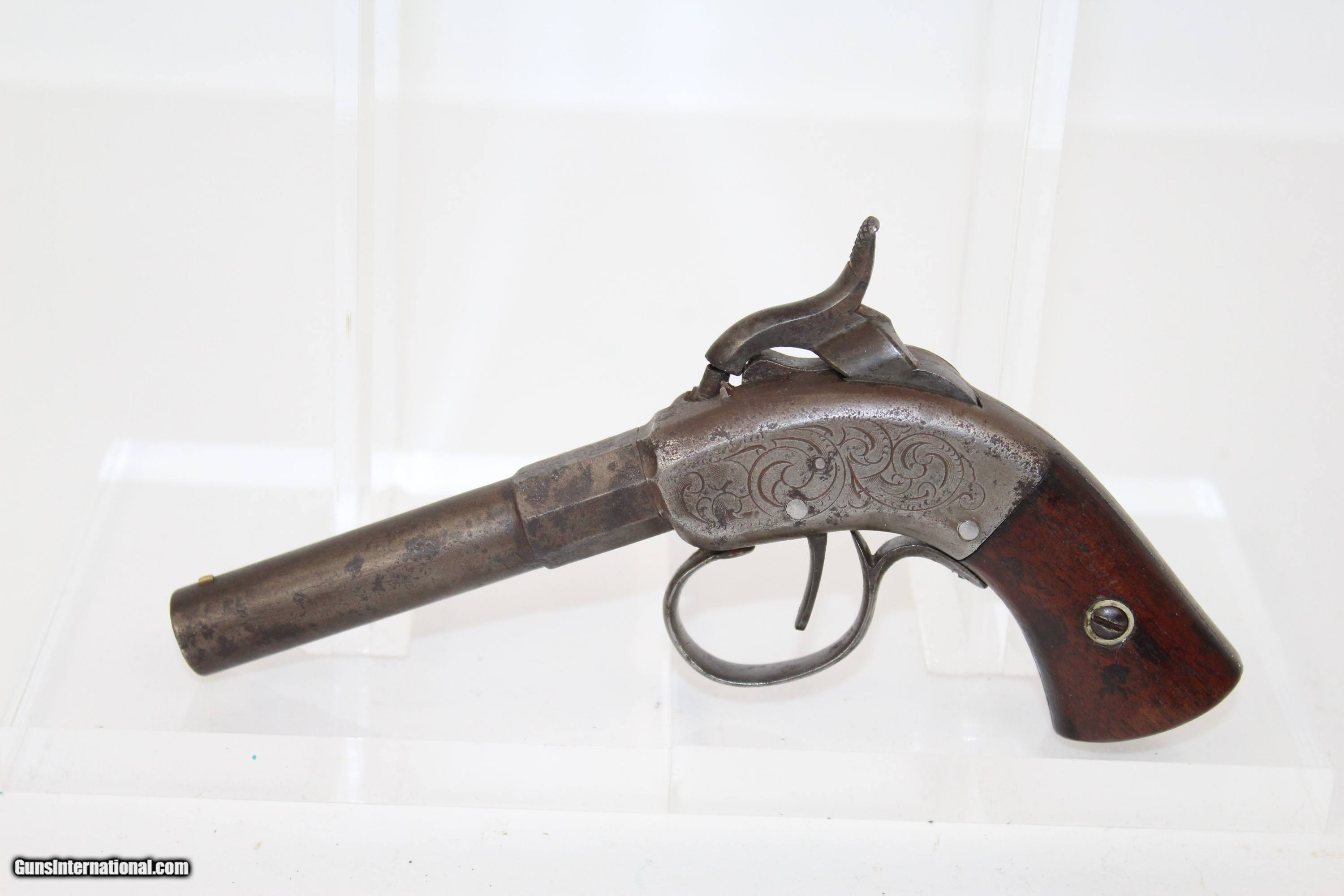 Description: VERY RARE Antique MASS. ARMS Single Shot Pistol Only About 500 Produced, Engraved, Maynard Primed Here we present a rare antique Massachusetts Arms Maynard Primed Single Shot Percussion Pistol, manufactured in the late 1850s. According to Jones, only about 500 were produced. In 1847 Colt received a contract for his Colt-Walker Revolver, but lacking any manufacturing capability himself, had to outsource to the Whitney Firearms Co. Once complete, Samuel Colt was able to take over production himself, and while he was at it, he lured several Whitney employees away with him to Hartford. Among those were William Miller and Joshua Stevens. They were secretly working on their own revolver, and when Colt found them out he fired them. They went on to continue their work on the design, first with Edwin Wesson, and then the Massachusetts Arms Co. upon Wesson’s death. The initial design was one in which the hammer also revolved the cylinder. It was immediately attacked by Colt in a patent infringement lawsuit, which Colt won, effectively quashing the success of the revolvers, though they changed the infringing elements and continued to manufacture revolvers. They also took the cylinder completely out of the equation with this Single Shot model. Very few of these were made as it is hardly more effort to manually place a cap on the nipple when you have to load the little pistol from the muzzle anyway. The Maynard tape door is marked “MAYNARD’S PATENT/SEP 22, 1845”. The frame and Maynard tape door are engraved. The overall condition is good. The metal surfaces are dark with age. The markings are legible. The serial numbers match. The grips are in good shape and are numbered to match. The action on this pistol is strong. Own the original! This is a legitimate antique and not a reproduction. Barrel is 3 inches. Caliber: .31 Overall condition as seen in photos. Very Fast. Very Safe. FREE SHIPPING WORLDWIDE. Delivered directly to your door by express mail! Guaranteed AUTHENTIC & Includes CERTIFICATE OF AUTHENTICITY. ancestryguns $1750 #6572 SOLD Antique: Yes |