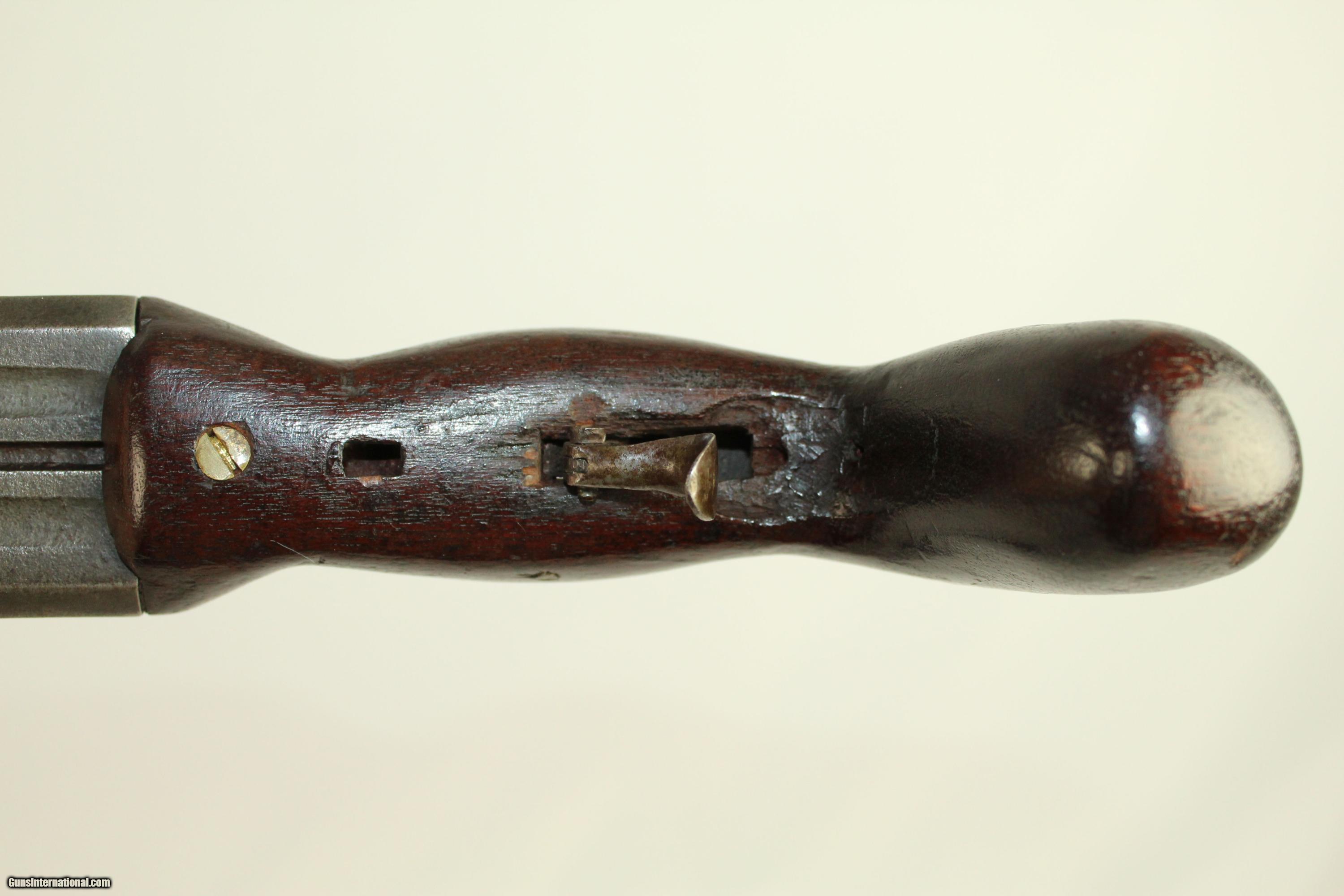 Description: VERY RARE TRIPLE Barrel ANIMAL TRAP & ALARM GUN TRIPLE BARREL Patent by George Smith w Pistol Grip Here we present an antique George Smith & Company Combination Three-Barrel Animal Trap and Burglar Alarm Gun, made circa 1860, in New York City. The total quantity of these produced is currently unknown, but they are exceedingly rare. It was designed to anchor to an object with bait at the business end if one was trapping an animal. If one wished to use it as an alarm for their residence, the user simply attached it to the door after having loaded it with powder. The hammer comes down on a single nipple, which is vented to all three barrels. The barrels are made of heavy iron. It is a very neat piece. A previous owner decided to make it capable of being fired from the hand, so there is a hand-made pistol grip that accompanies this piece. Overall condition is very good. The iron parts have a dark gray patina. The top of the hammer bears the patent information. The bores are smooth and in very good condition. The action is functional. Own the original! This is a legitimate antique and not a reproduction. Barrel is 2-3/4 inches in length. Caliber: .34 Percussion Bores are in very good condition. The firing mechanism is functional. Overall condition as seen in photos. Here is a fascinating rarity of a firearm for your collection. Trap an animal, keep your residence safe, or shoot it by hand! It allows a very interesting insight into the times. Very Fast. Very Safe. FREE SHIPPING WORLDWIDE. Delivered directly to your door by express mail! Guaranteed AUTHENTIC & Includes CERTIFICATE OF AUTHENTICITY. ancestryguns $1500 #21875 SOLD Antique: Yes |