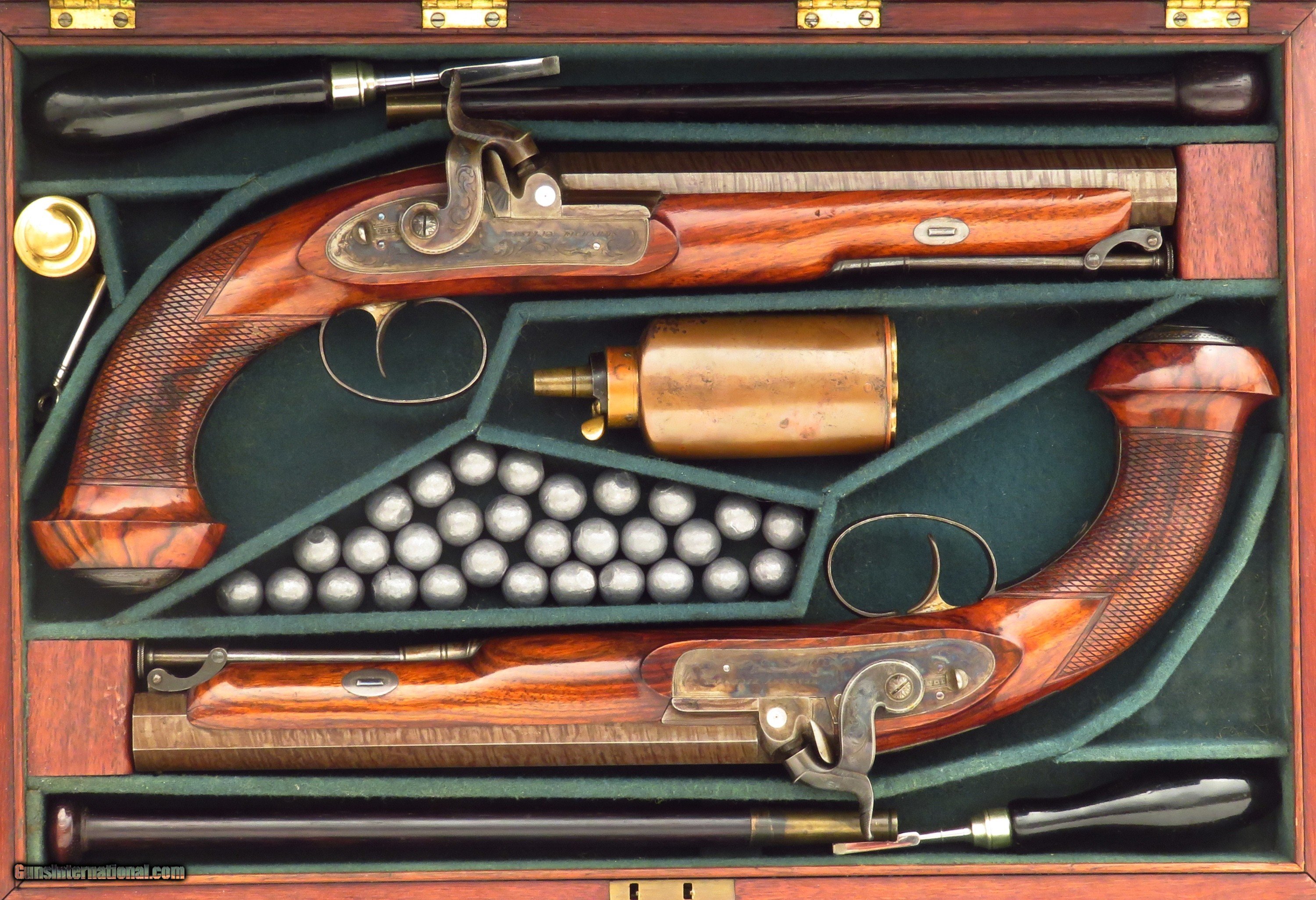 Westley Richards pair percussion pistols, .663-inch bores, Damascus smooth bores, cased, layaway