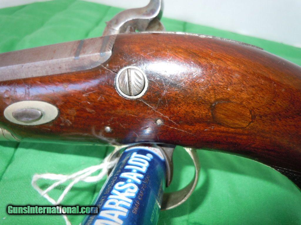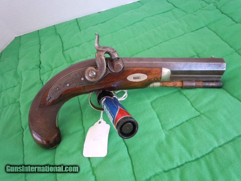 Description: Offered is a made in London England circa 1850 Westwood London back action percussion coat pocket pistol with a 5 inch smooth bore barrrel in apx 40 caliber (overall length is apx 8.5 inches). This pistol has nicely engraved silver mountings, screws, barrel tang and breech , bluing is original and is strong on the lock, barrel appears to have faded Damacus browning? Case hardening is still strong on back strap and evident on hammer. Silver estrunchon on the back strap is not monogramed, Lock mechanism is tight in both half and full cock,.bore is bright and shiny. Stock checkering is still sharp. Not pictured is little Percussion Cap holder at the bottom of the pistol grip that is hinged. The only flaw that I can see is a small crack in the wood coming off the left side of the barrel going into the lock screw on the left side and continuing on, total length of the crack including the width of the screw (.375 inch) is 1 inch. At this point in time it is a moot issue as this pistol is not likely to be put into use. Overall a beautiful example of the 19th century British firearms trade that is priced right for quality and condition. This pistol is an antique which requires no FFL. Buyer pays for shipping, I will send this USPS Priority Flat Medium Rate plus full insurance. If paid with USPS MO I will usually ship within 24 hours all other forms will have to clear. Please ask any questions that you might have, there is always something that I forget to mention? SOLD Antique: Yes Manufacturer: Westwood Model: Percussion Coat Pocket Pistol Serial Number: NA Caliber Info: 40 Barrels: 5 inch |