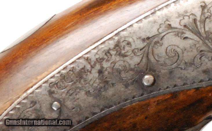 Description: Wilson Single Shot Pistol – England ca. 1840 Magnificent percussion single barrel pistol signed Wilson, in script, on the lock and London, in script, on a beautiful Damascus smoothbore barrel. This fine English pistol is approximately .40 caliber, has a 9" barrel and measures 14” overall. It has beautifully designed engraving on the tang, lock, cock, and trigger guard. The barrel retains its original Damascus pattern and has a patented breech. The stock is walnut and has very fine checking. The stock is embellished with a flared “palm grip” below the checking, an unmarked oval silver plate behind the tang and a silver nose cap. It has iron hardware with a ramrod made of ebony with an ivory tip. The overall condition of this pistol is excellent and retains its original patina. The markings are clear and legible. The grip and bore are in fine condition. The action is excellent. This is a very desirable flintlock pistol by a well known family of gunsmiths. This finely engraved pistol was made by one of the last Wilson Family gunsmiths. gordonbarlowantiques 540-448-0344 gordonamaty $1,250 - OBO SOLD |