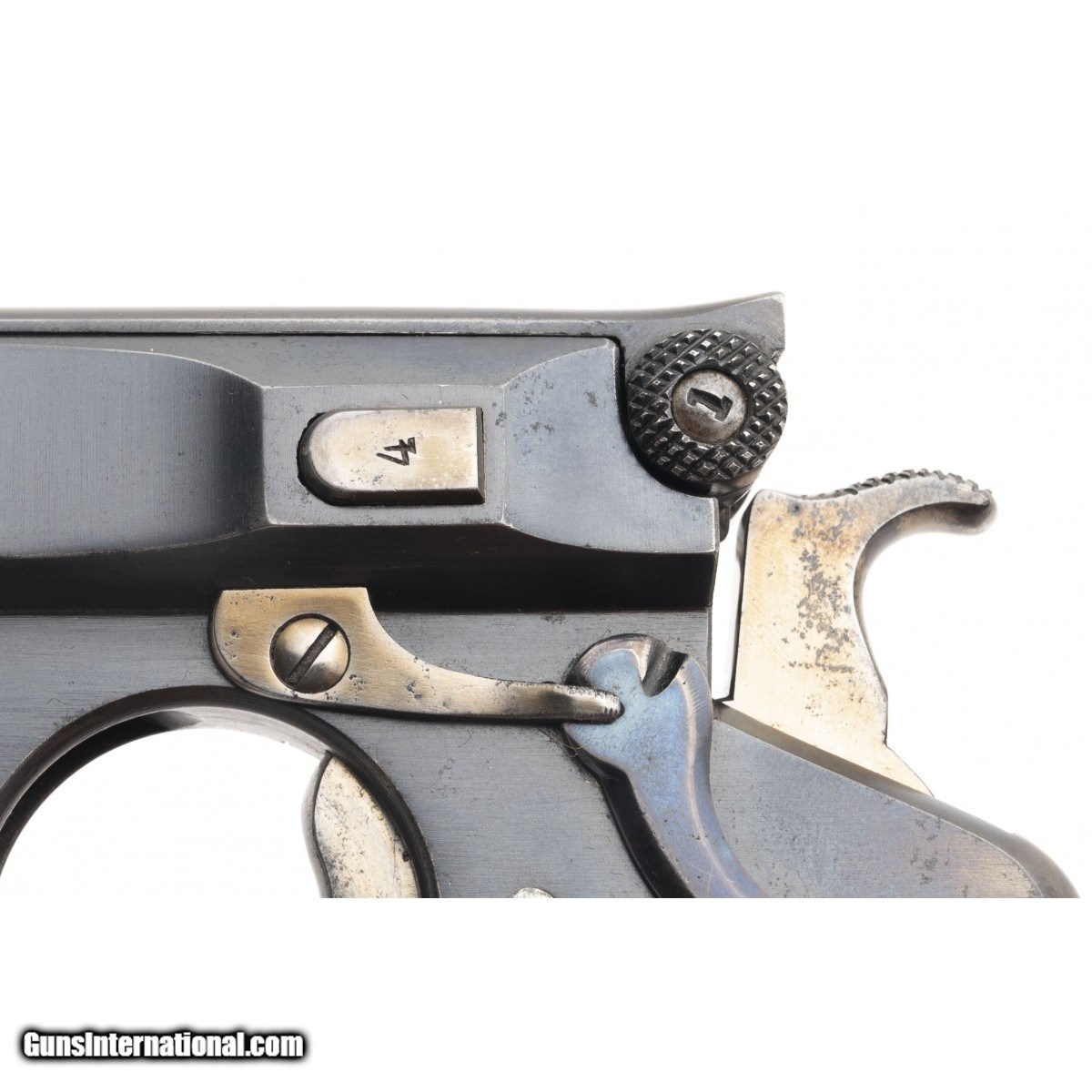 Bergmann pistol with 4.5"" barrel Bore is near excellent. Pistol has 98% original blue. Straw parts have excellent color grips are excellent with no wear! Excellent condition Bergmann.