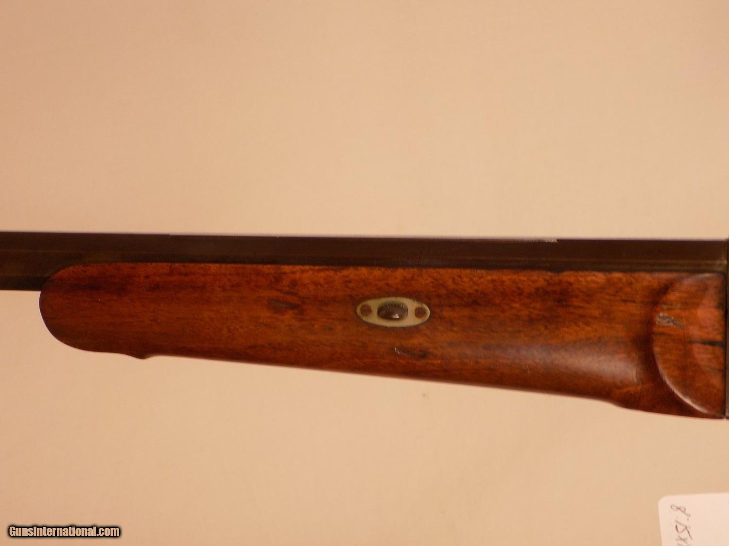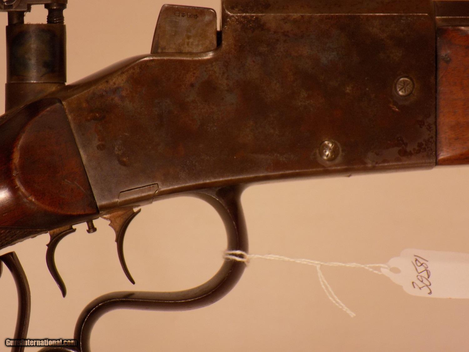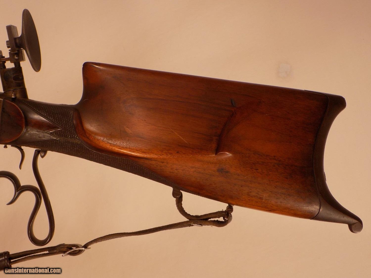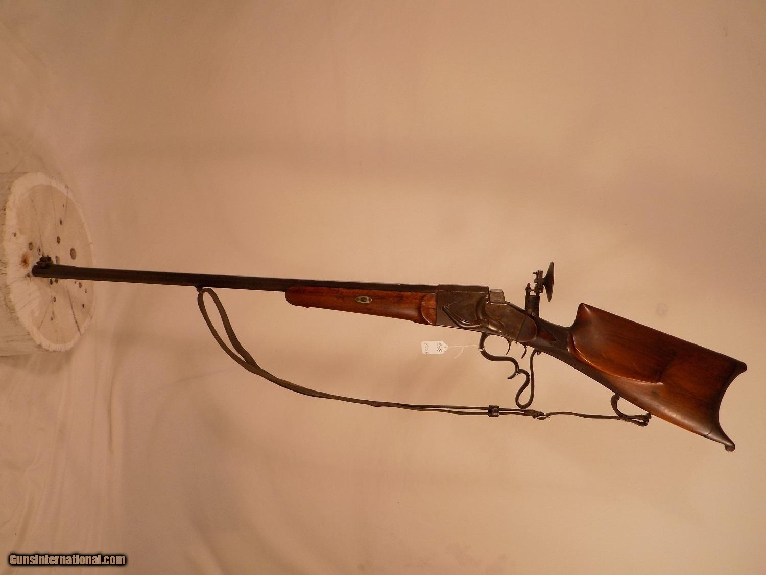 Description: C.G. HANEL SS GERMAN SCHUETZEN RIFLE, 8:15 X 46, 31" oct. bbl., Sch. checkered cheek rest stock, Sch. buttplate, DST, Sch. lever, original large eyepiece tang sight adj. for windage & elevation, ramp bead front sight with protective ears, original leather sling, exc. bore, casehardening colors are fading from receiver, bbl. blue turning brown. SOLD Antique: Yes |