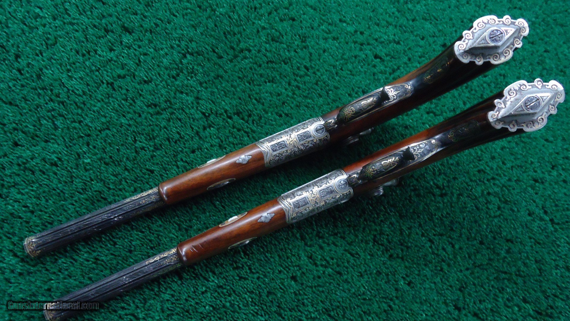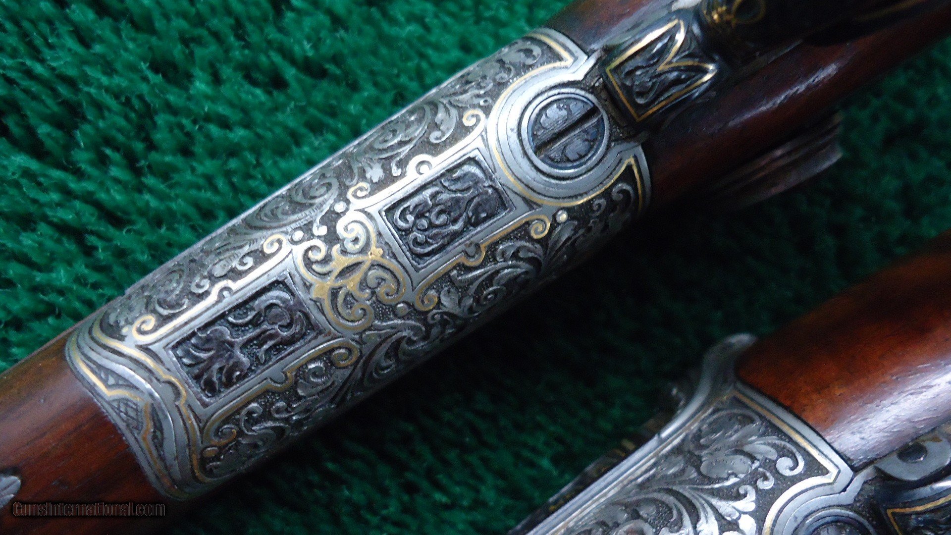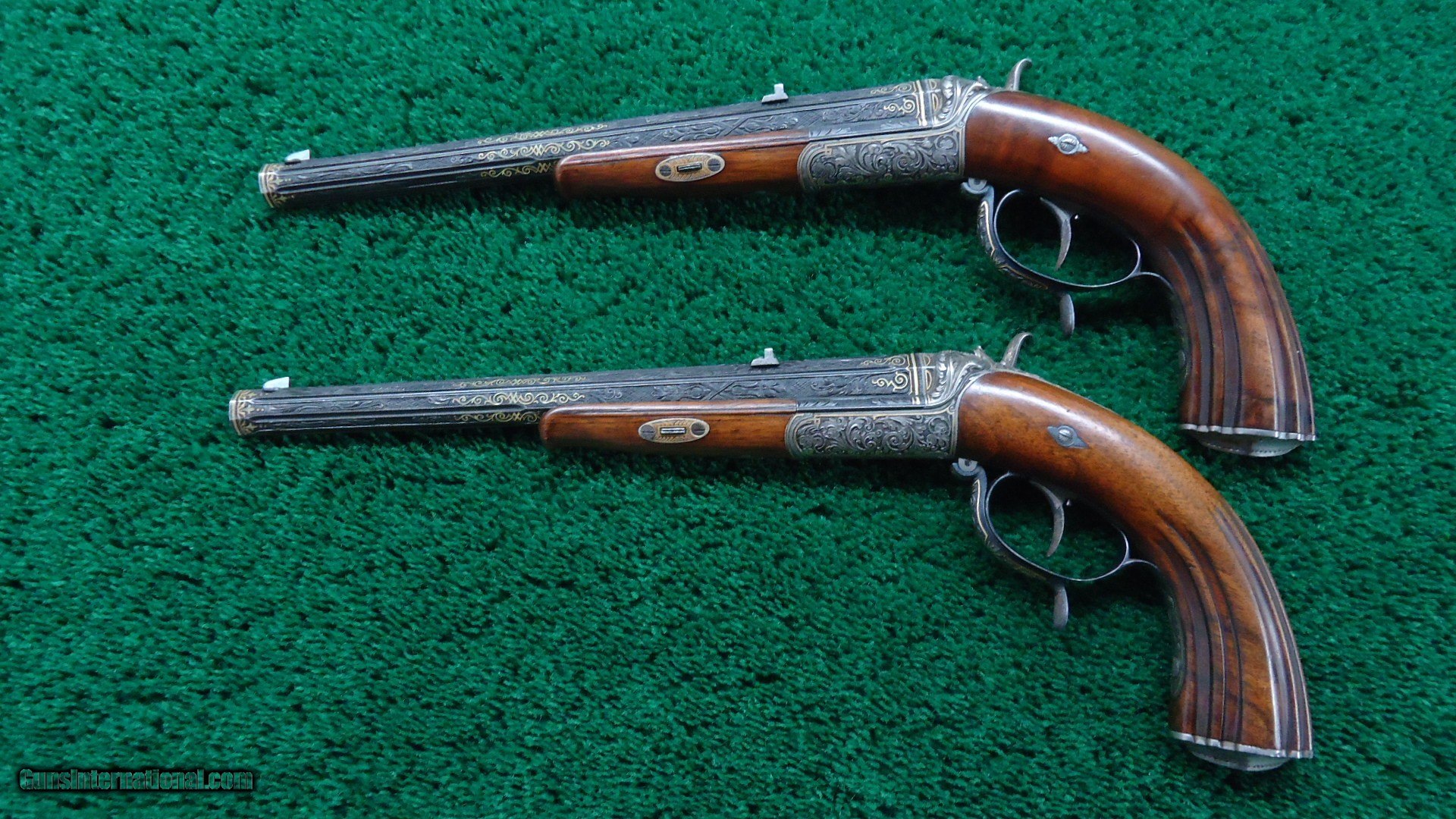 EXTRAORDINARY PAIR EXHIBITION GRADE RELIEF ENGRAVED GOLD INLAID TARGET PISTOLS