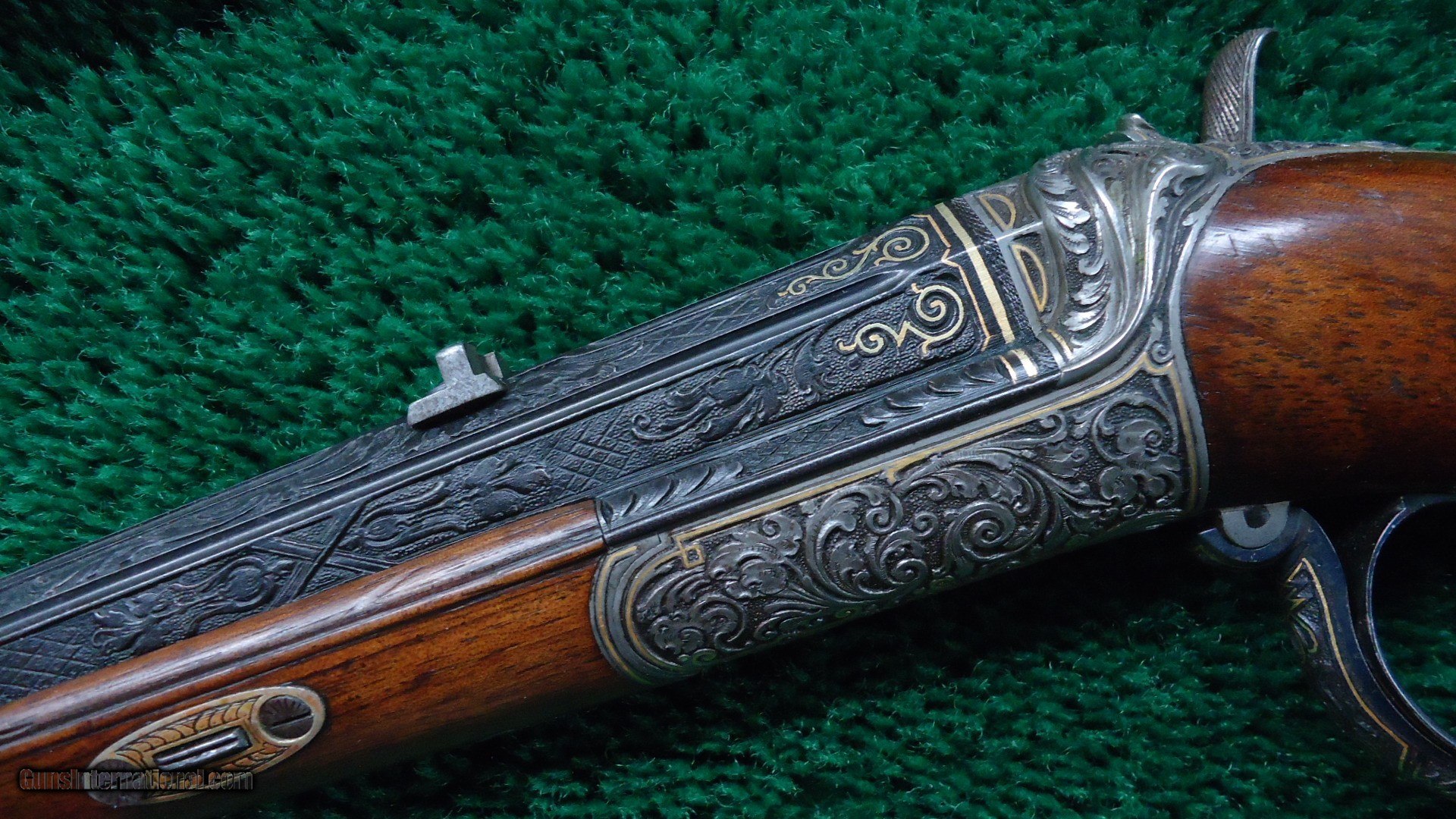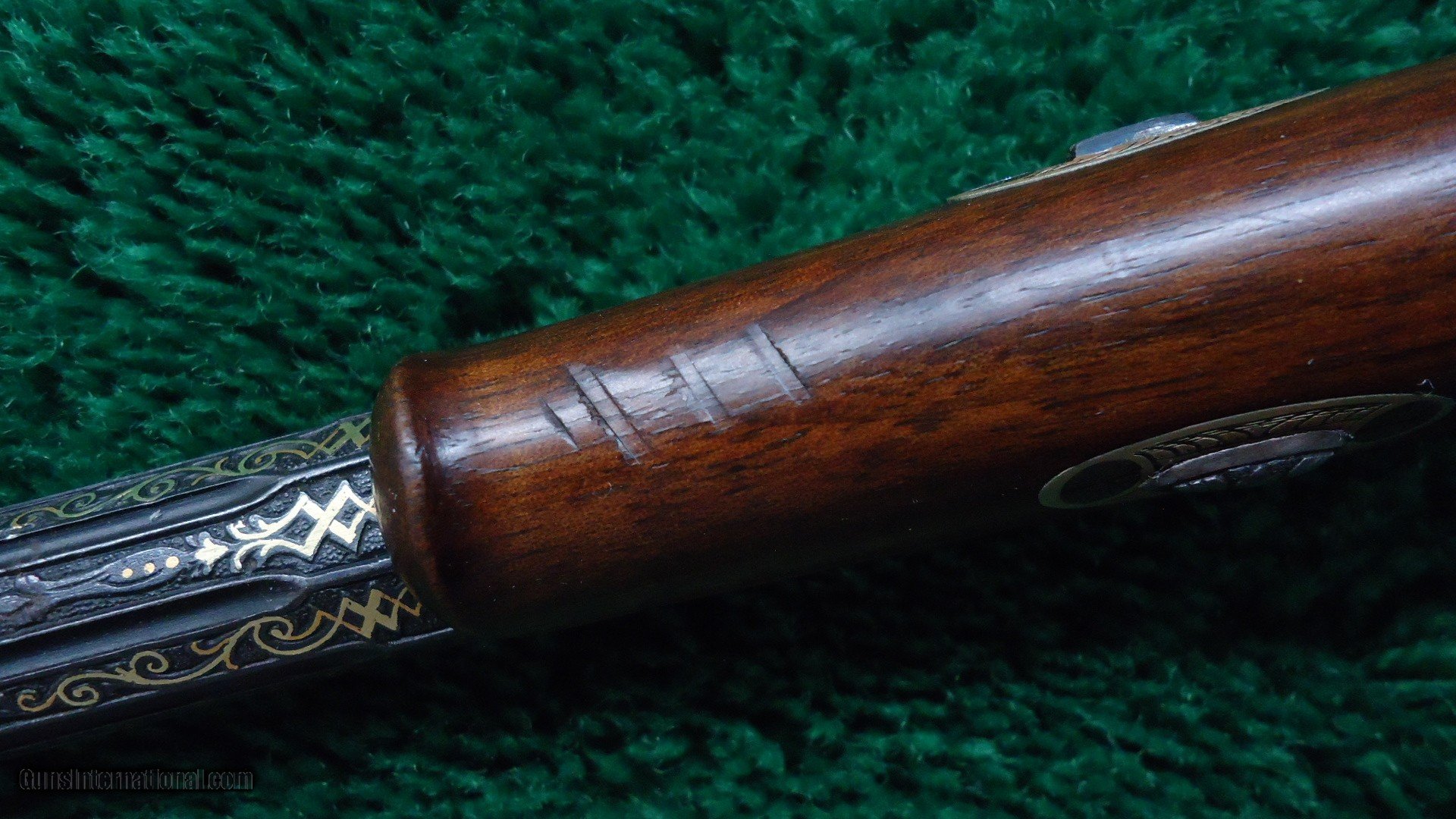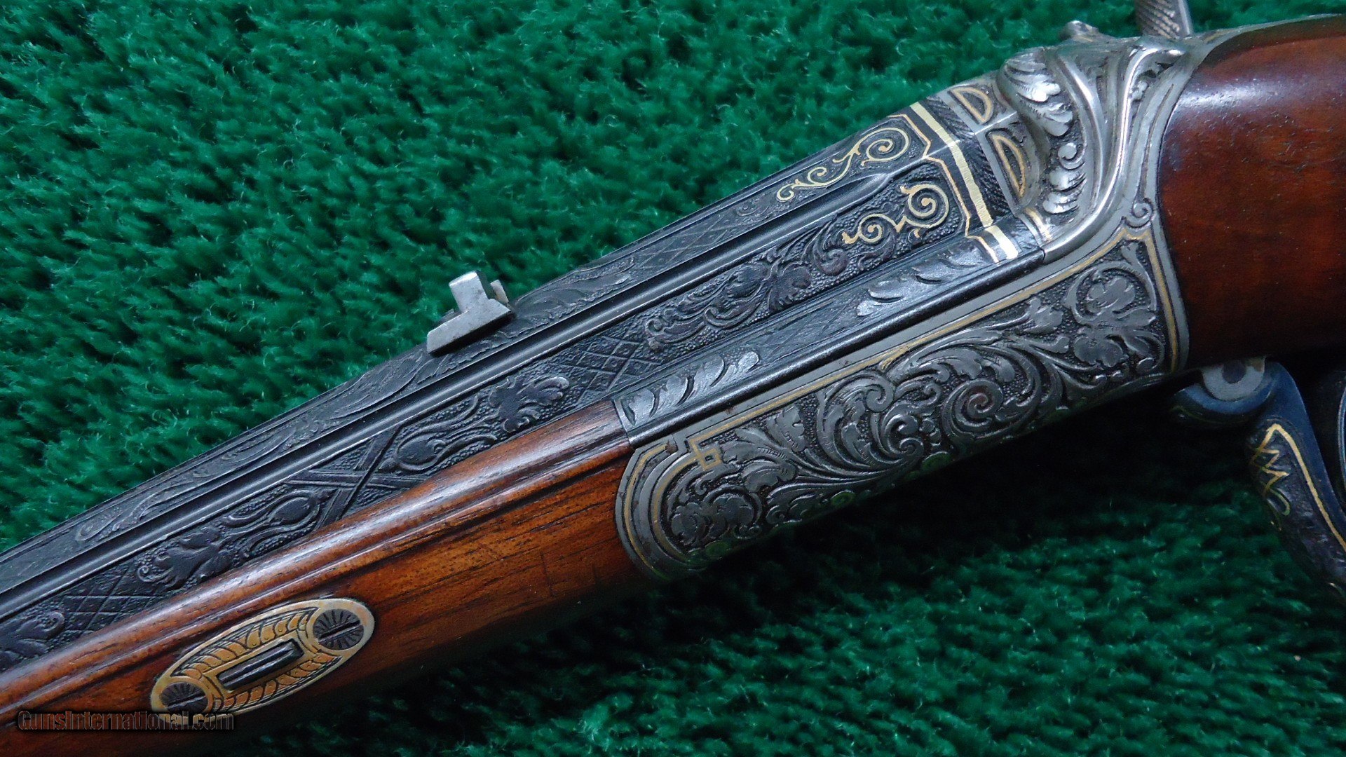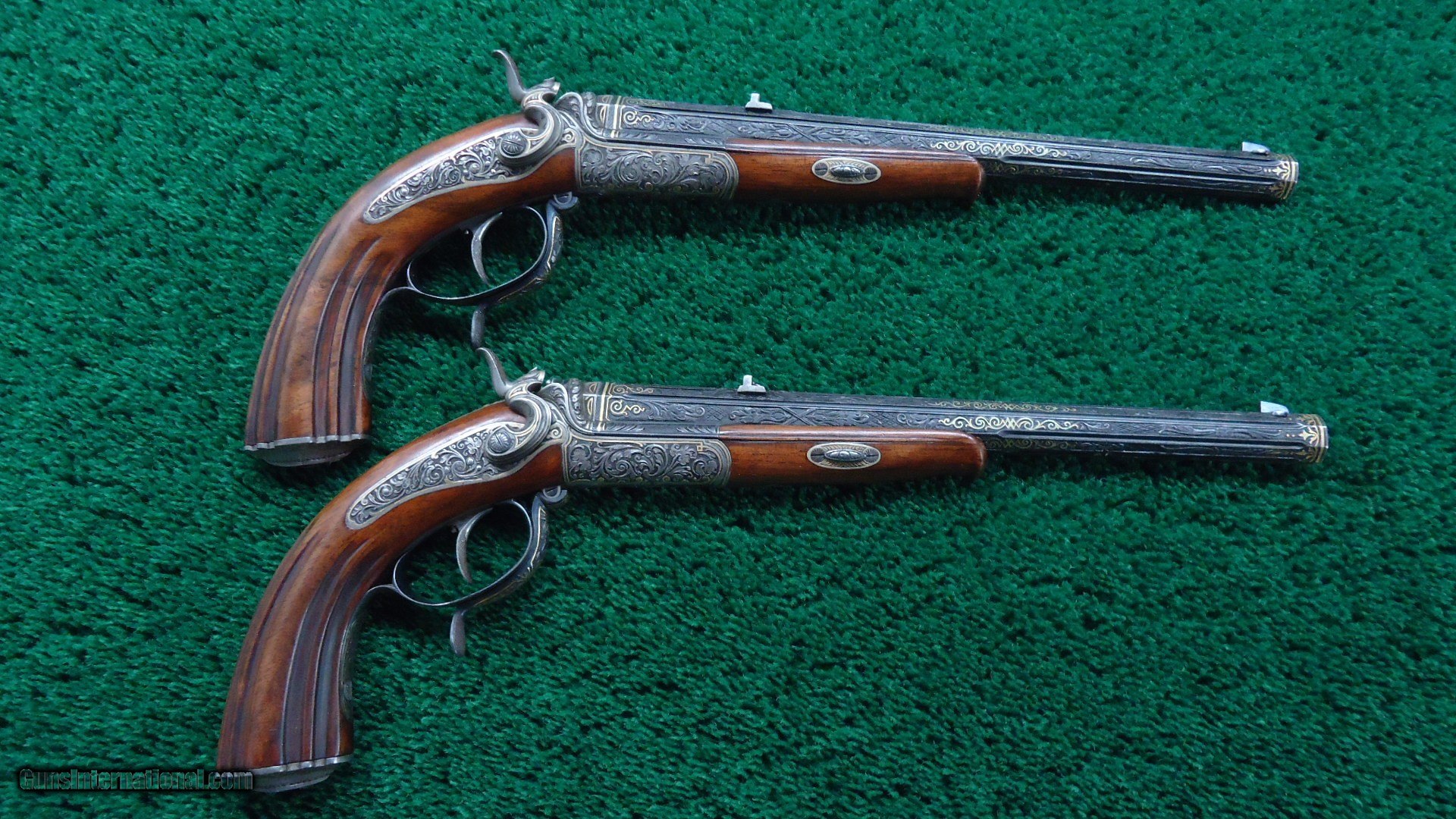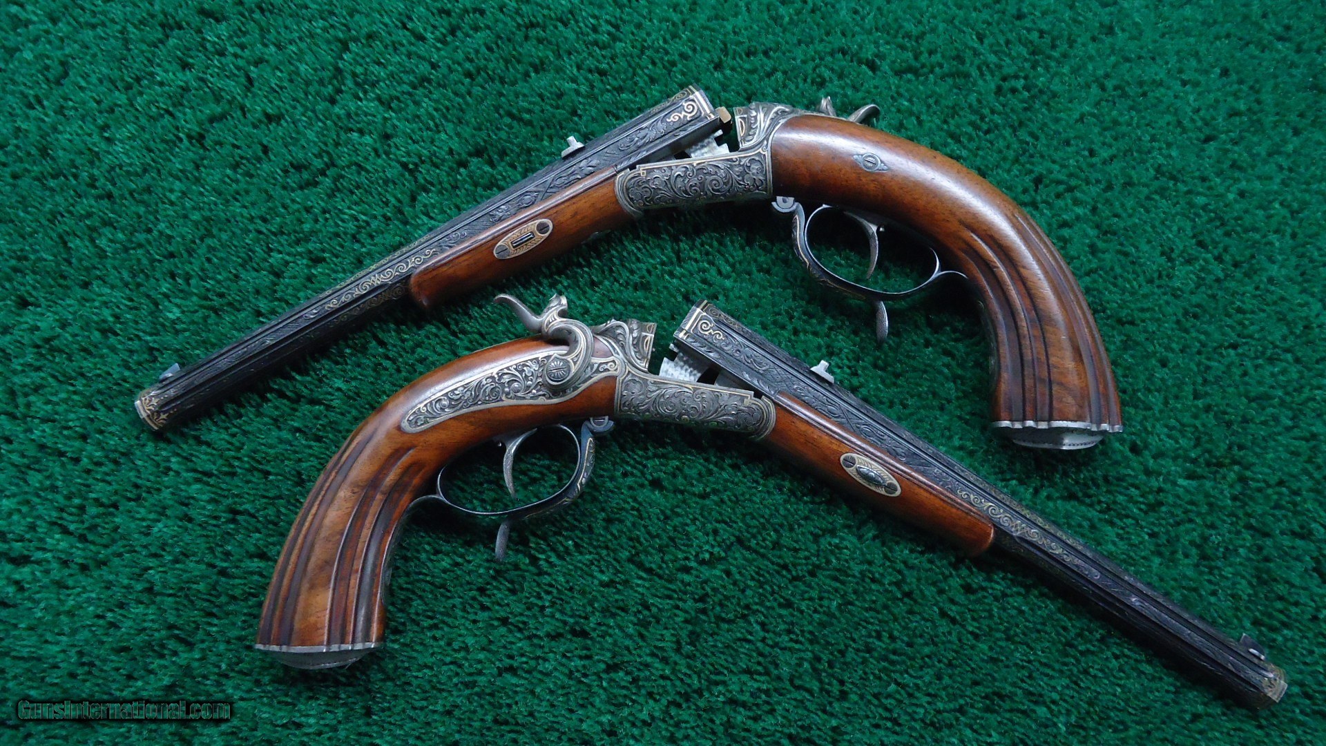 Description: The best I have ever seen. No room anywhere for any more scroll work or inlays. These are heavily embellished. They are both 8.5 mm with mint bores. Original sights. Underlever openers with side hammers. Both have set triggers. Excellent overall with 98% plus original finish and only limited handling and storage marks. Mechanically excellent. The pistols are set within a European walnut, French-fitted, velvet lined case that holds accoutrements and a cartridge block as well. These pistols are just sensational! Leroy Merz Antique Firearms specializes in antique and vintage Winchesters and other fine American firearms. Since 1965 Mr. Merz has taken part in the world of firearms and has been a contributor to many well known reference books. We have hundreds of additional guns in every price range at our home online. Search for Merz Antiques in google. SOLD Antique: Yes |