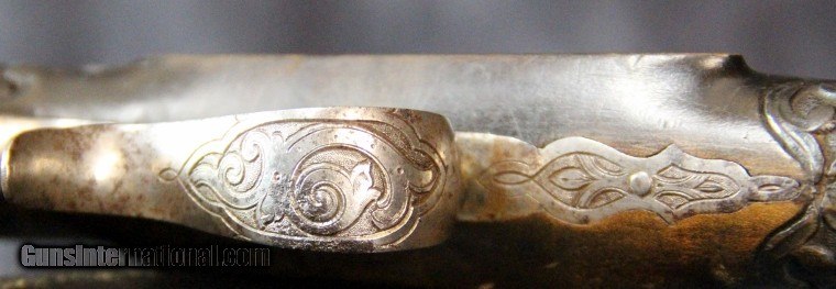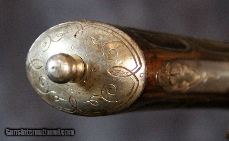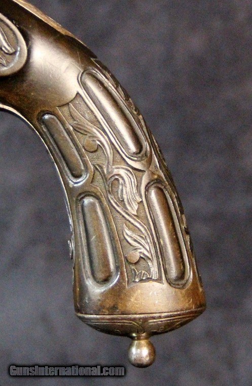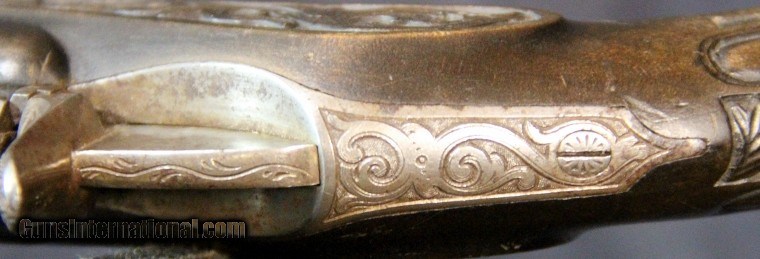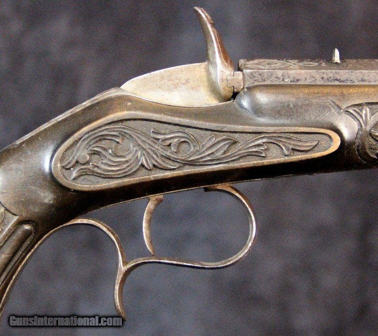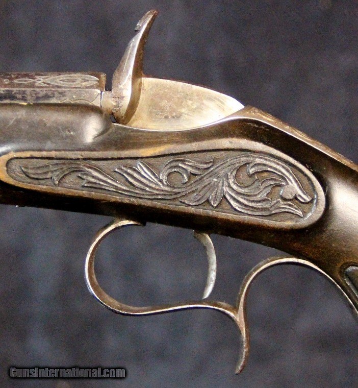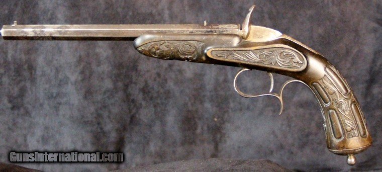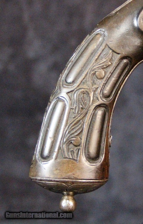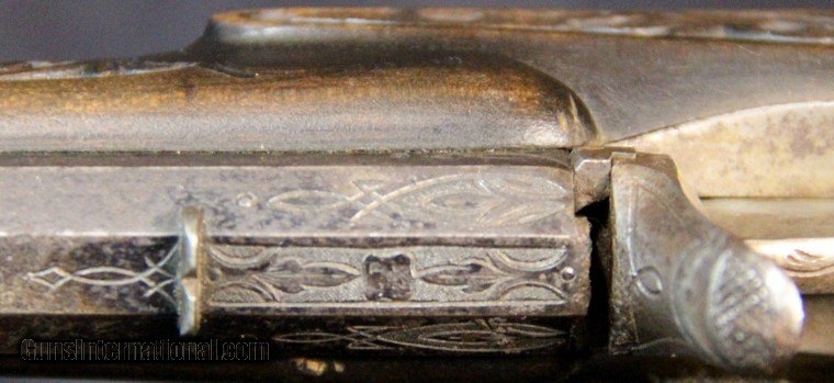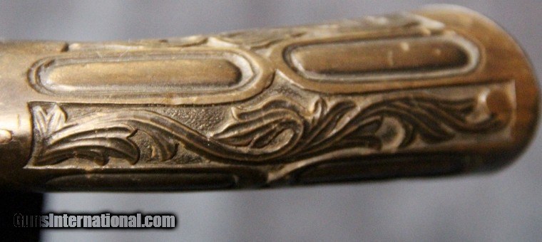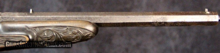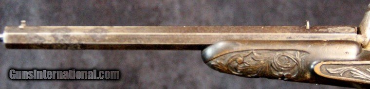 Description: .22rf, NVSN, 9 inch barrel, blue and silver finish, intricately carve stock, trigger guard/butt cap/top tang engraved and left silver, 1880's. Condition: smooth bore with oxidation, 60% barrel blue with several spots of "blood pitting", wood is excellent, excellent engraving, excellent mechanically. SOLD Antique: Yes |