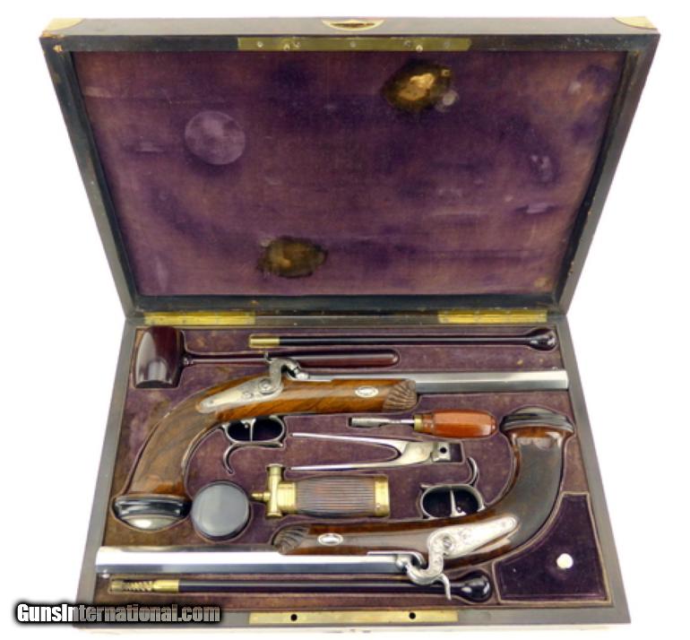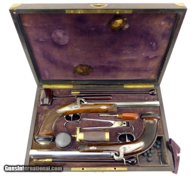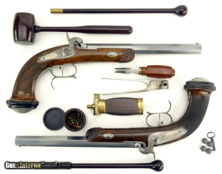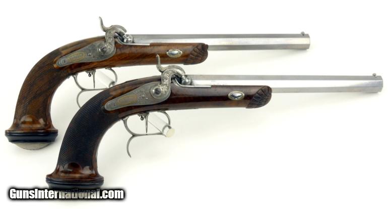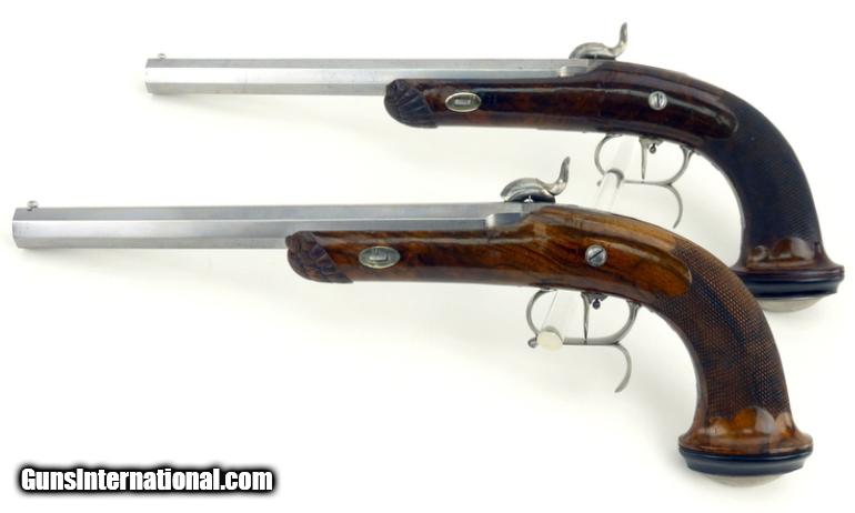 French Pair of Percussion target pistols cased with all accessories. Barrels are marked in gold ""Gautier a Paris"". Barrels are 9 1/2"" long and the guns are 15 1/2"" overall length. Metal parts are engraved with scrolls and very well done. Guns are finished bright with gold lettering. Stocks are beautifully shell carved at the forend and checkered with scalloped borders on the pistol grip. Buttcaps are engraved with steel ovals with a feather or tree frond in the center and then inset into an ebony base. Case is finished in a burl veneer with some repairs to the veneer on the left side of the lid. Lid has a lifting handle.
