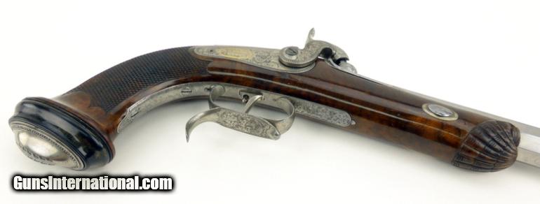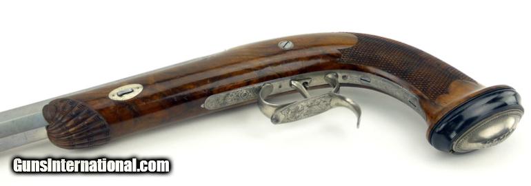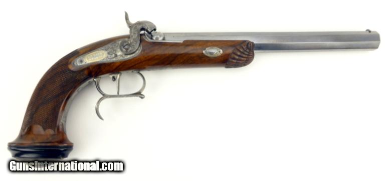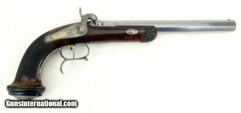 Description: French Pair of Percussion target pistols cased with all accessories. Barrels are marked in gold ""Gautier a Paris"". Barrels are 9 1/2"" long and the guns are 15 1/2"" overall length. Metal parts are engraved with scrolls and very well done. Guns are finished bright with gold lettering. Stocks are beautifully shell carved at the forend and checkered with scalloped borders on the pistol grip. Buttcaps are engraved with steel ovals with a feather or tree frond in the center and then inset into an ebony base. Case is finished in a burl veneer with some repairs to the veneer on the left side of the lid. Lid has a lifting handle. SOLD Antique: Yes |